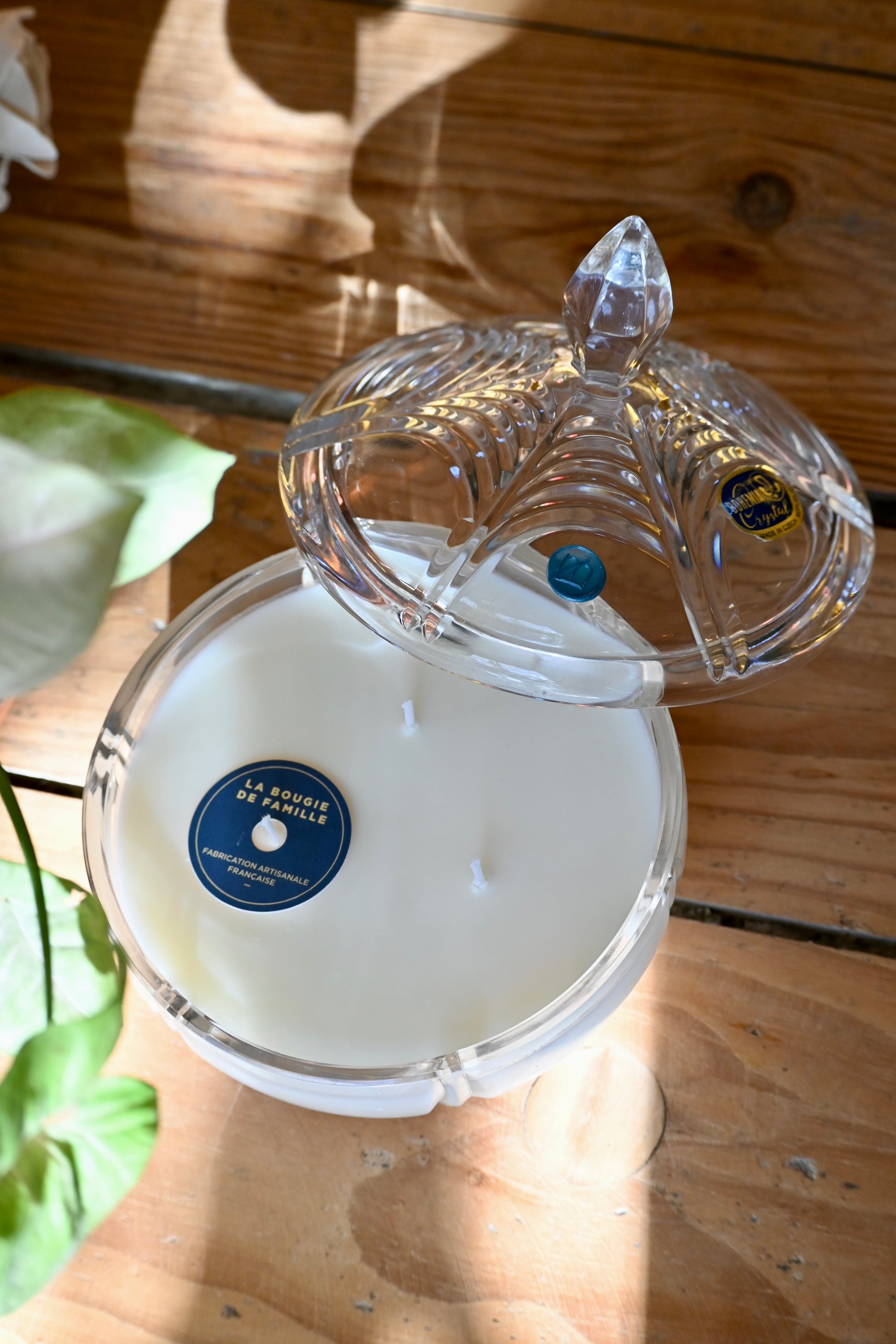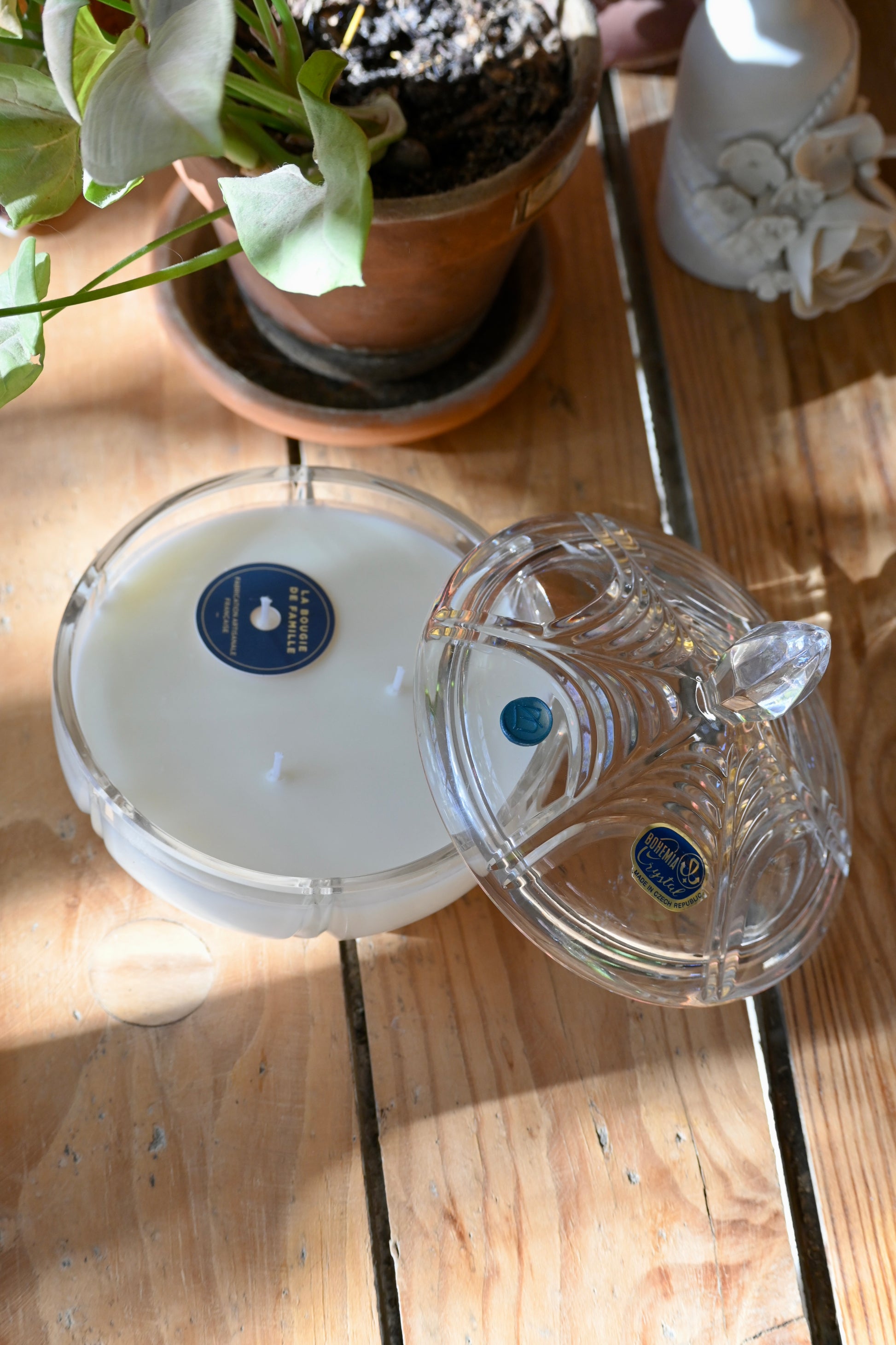 Bougie coulée dans une superbe boite en cristal de bohème. Cette jolie boite pourra accueillir vos bijoux une fois consumée.