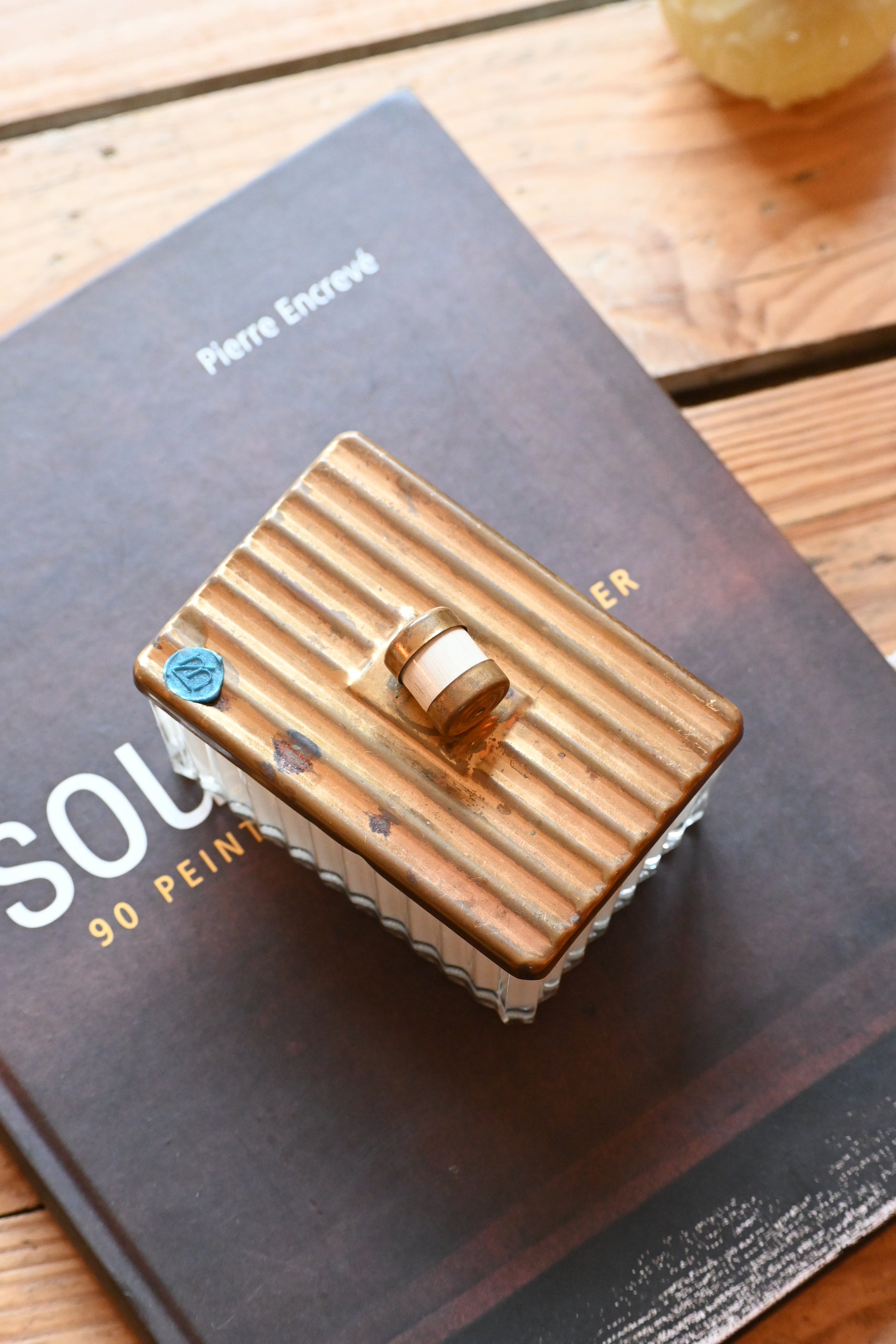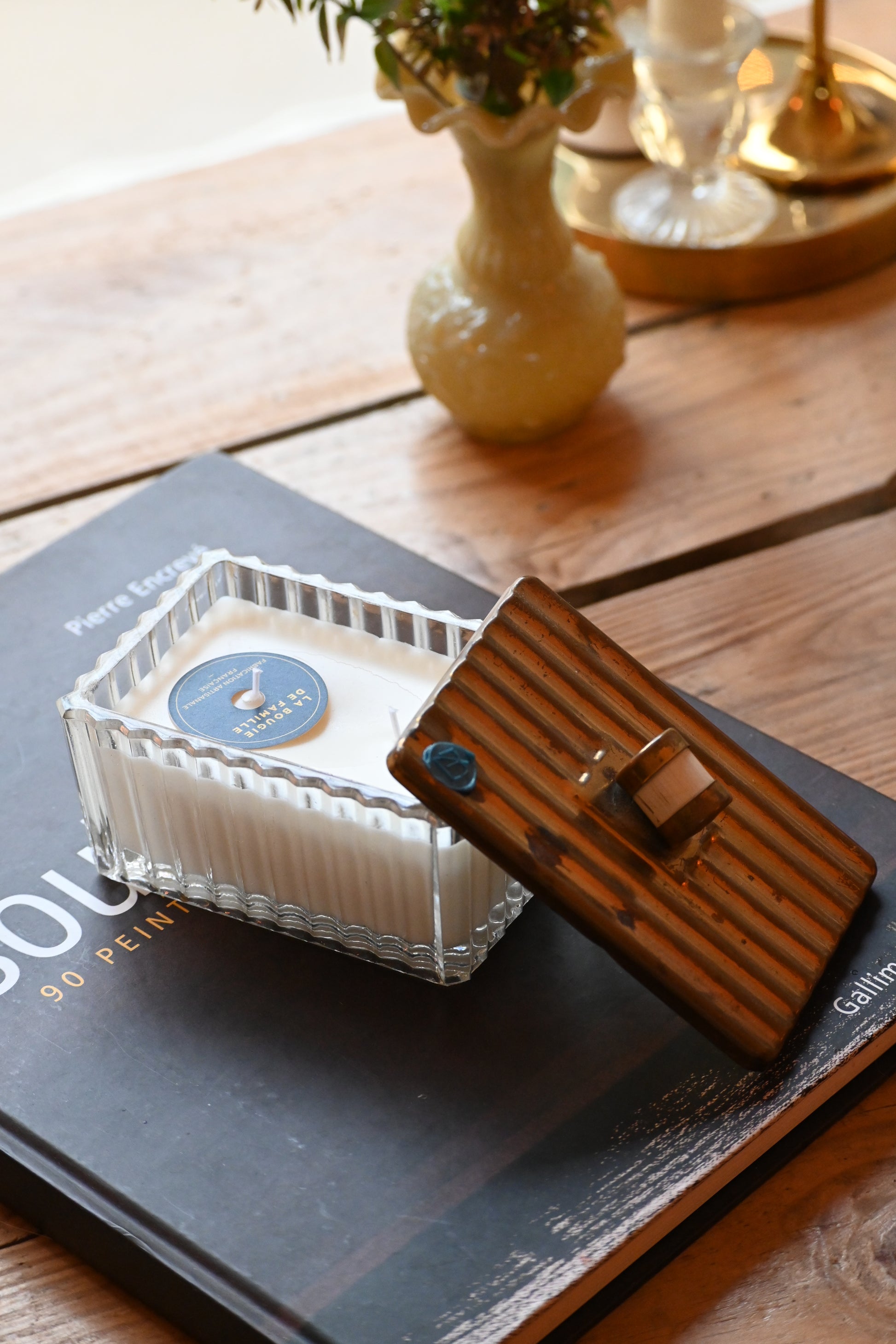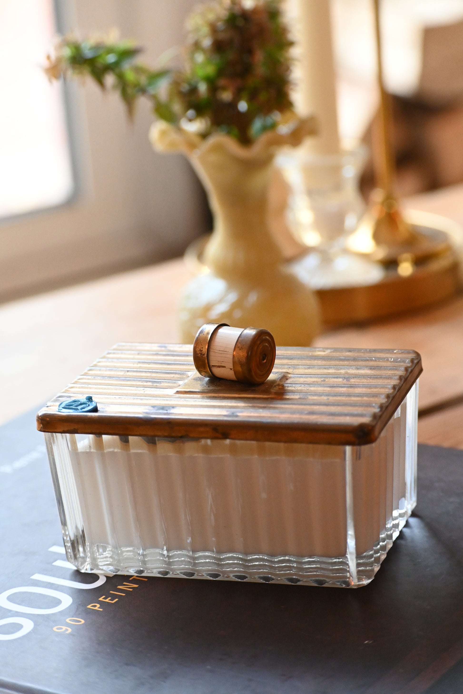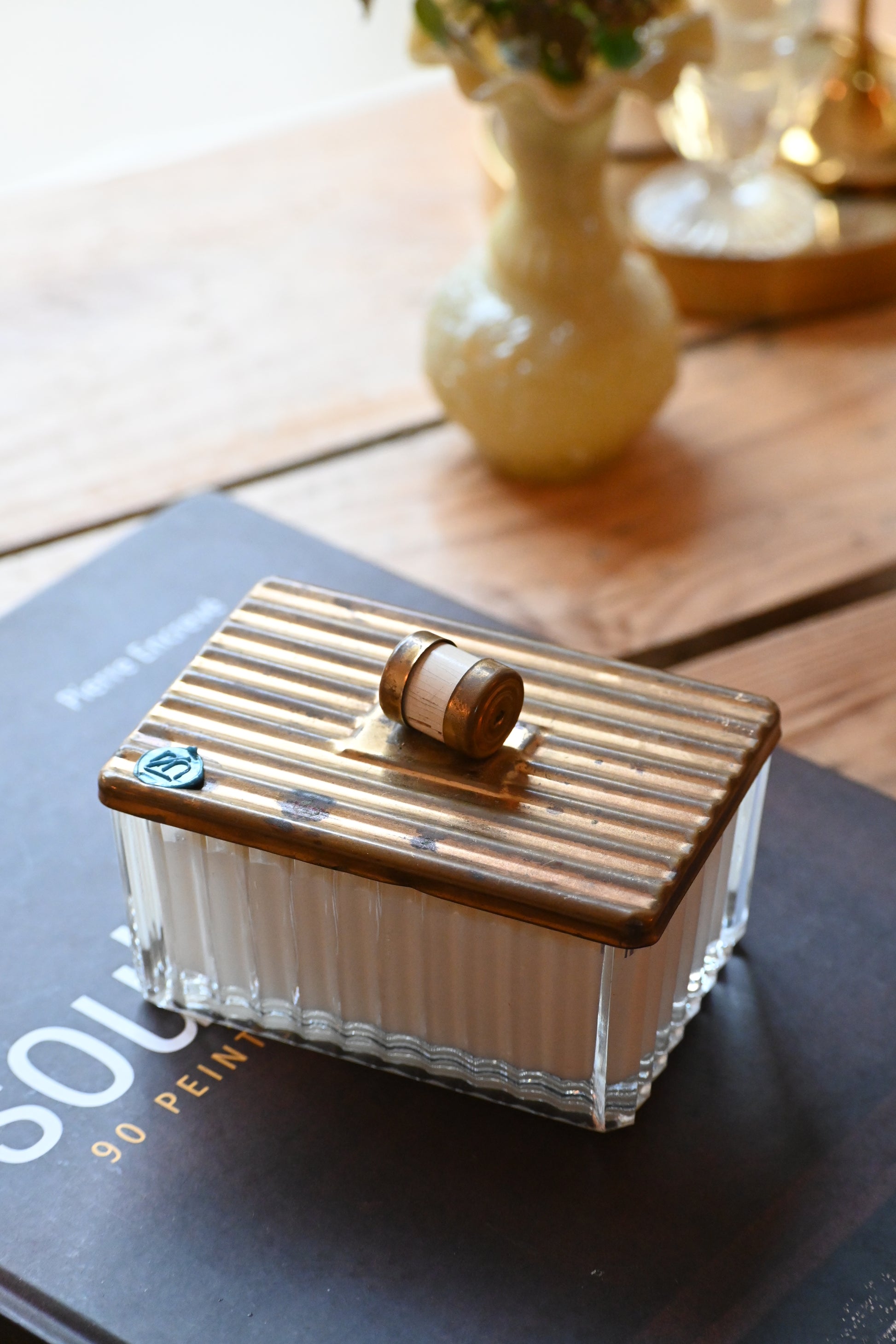 Bougie coulée dans une boite en verre délicatement ciselée de style art déco. Cette jolie boite pourra accueillir vos bijoux une fois consumée ou rejoindre votre déco.