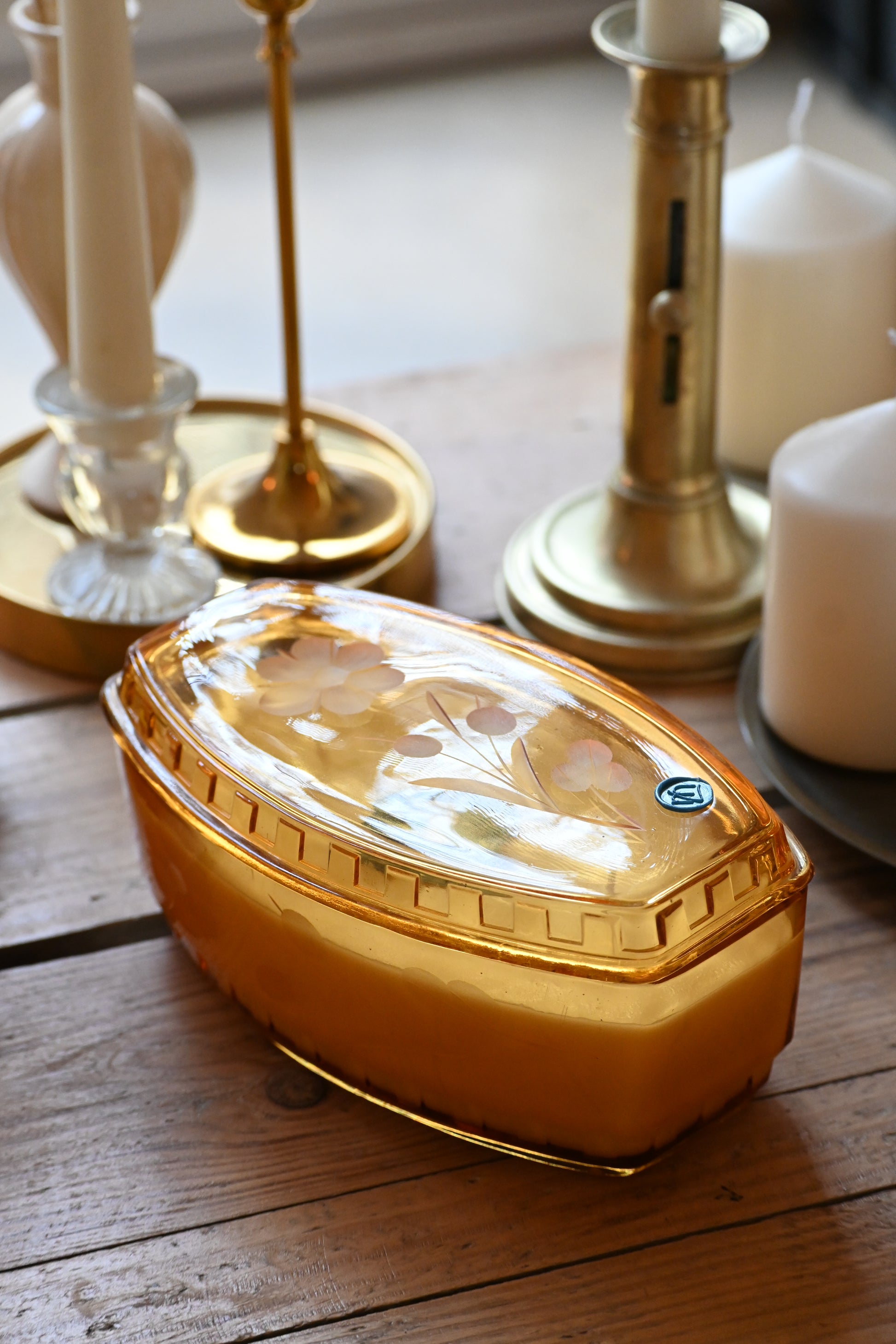 Bougie coulée dans une boite en verre délicatement ciselée de style art déco. Cette jolie boite pourra accueillir vos bijoux une fois consumée ou rejoindre votre déco.