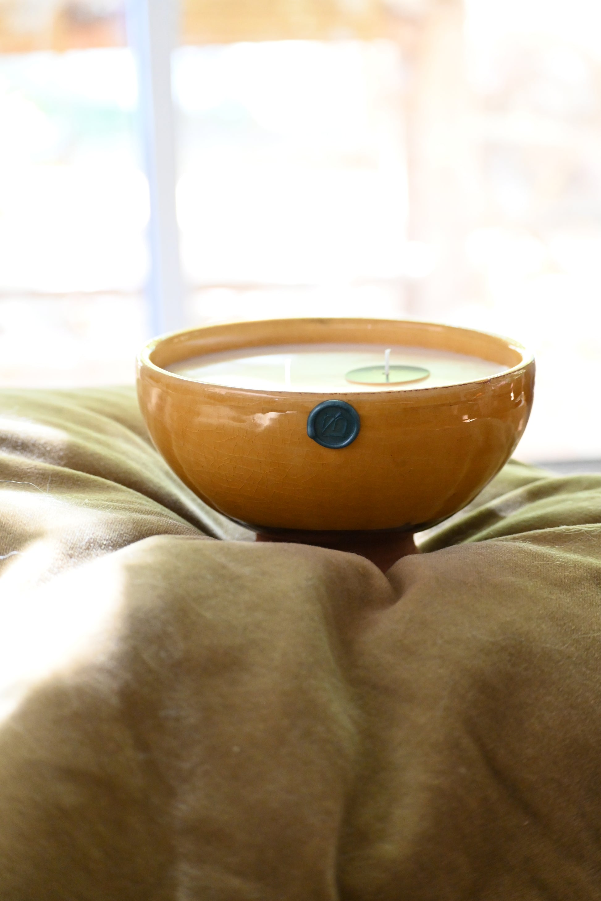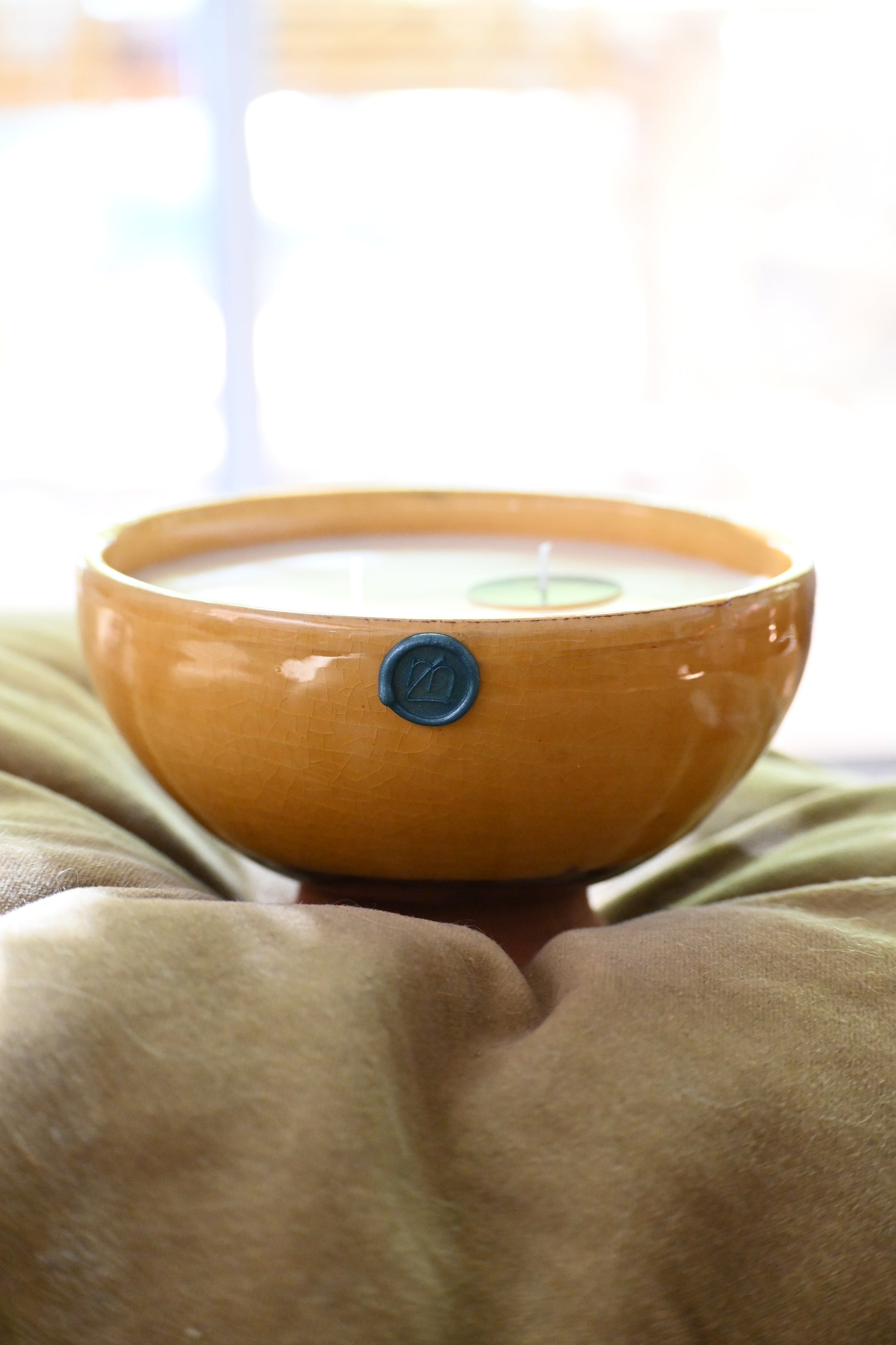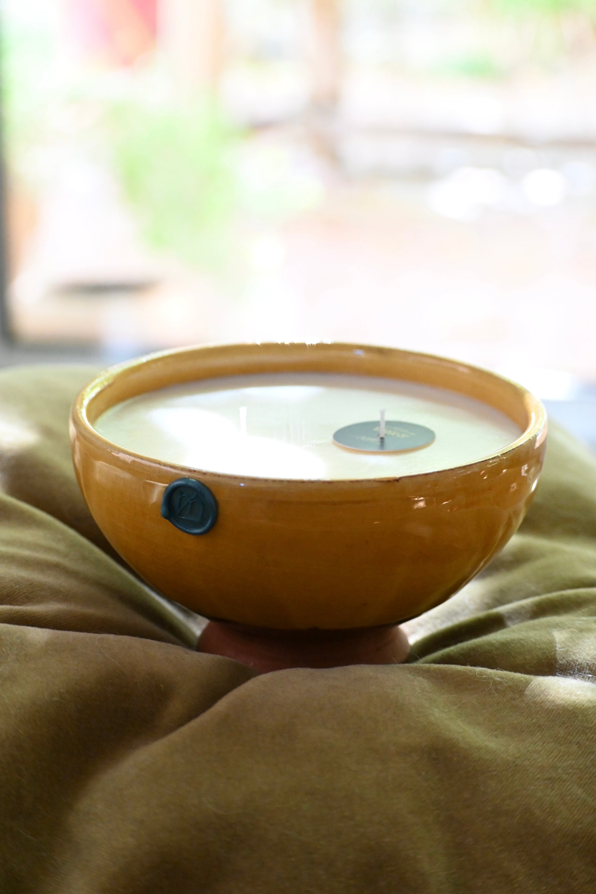 Bougie coulée dans un bol en argile émaillé de couleur jaune.