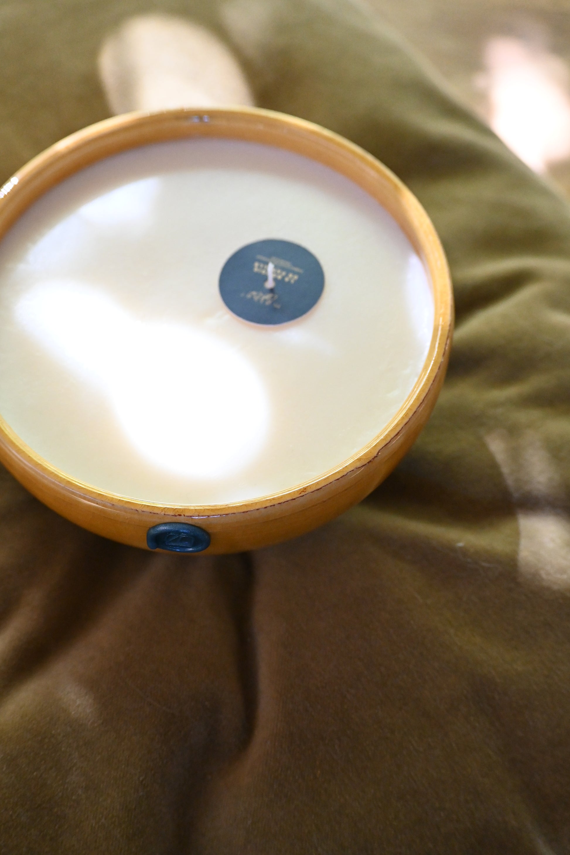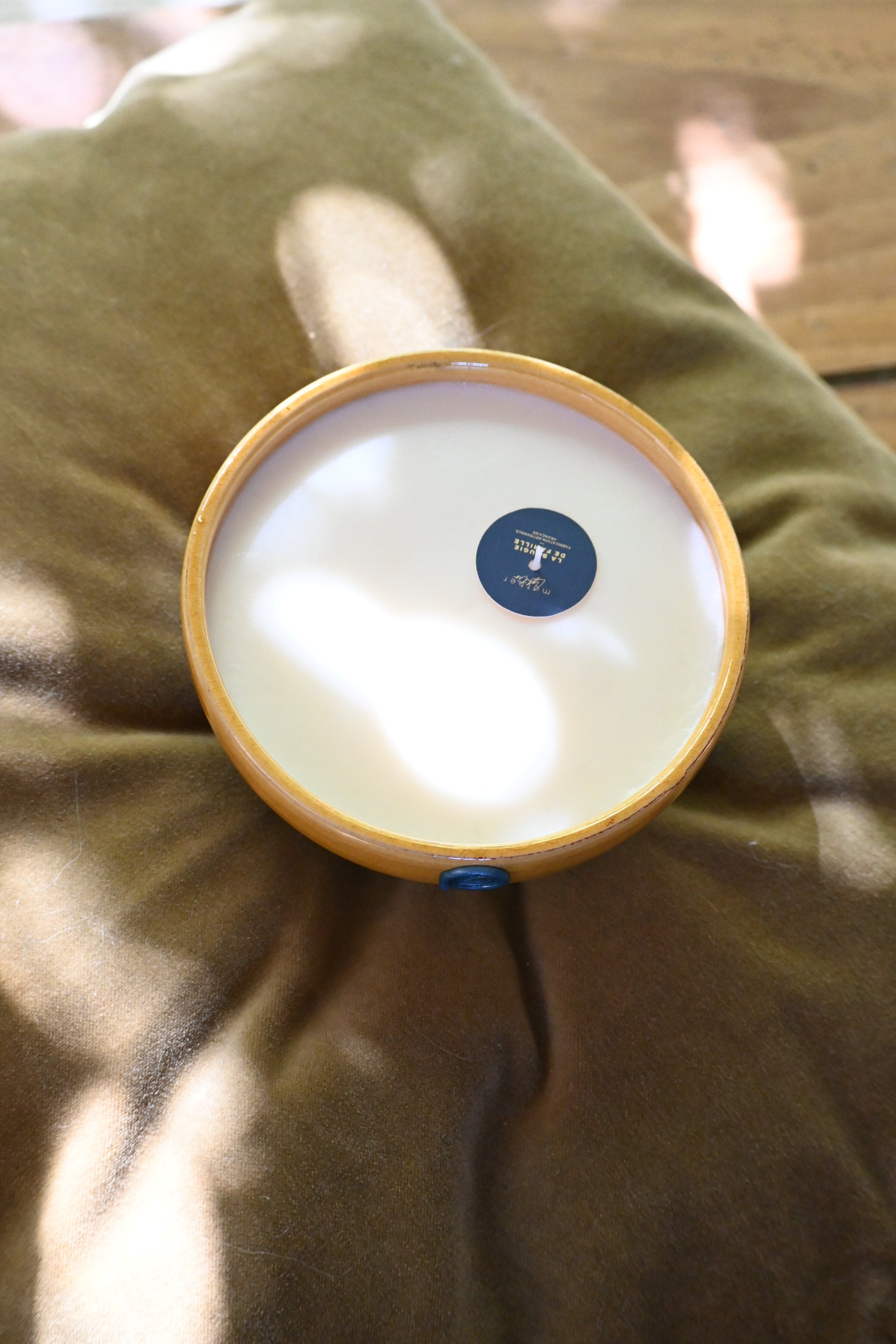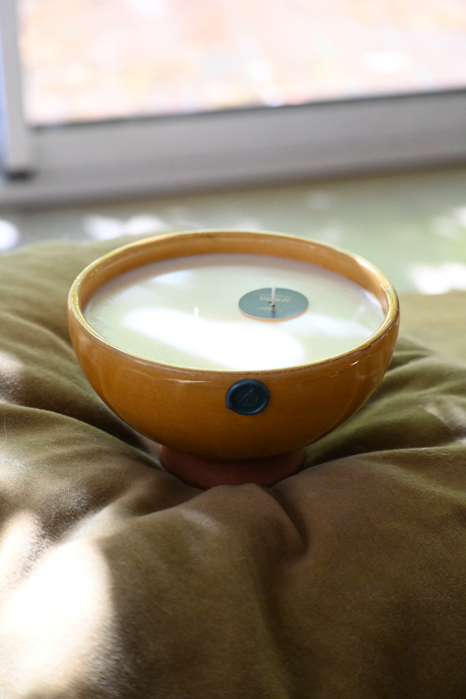 Bougie coulée dans un bol en argile émaillé de couleur jaune.