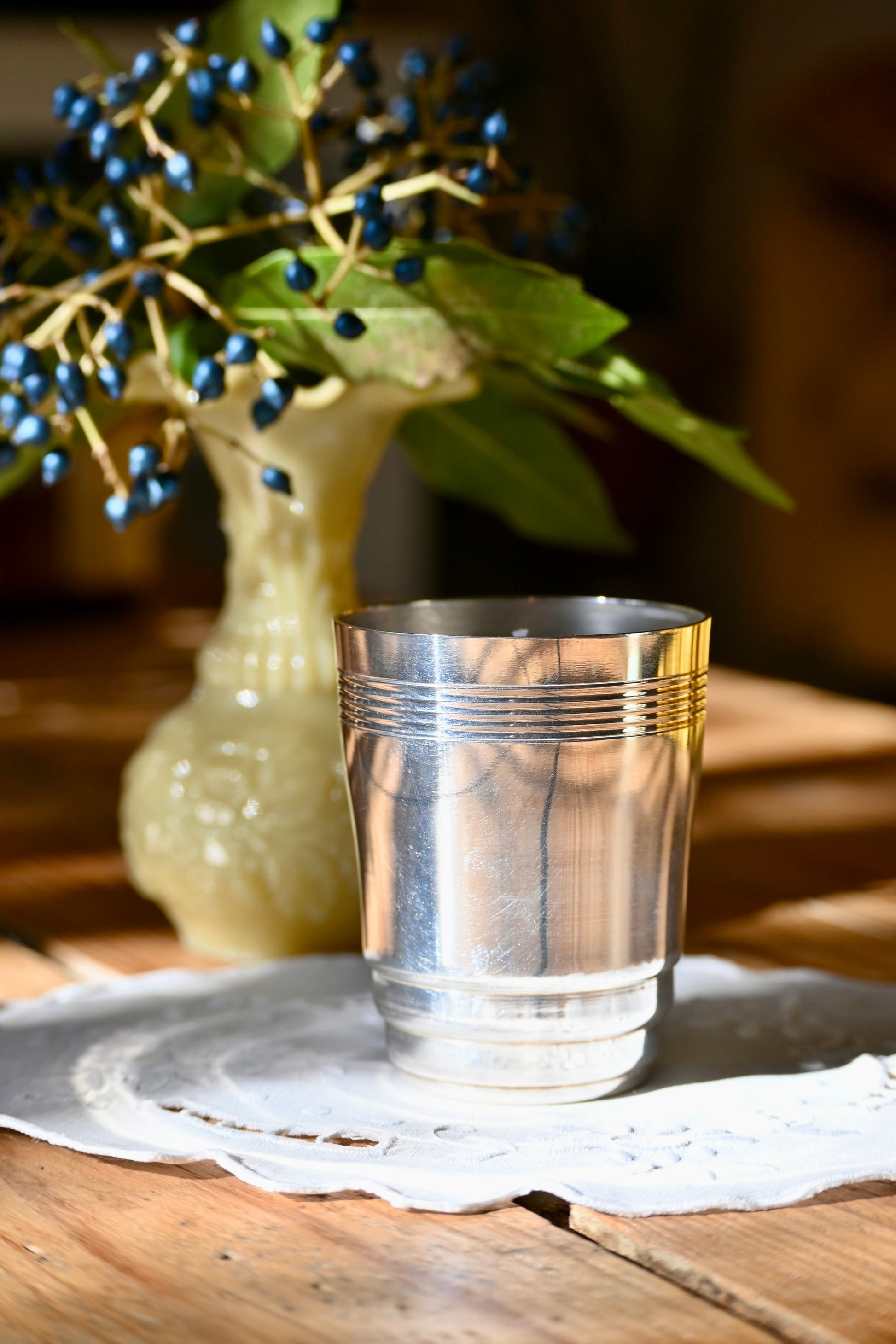 Bougie coulée dans une timbale en métal argenté dans son joli coffret bleu ciel et son rond de serviette. Souvenirs de présents de l'enfance. Un cadeau idéal pour une naissance à venir.
