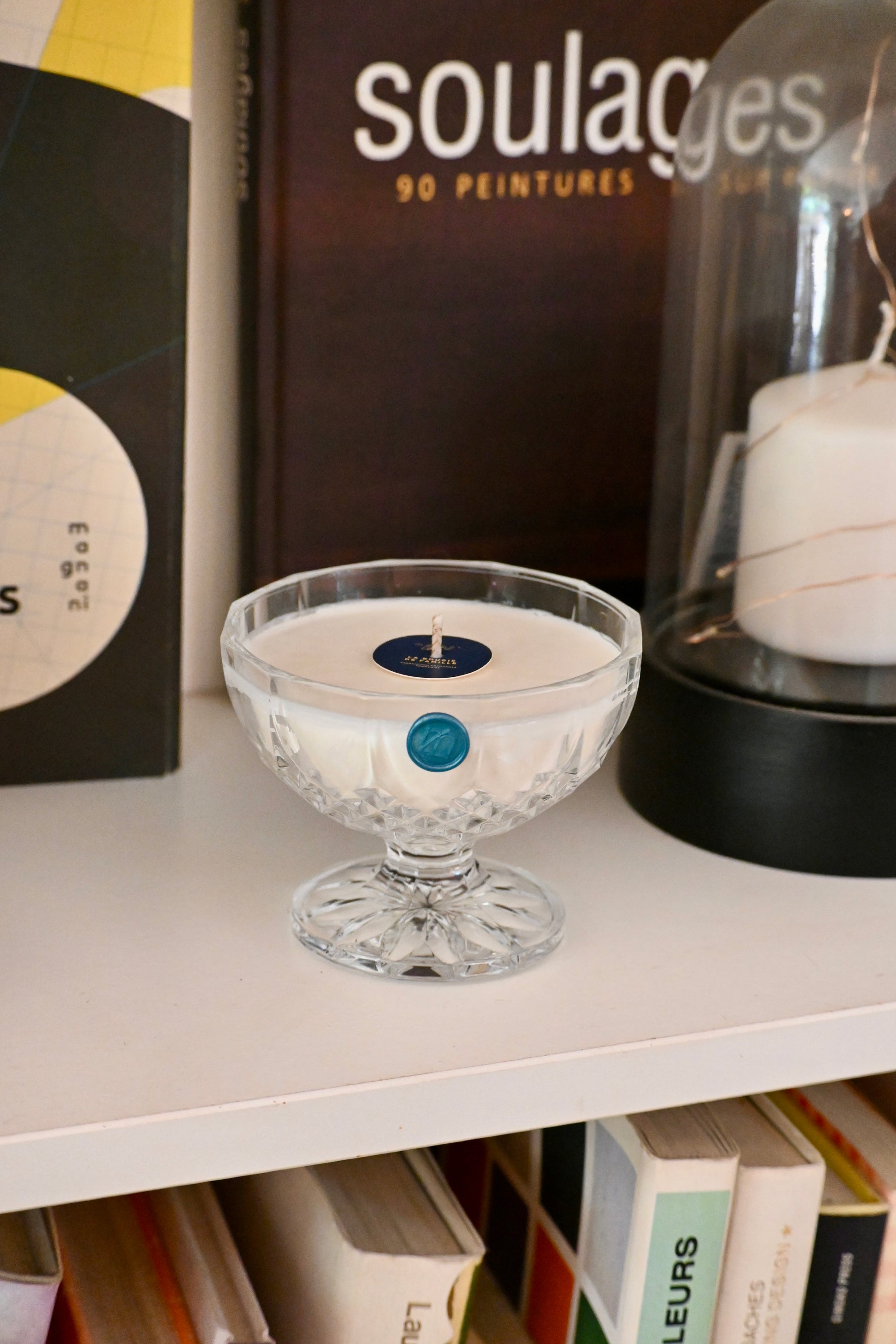 Bougie coulée dans une coupé ciselée. Une fois consumée, ce joli contenant pourra être réutilisé pour servir vos convives.