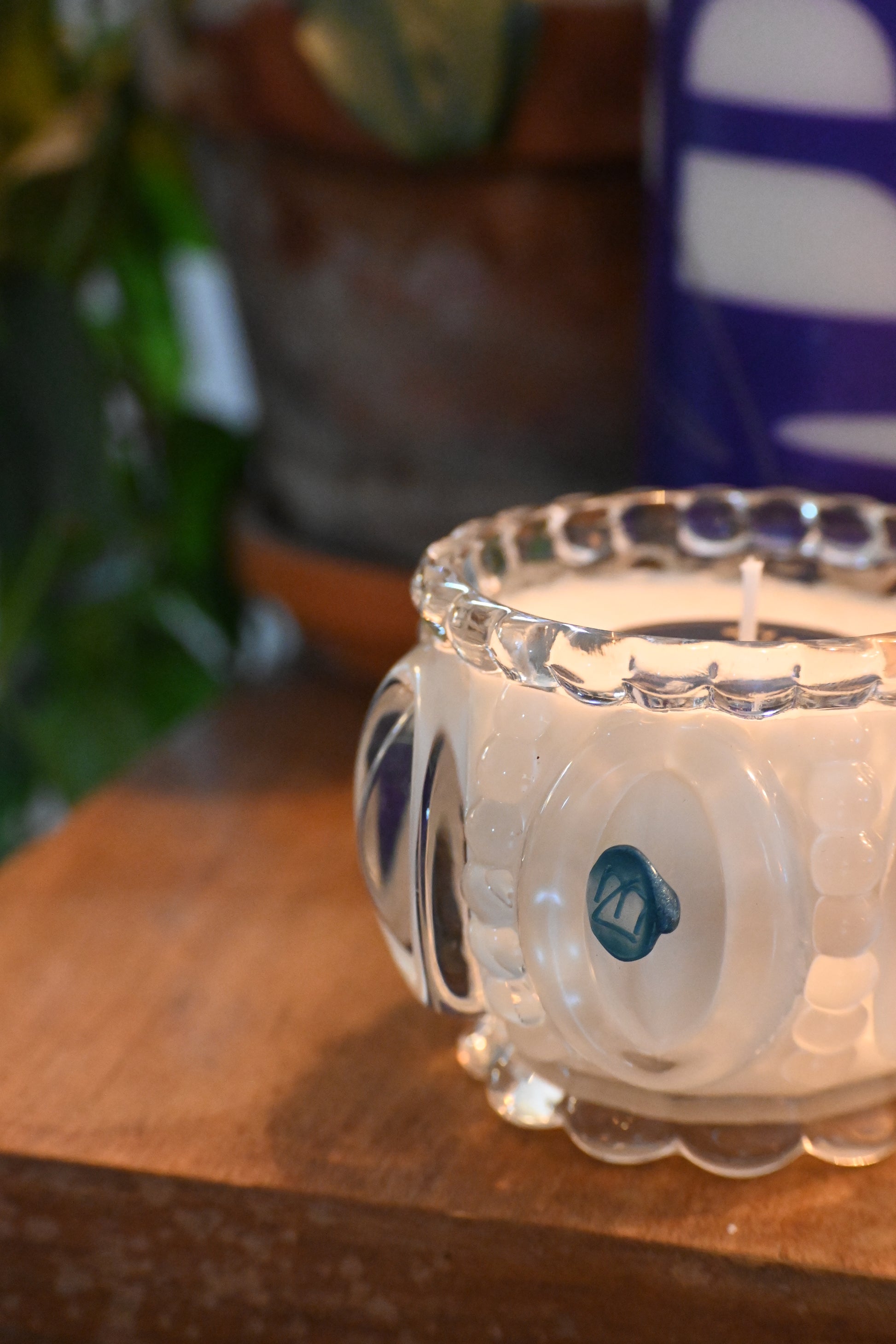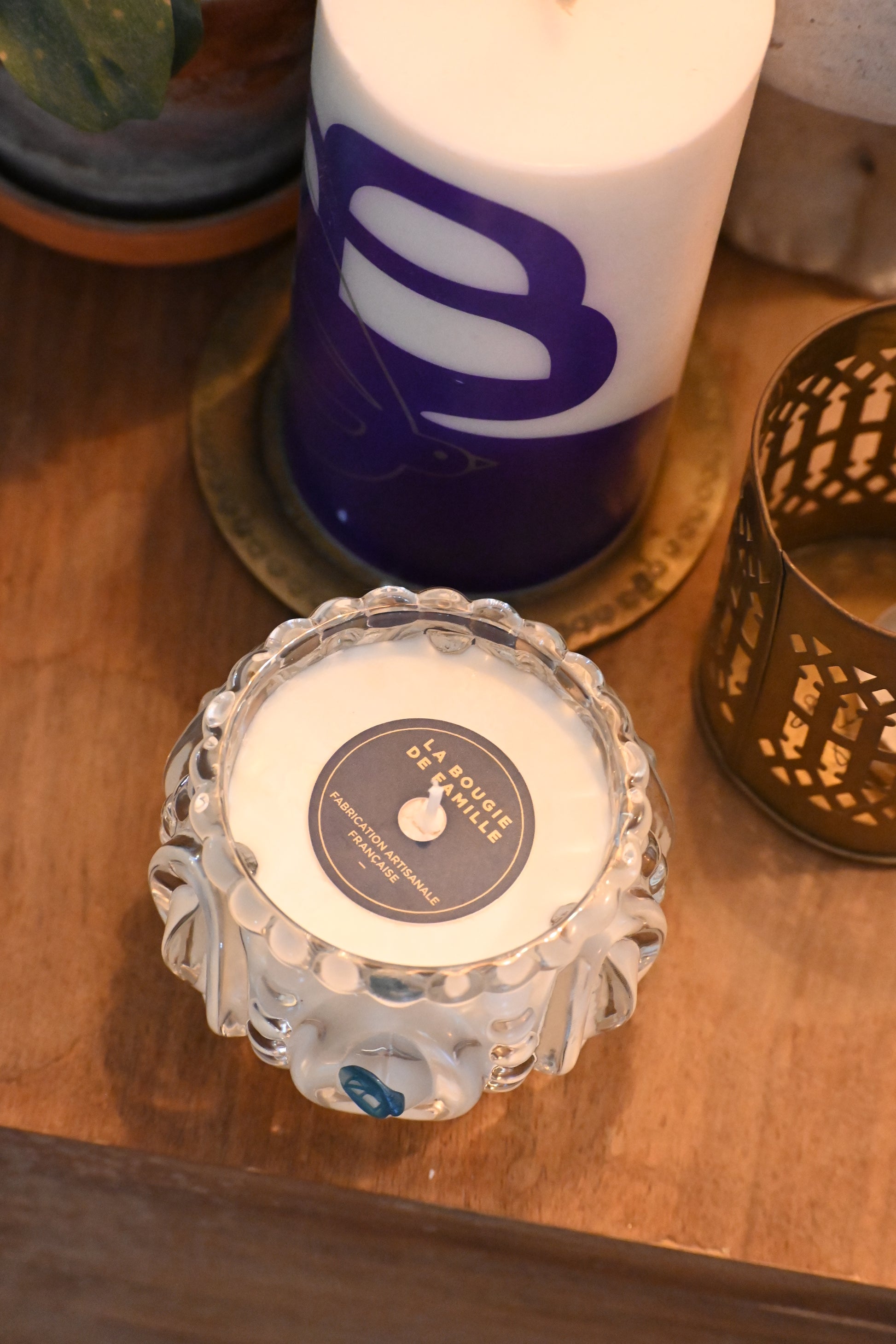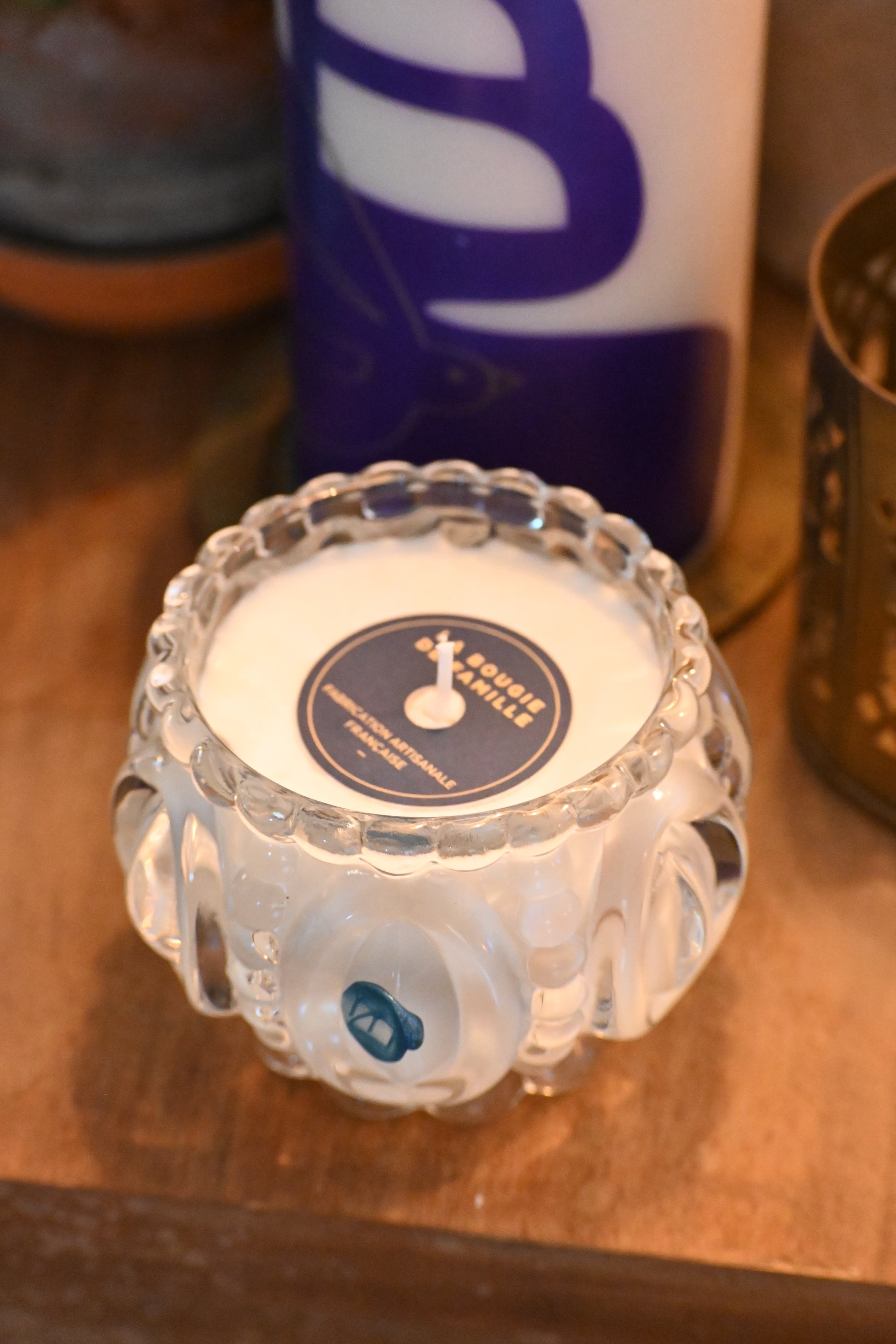 Bougie coulée dans une coupe en verre délicatement gravé. Il fera un joli photophore ensuite.