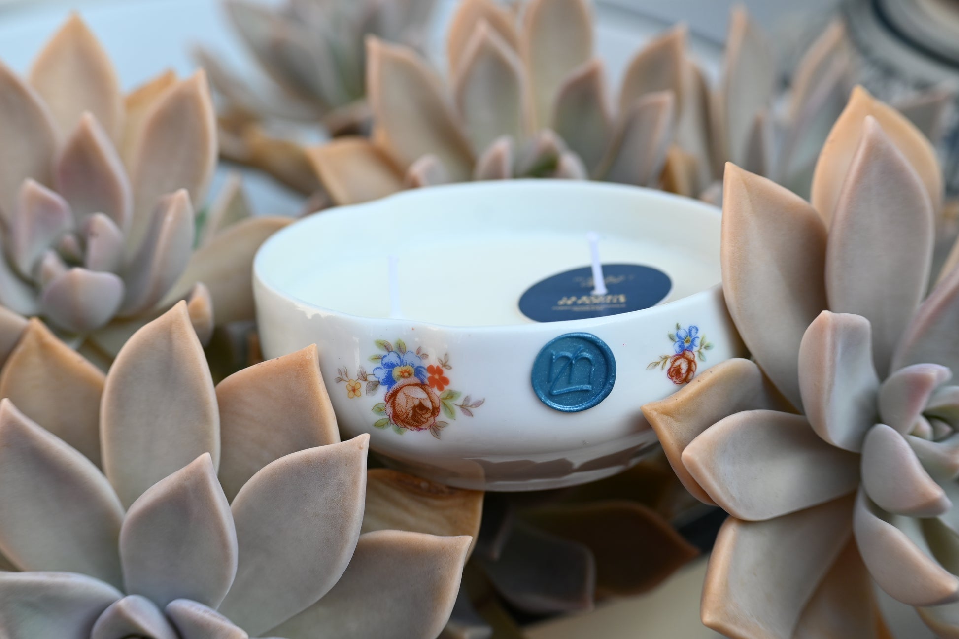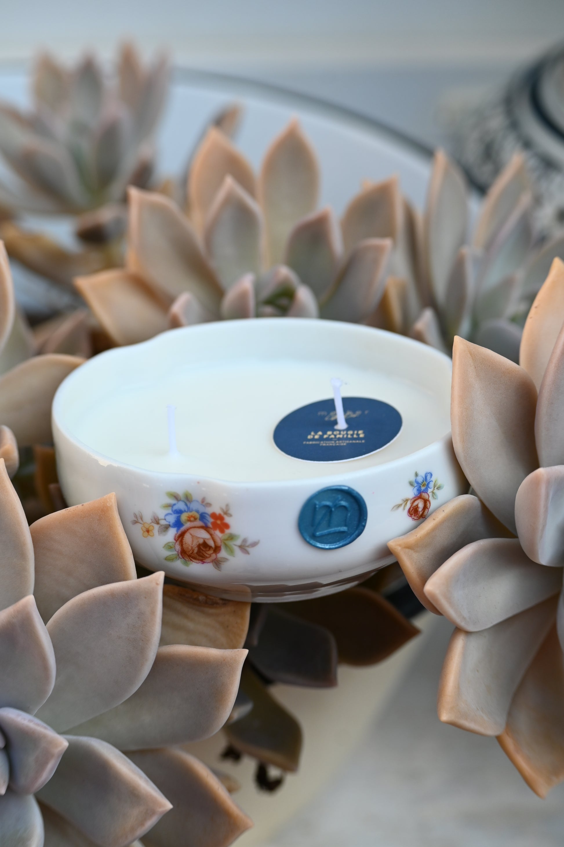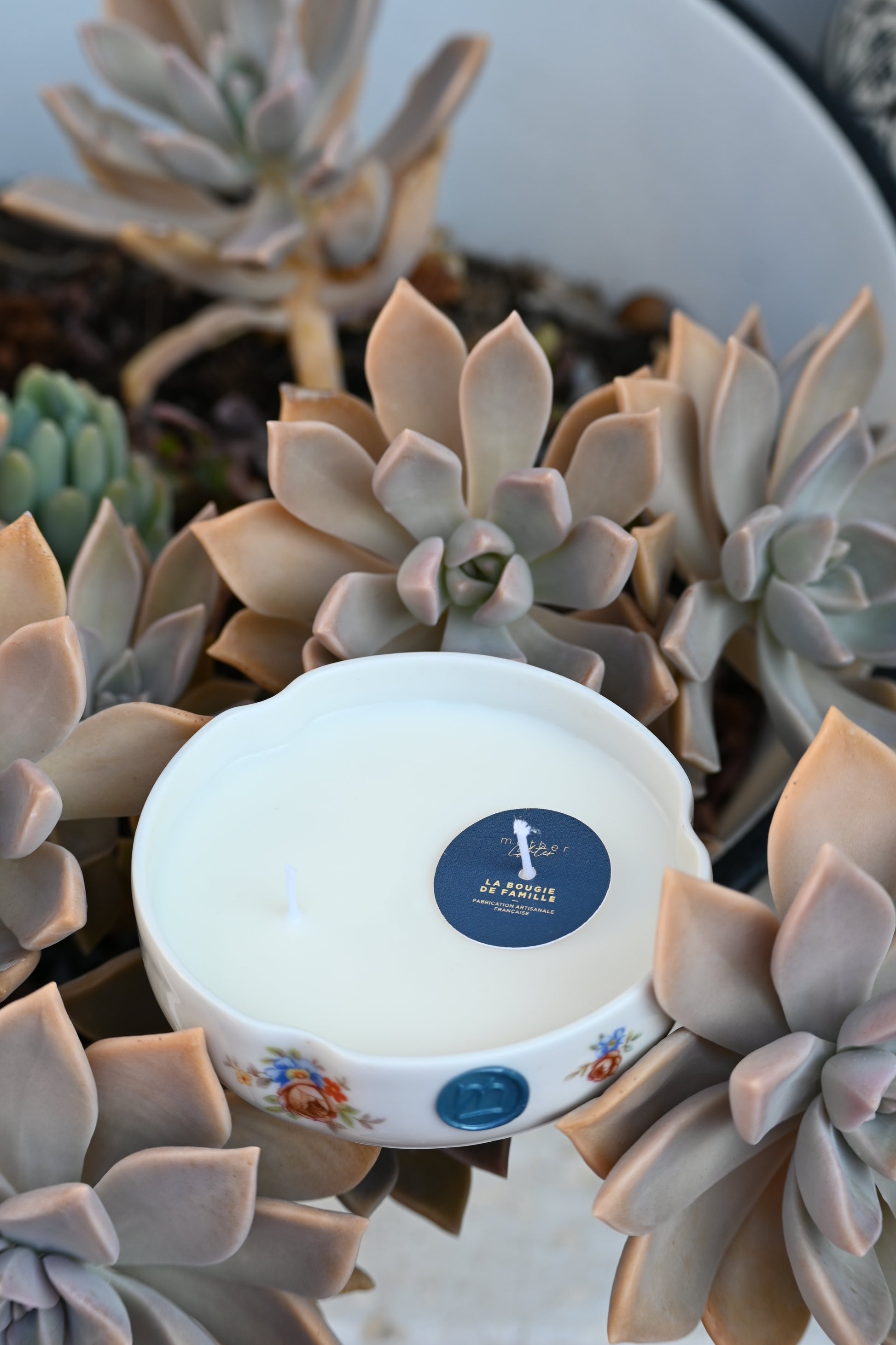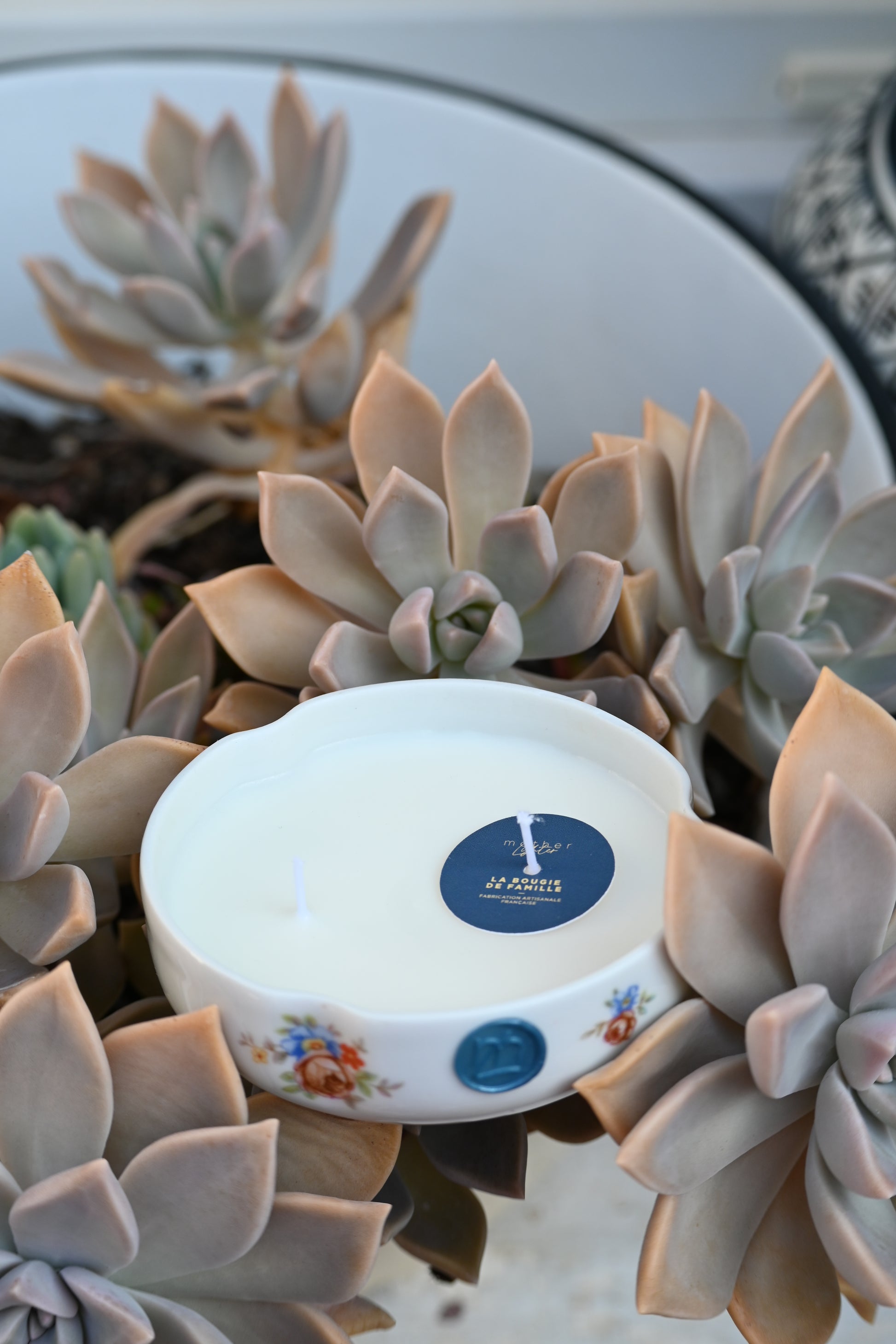 Bougie coulée dans une coupelle décoré de fleurs. Une fois votre bougie terminée il vous servira pour contenir de petits objets ou vos bijoux.