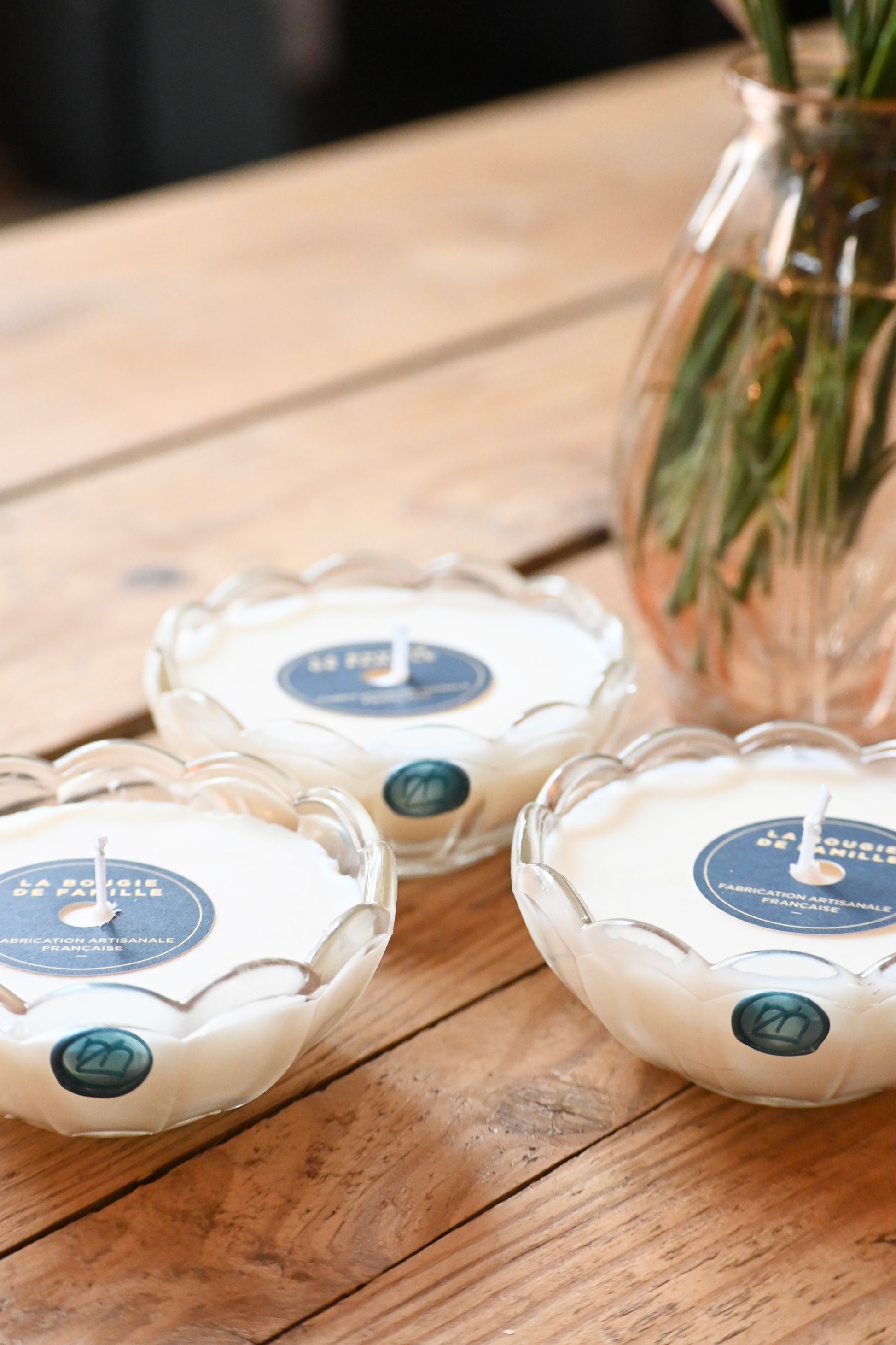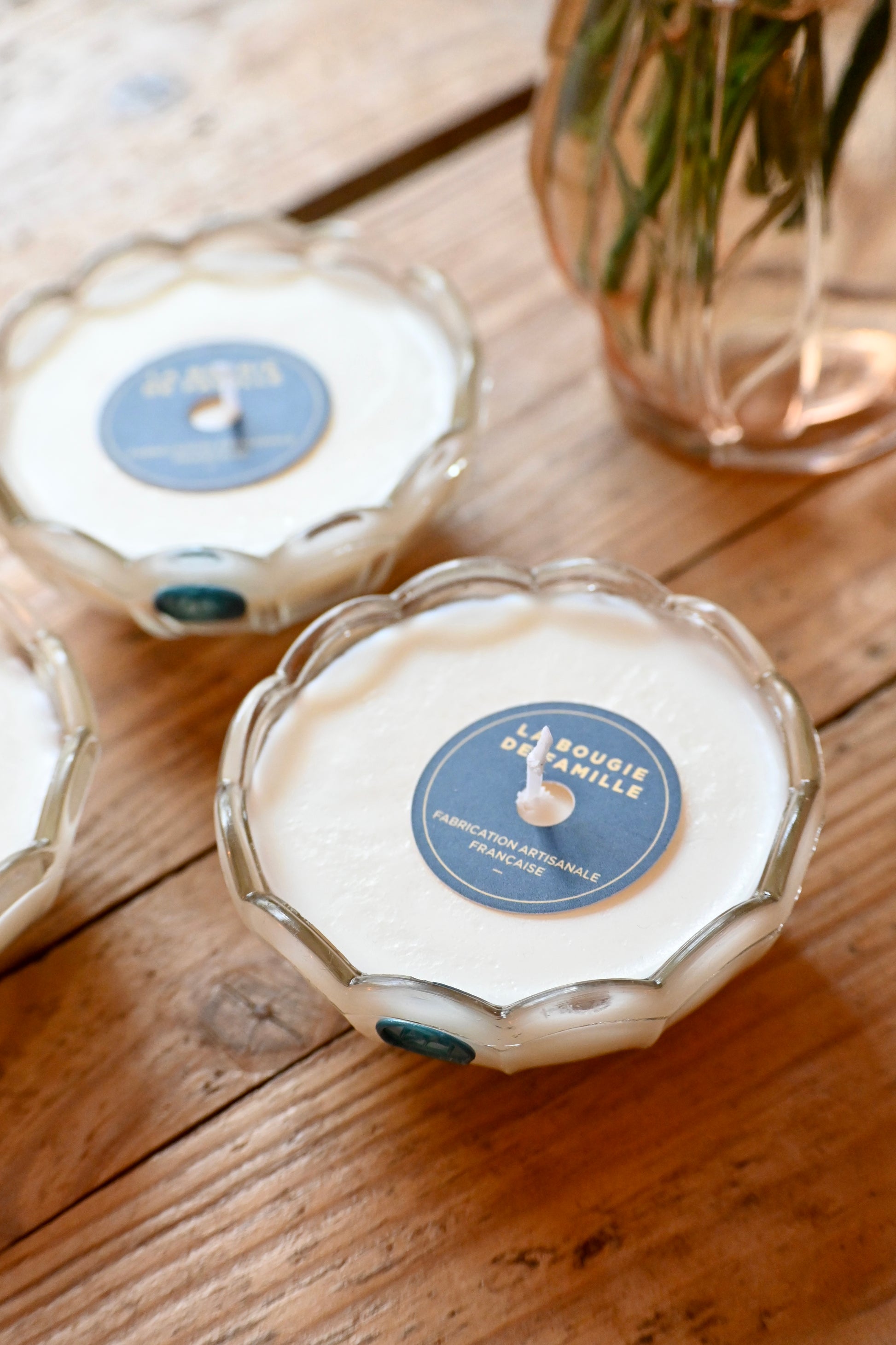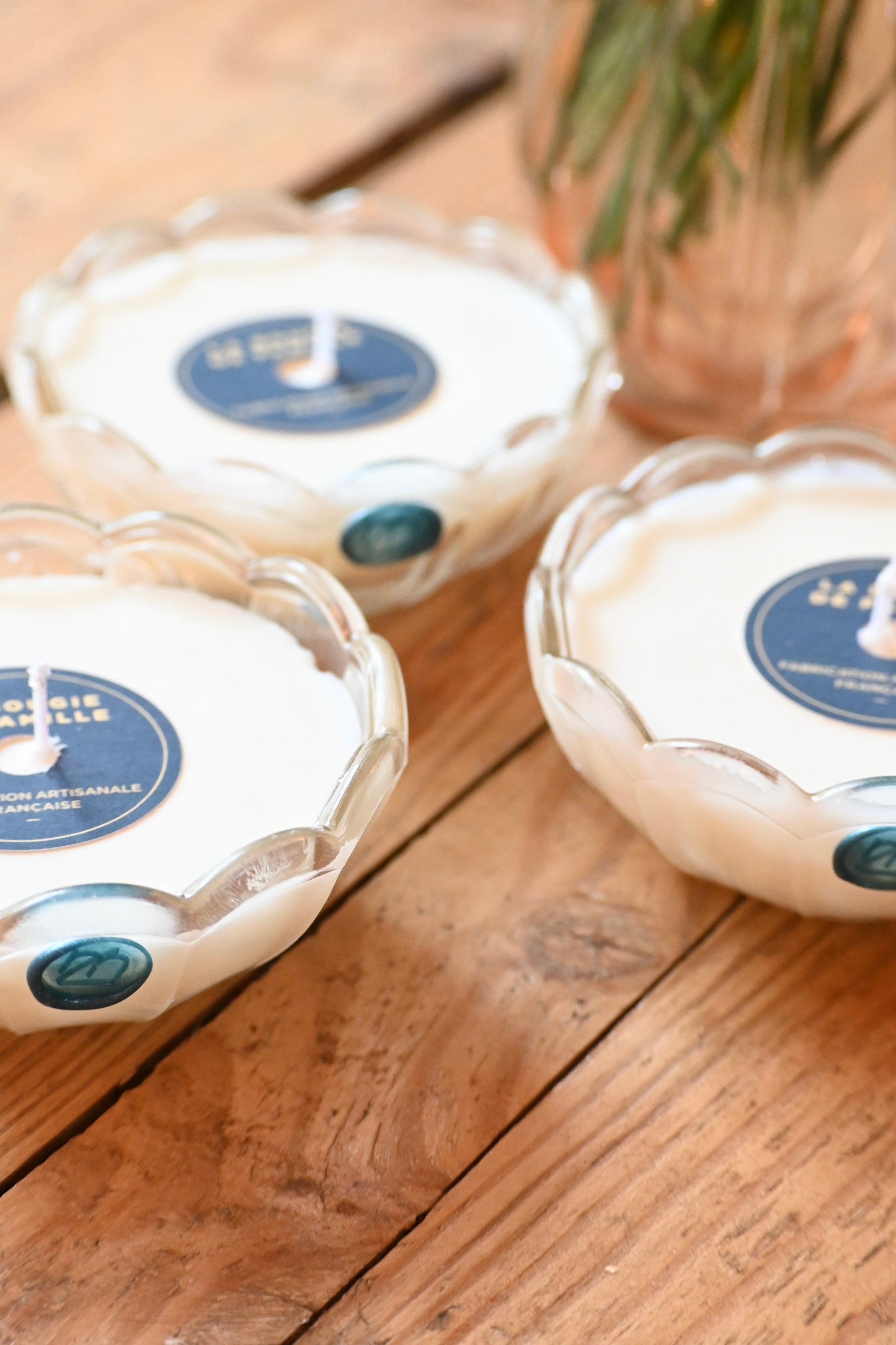 Bougie coulée dans une coupelle en forme de pétales. Une fois consumée, ce joli contenant pourra être réutilisé pour servir vos convives ou accueillir vos bijoux.