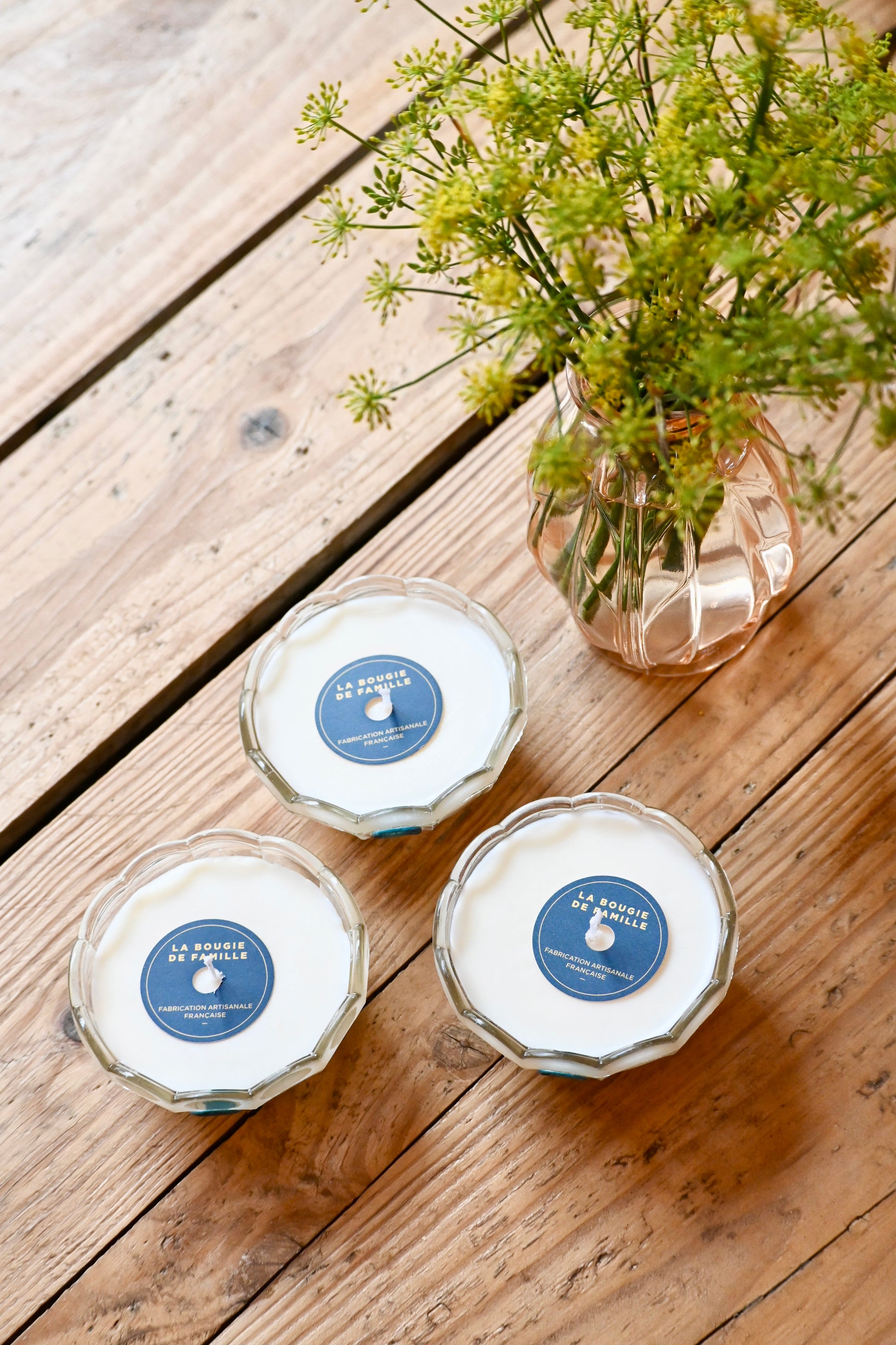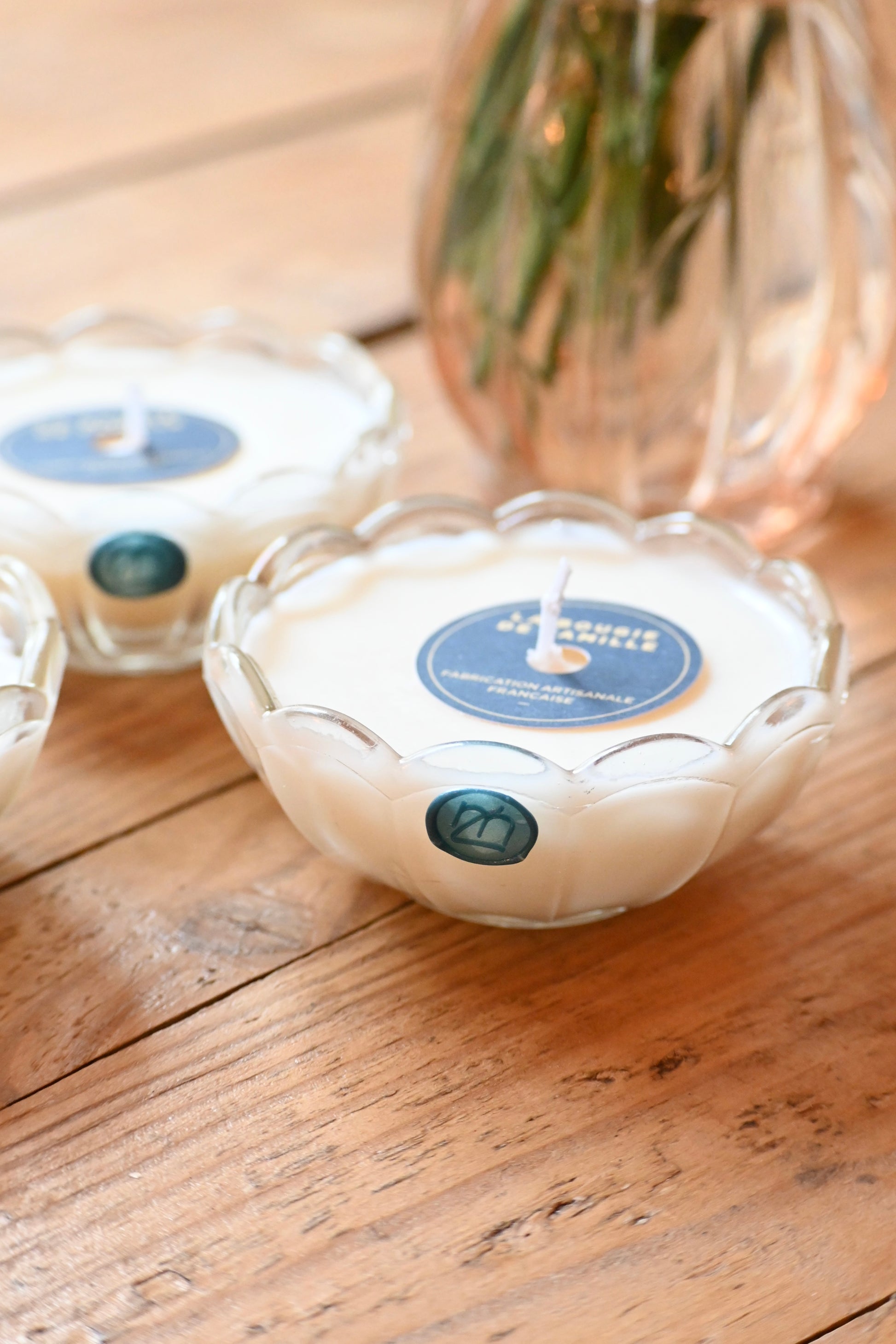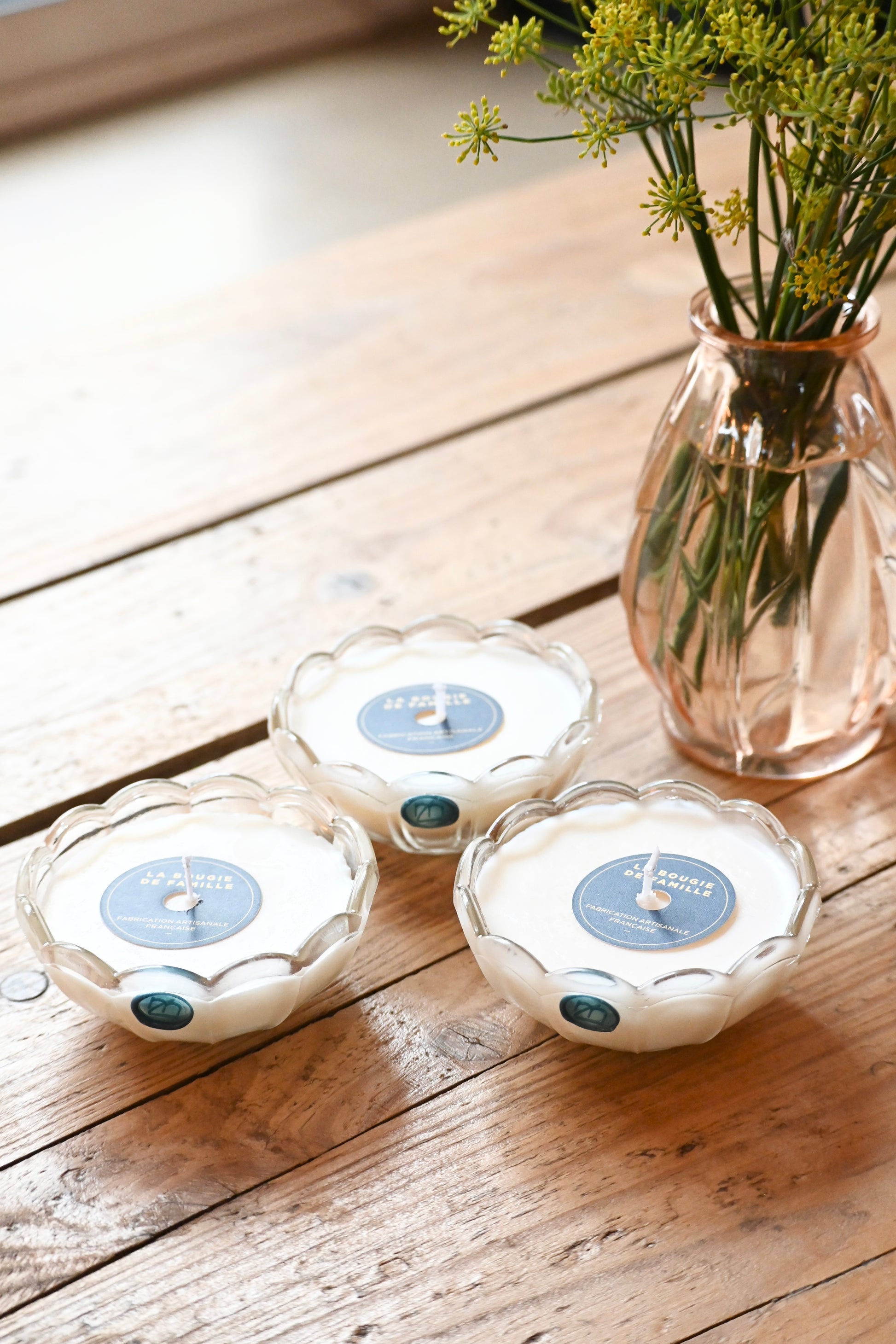 Bougie coulée dans une coupelle en forme de pétales. Une fois consumée, ce joli contenant pourra être réutilisé pour servir vos convives ou accueillir vos bijoux.
