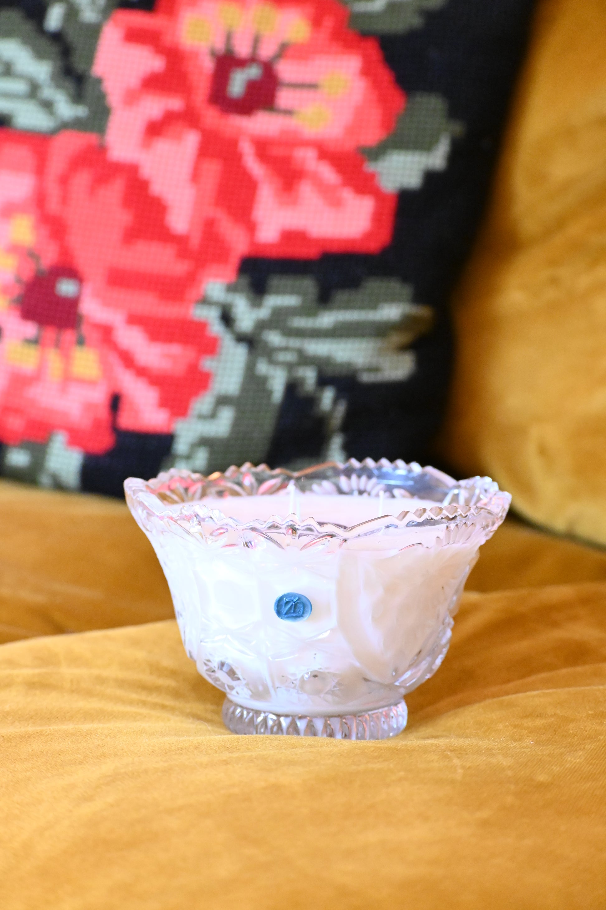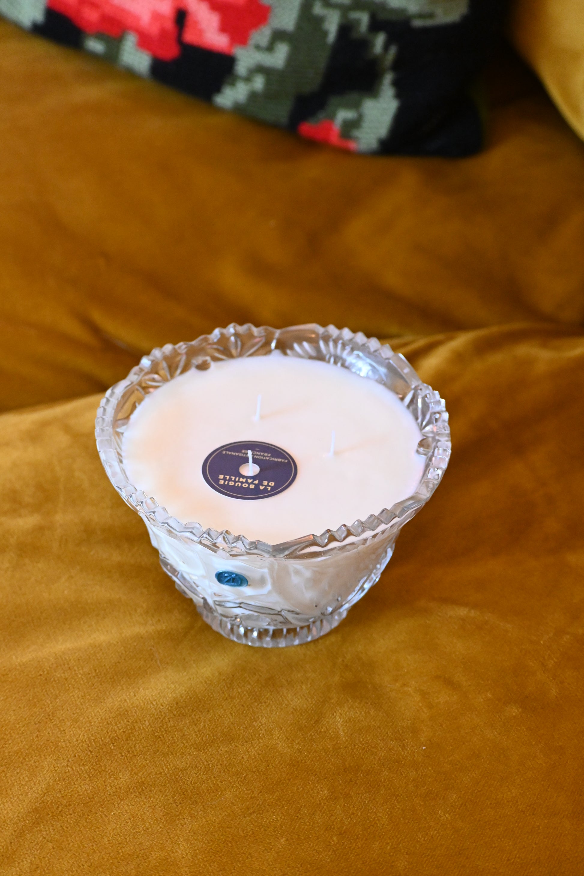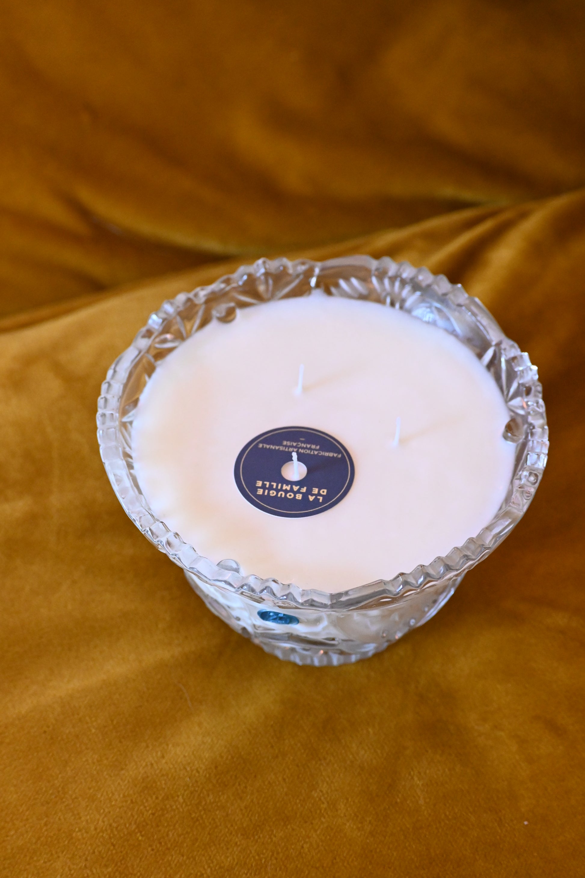 Bougie coulée dans une coupe en cristal délicatement gravé. Il fera un joli photophore ensuite.