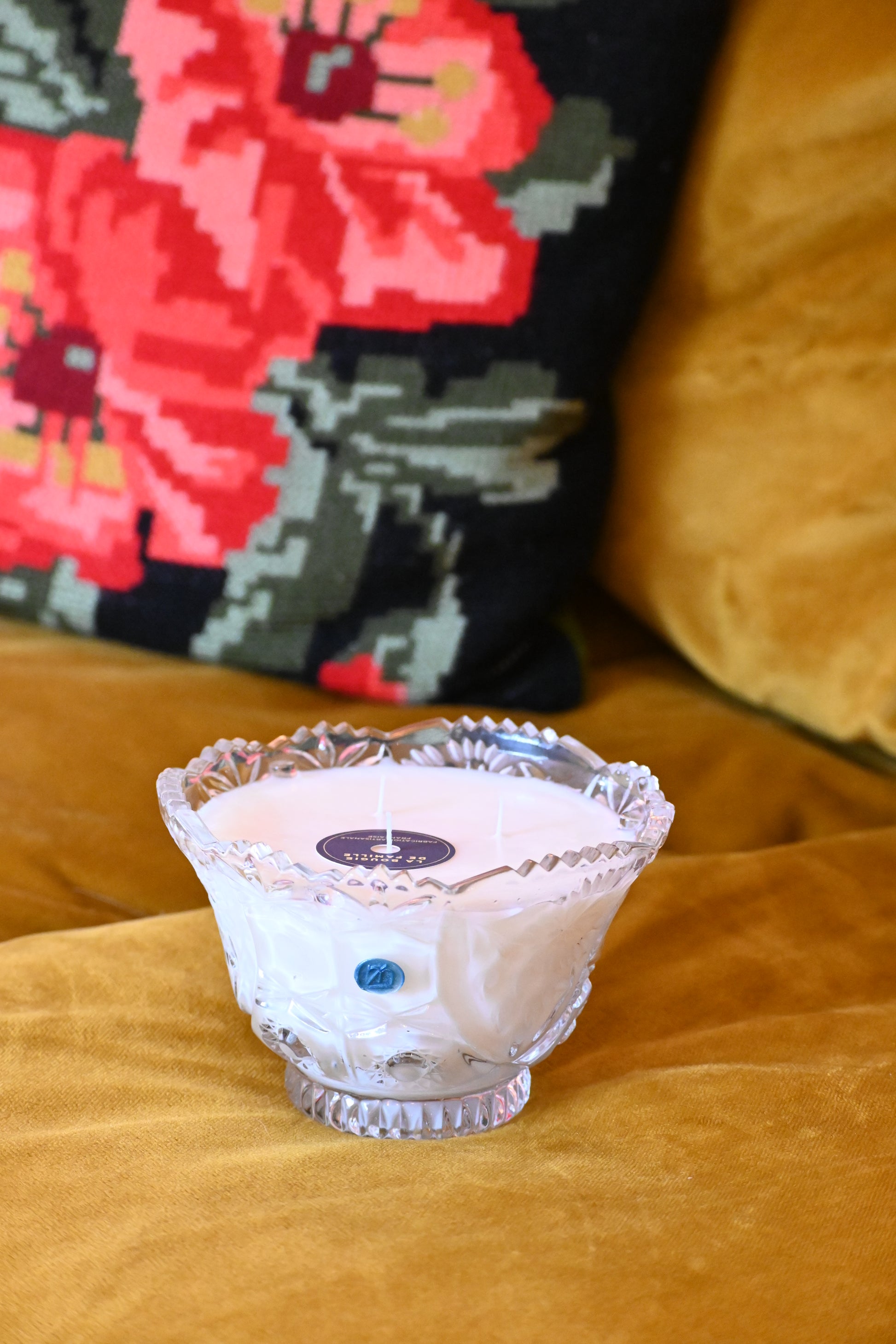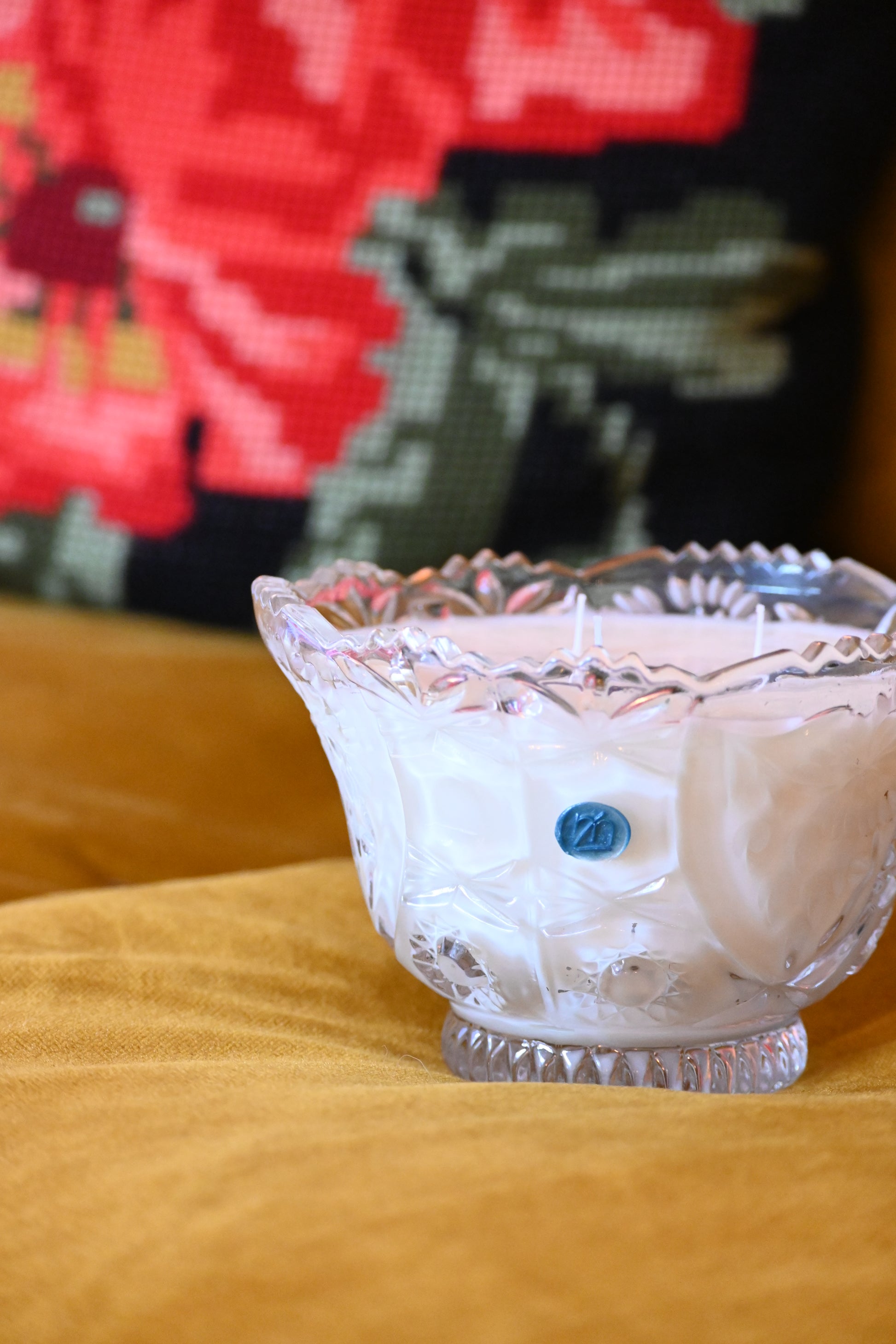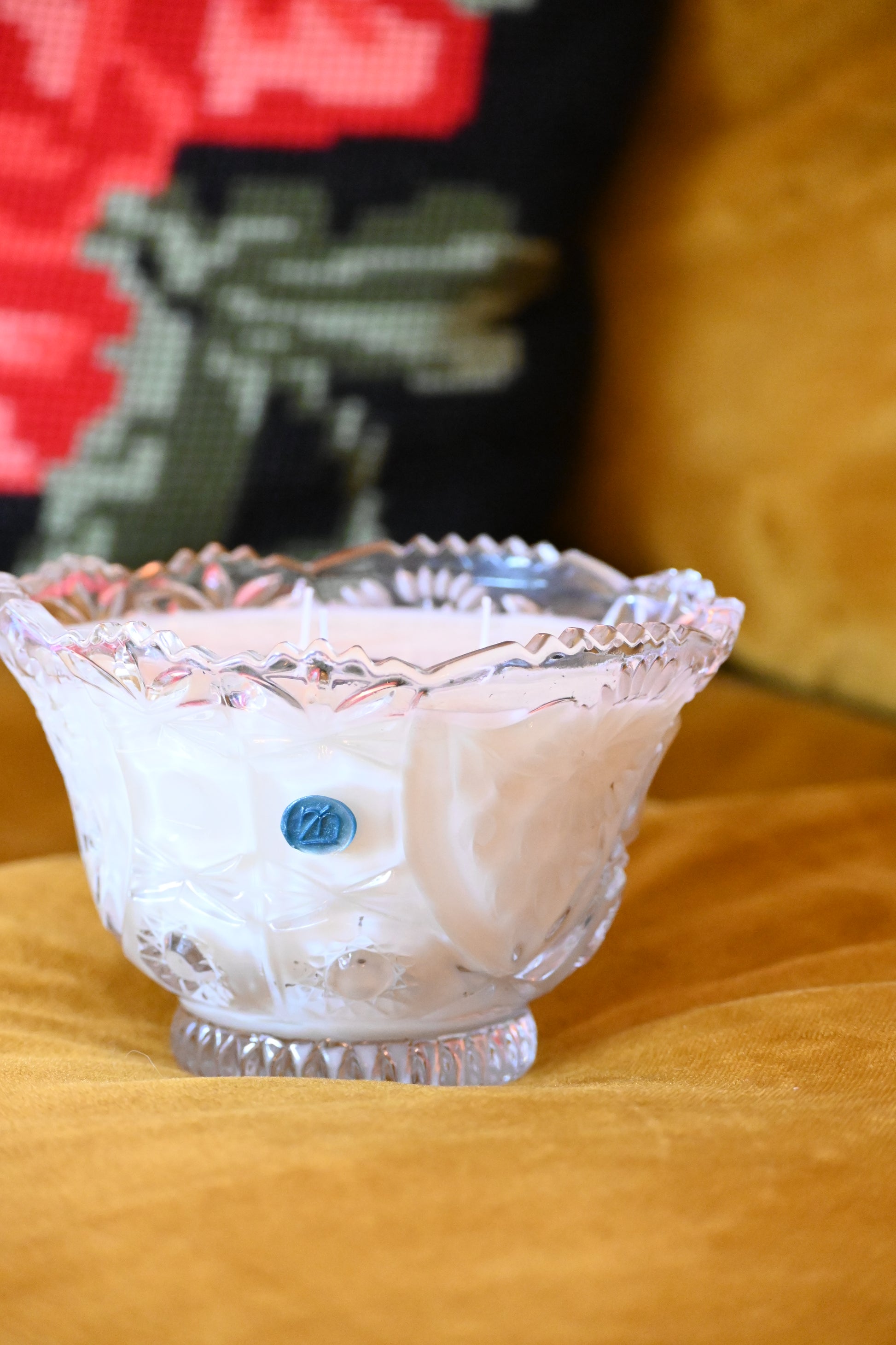 Bougie coulée dans une coupe en cristal délicatement gravé. Il fera un joli photophore ensuite.