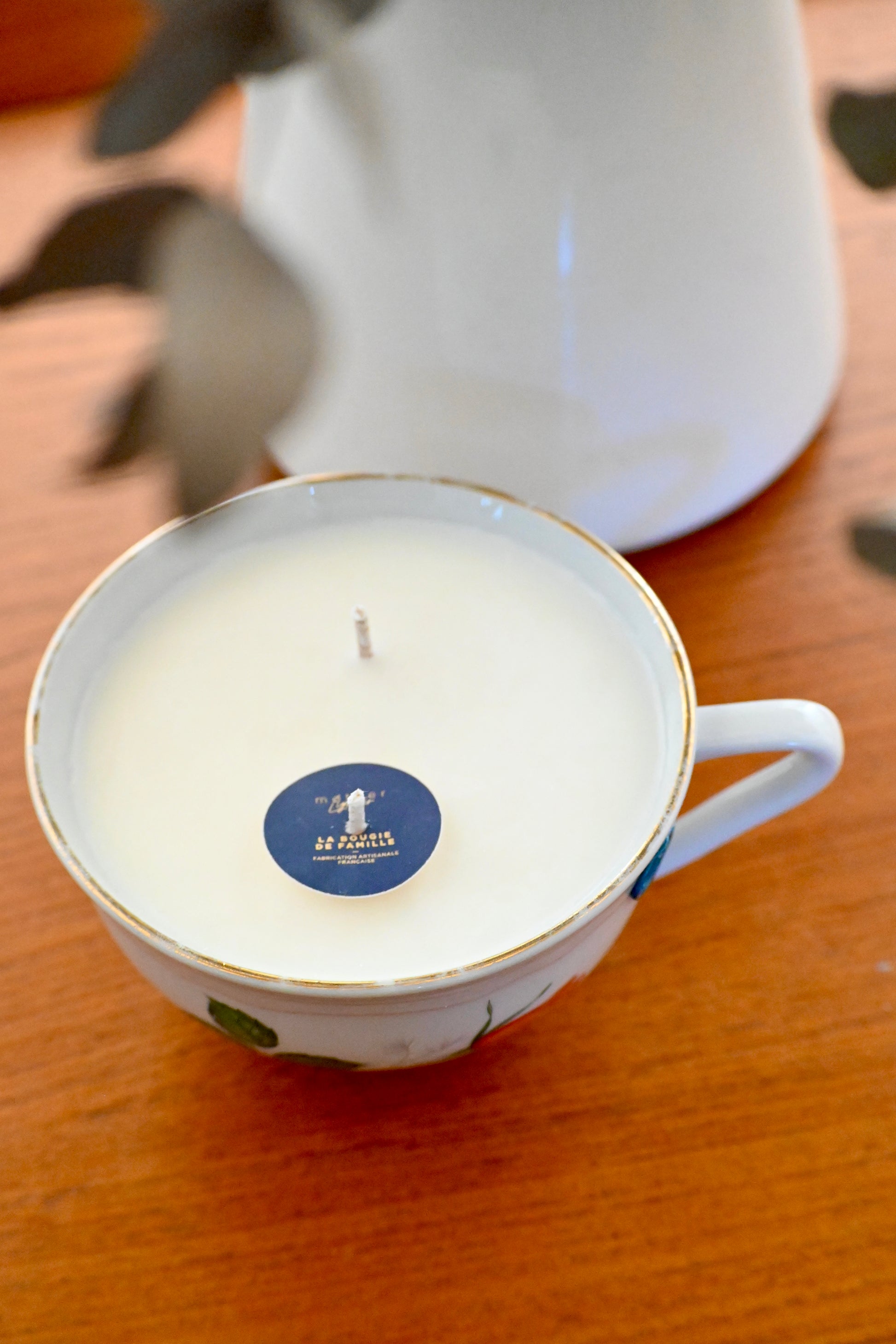Bougie coulée dans une jolie tasse à thé décorée d’un bouquet d’une rose. Une fois terminée, elle sera parfaite pour un thé.