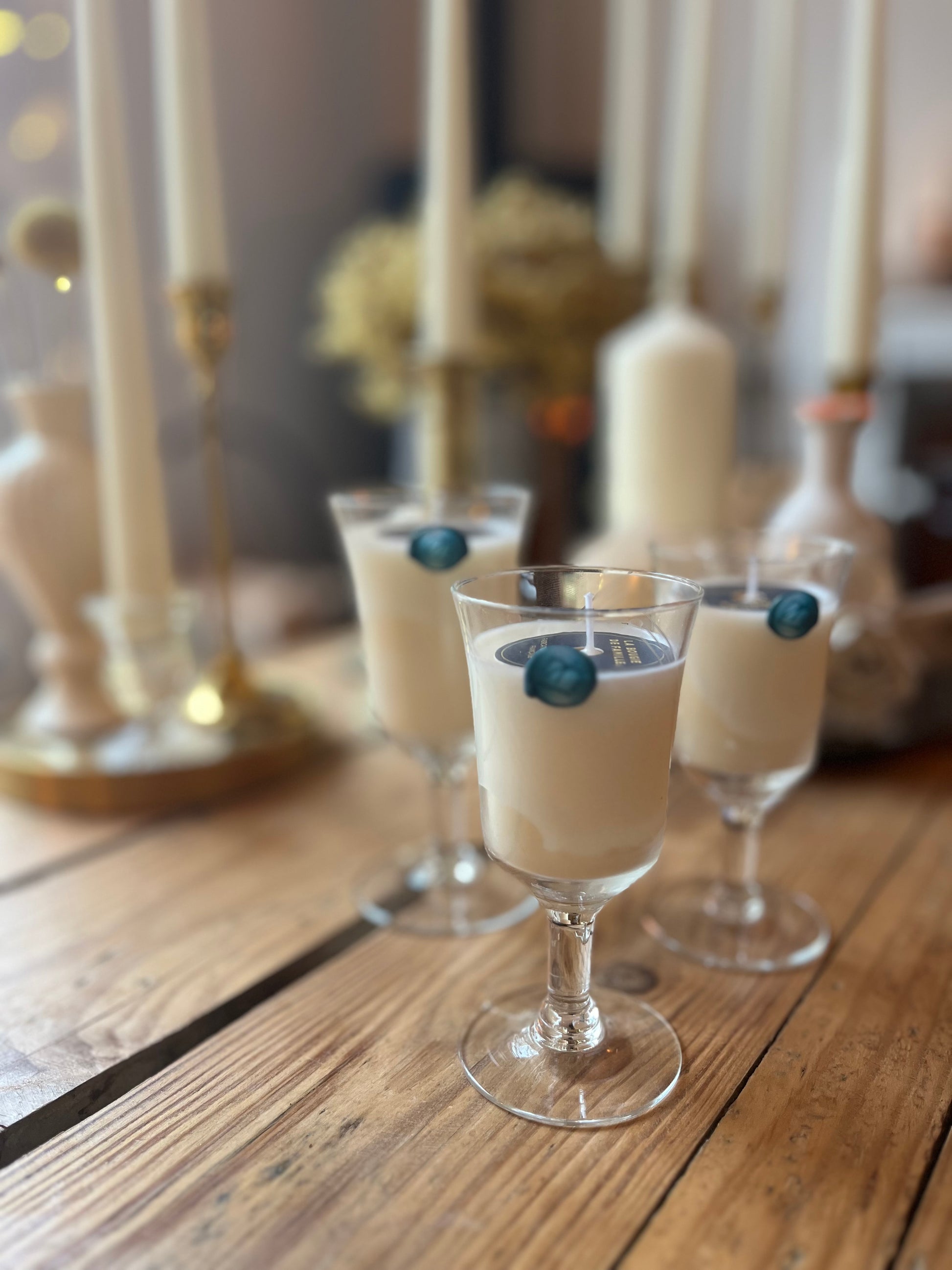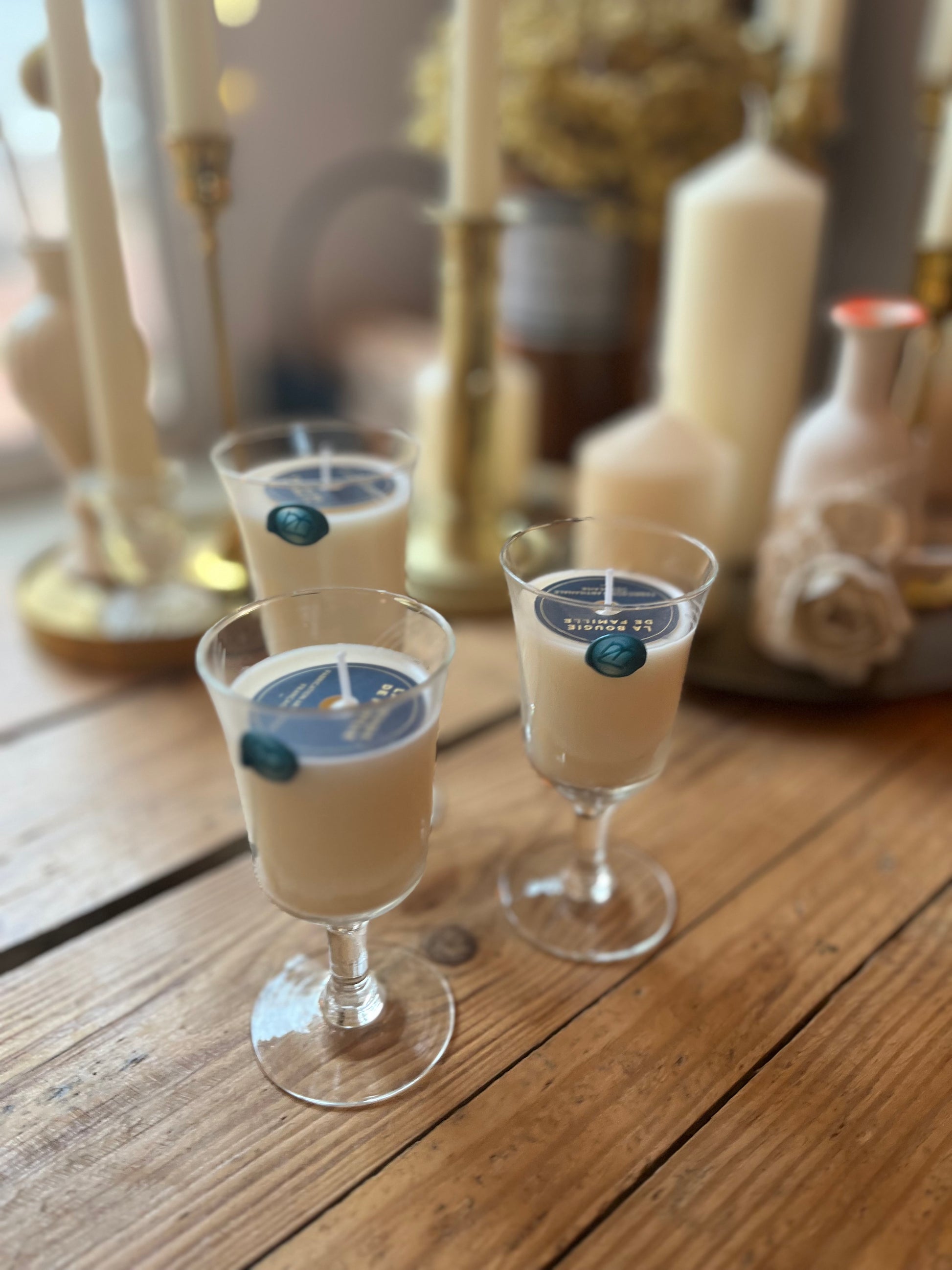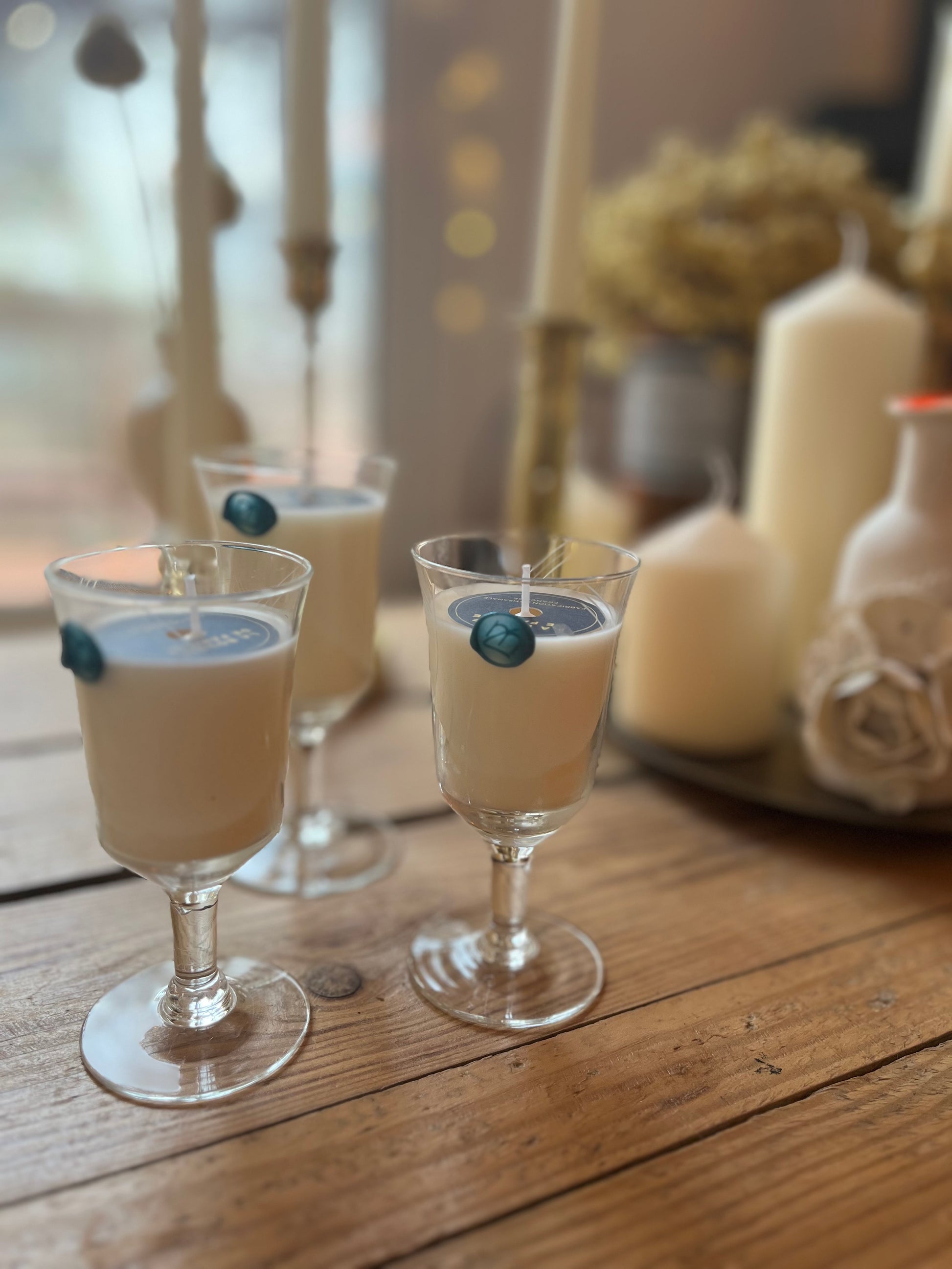 Bougie coulée dans un petit verre à digestif, idéal pour agrémenter et illuminer vos tables de fête ou vos beaux dîners. Une fois terminé il pourra rejoindre votre service à digestifs.