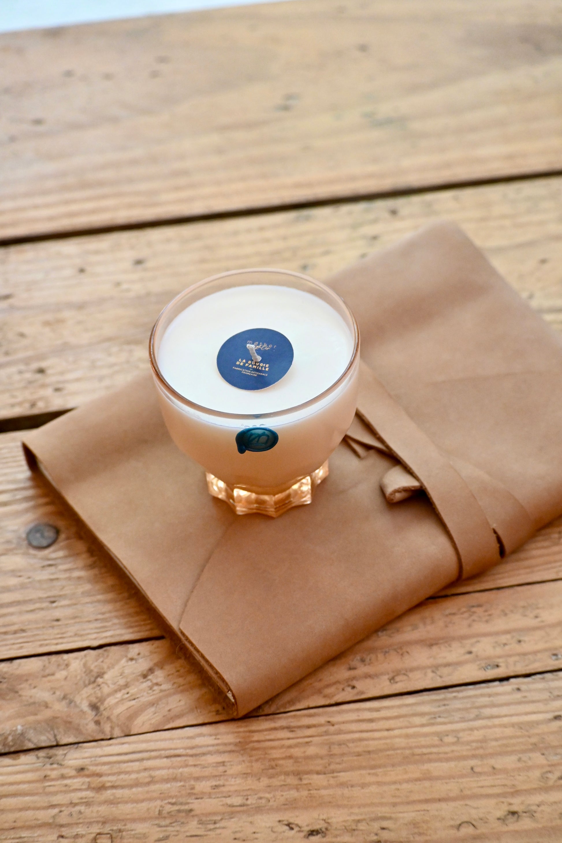 Bougie coulée dans un petit verre art déco de couleur rose pâle. Ce contenant est un incontournable des 70's, nostalgie assurée avec cette bougie aux couleurs pop!