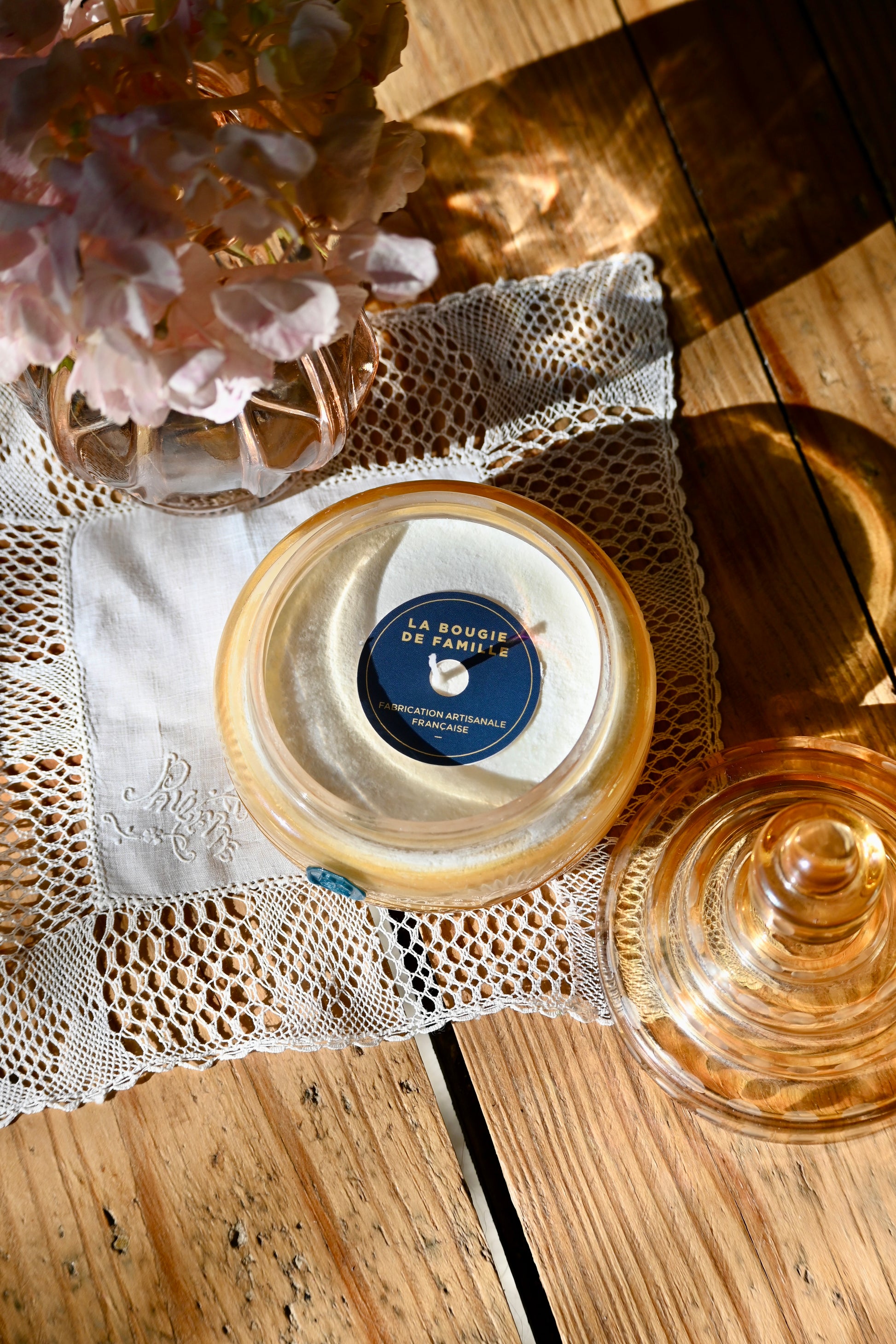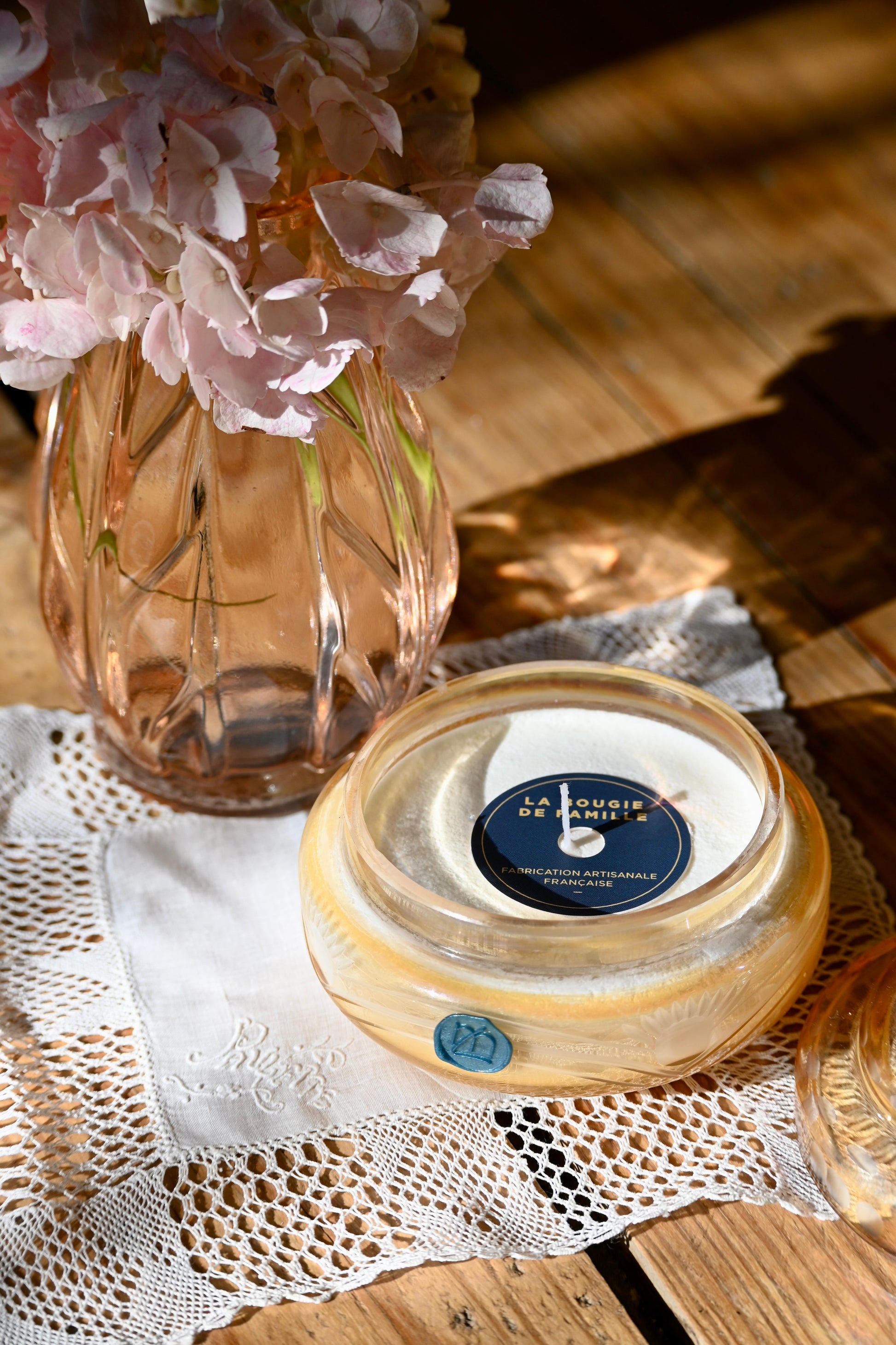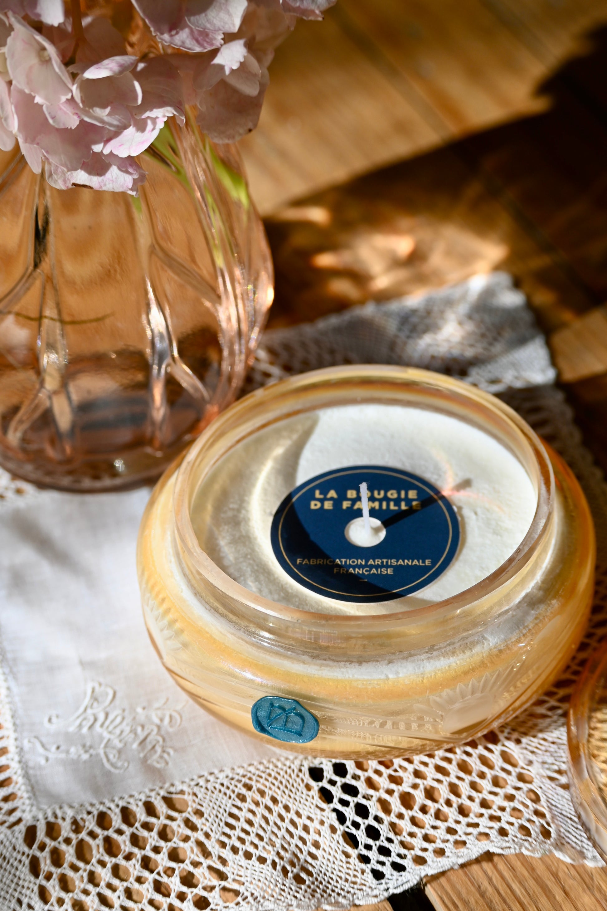 Bougie coulée dans une petite boite en verre orange délicatement ciselé. Cette jolie boite pourra accueillir vos bijoux une fois consumée ou rejoindre votre déco.