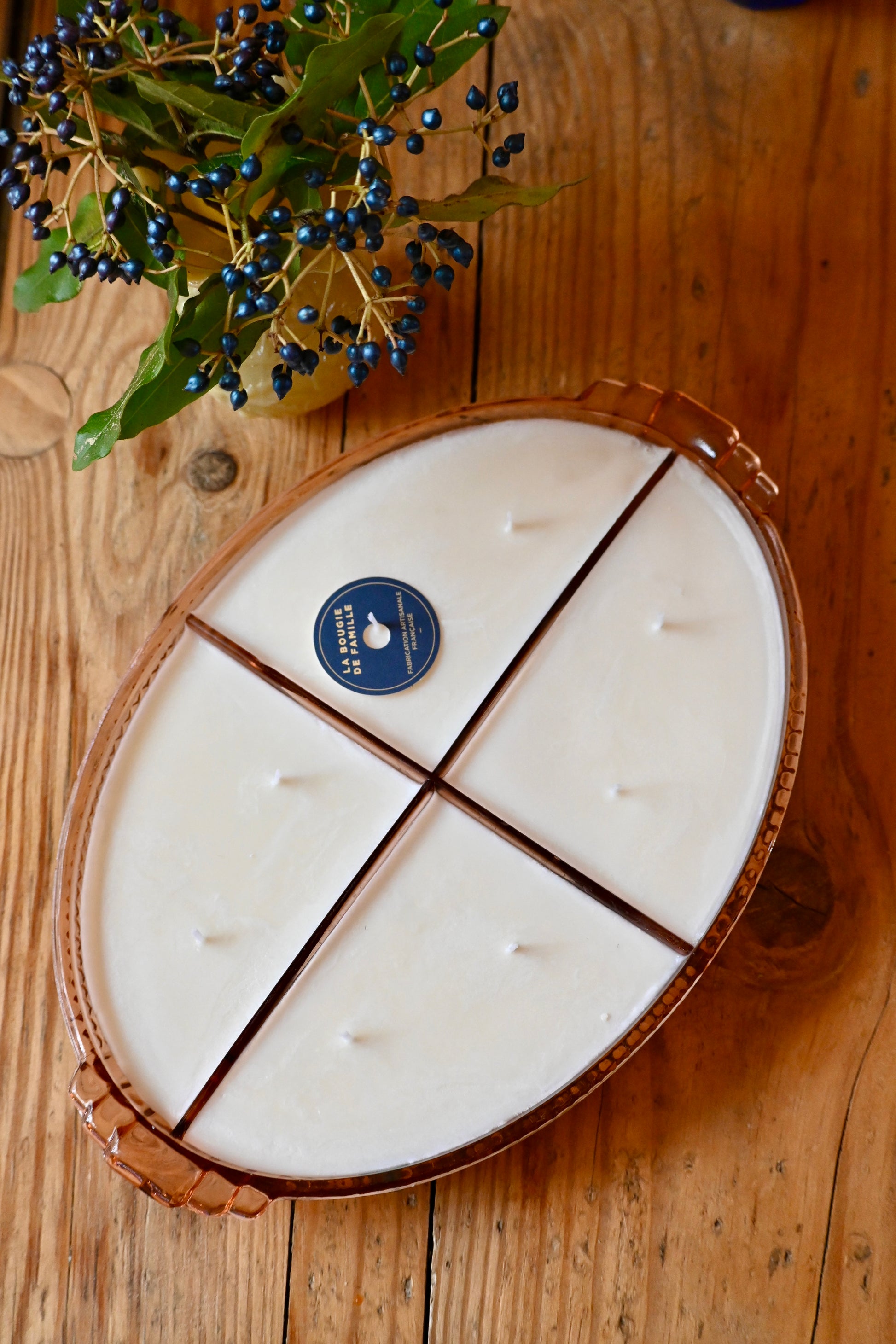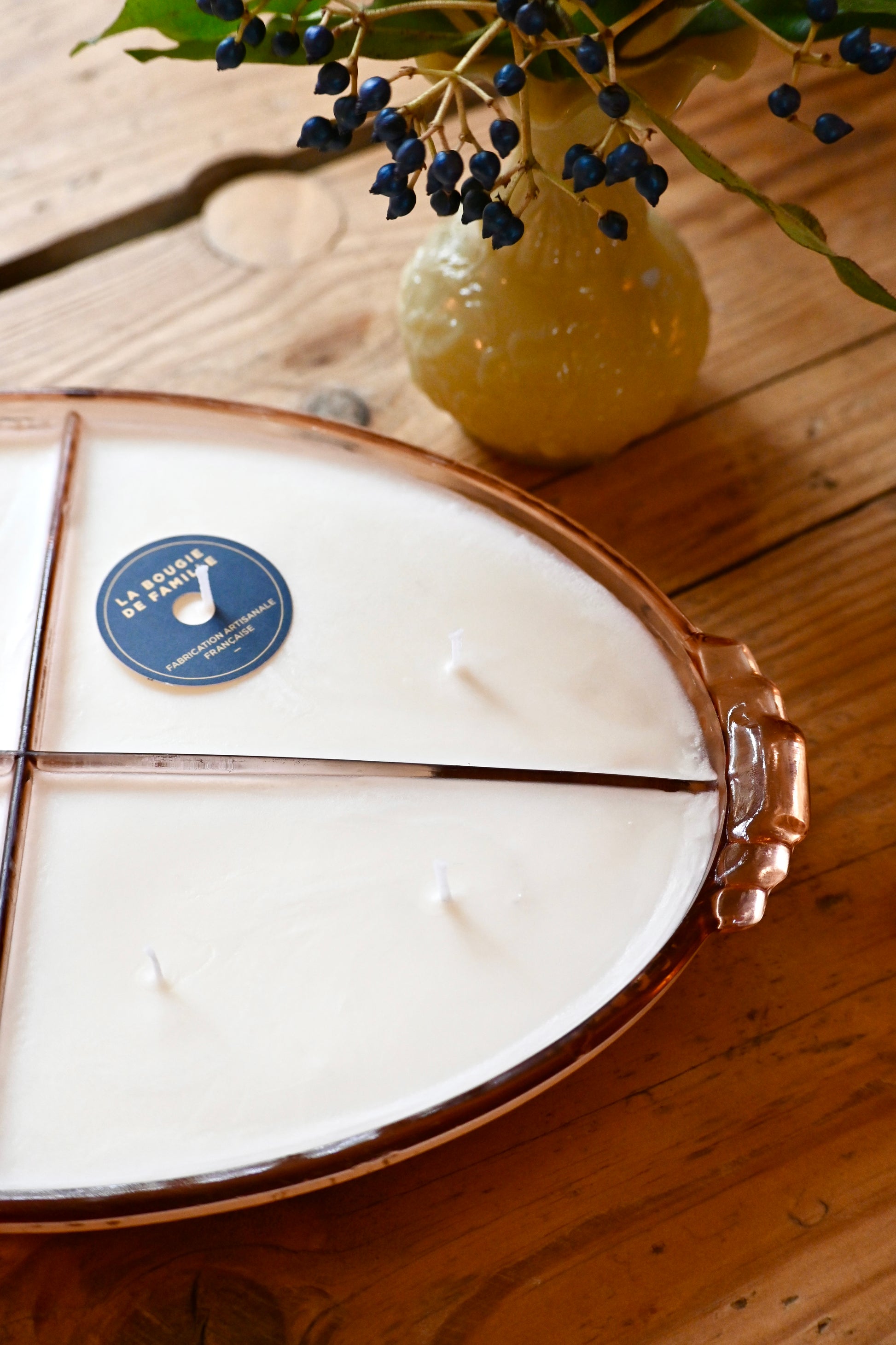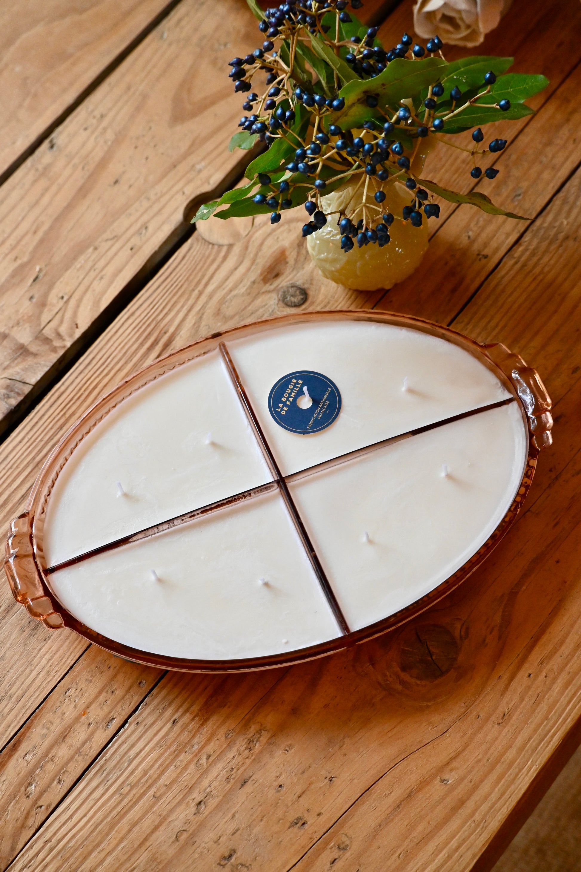 Bougie coulée dans un joli plateau à apéritif rose de style art déco. Il sera parfait pour servir vos convives une fois terminé.