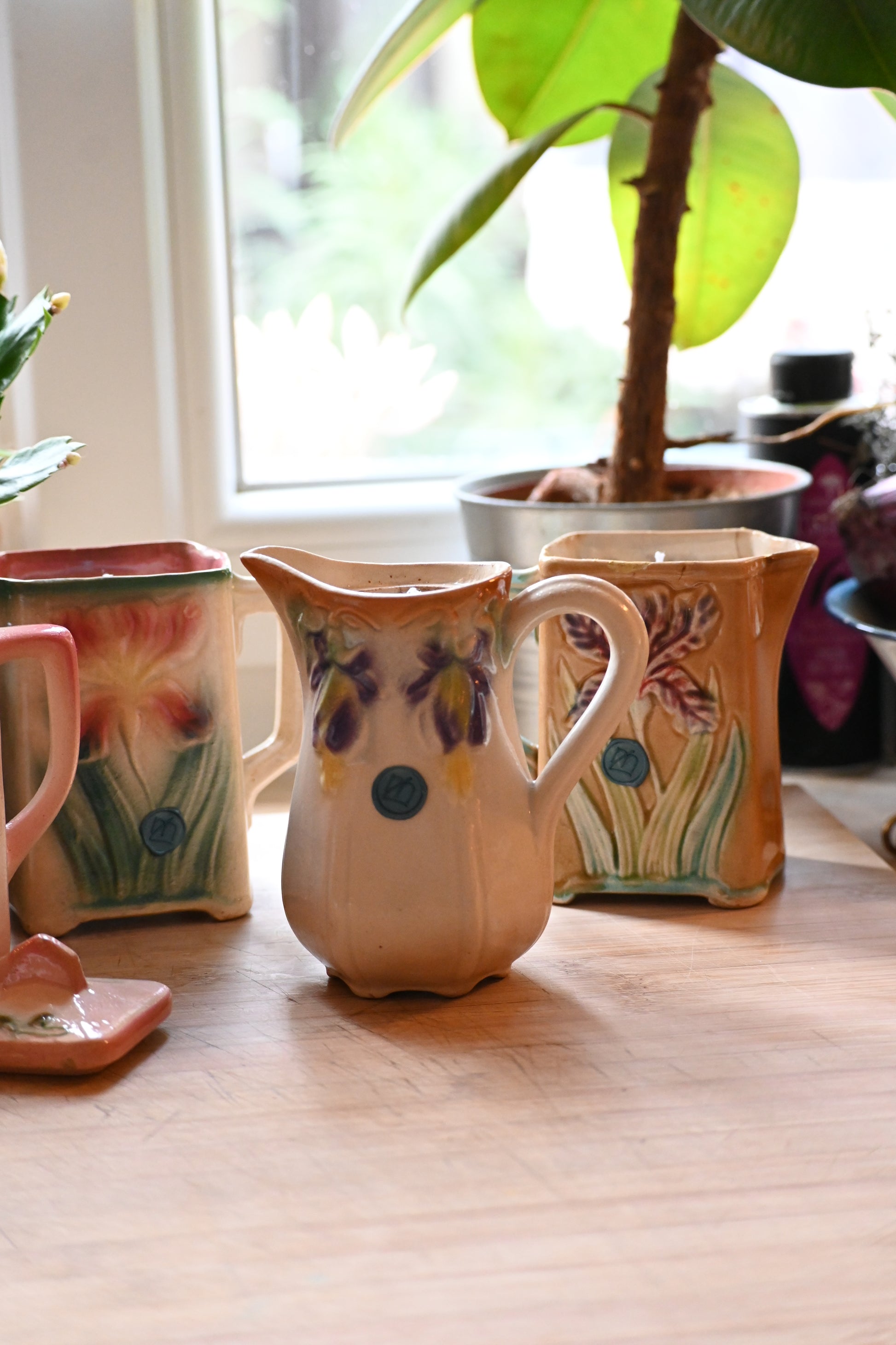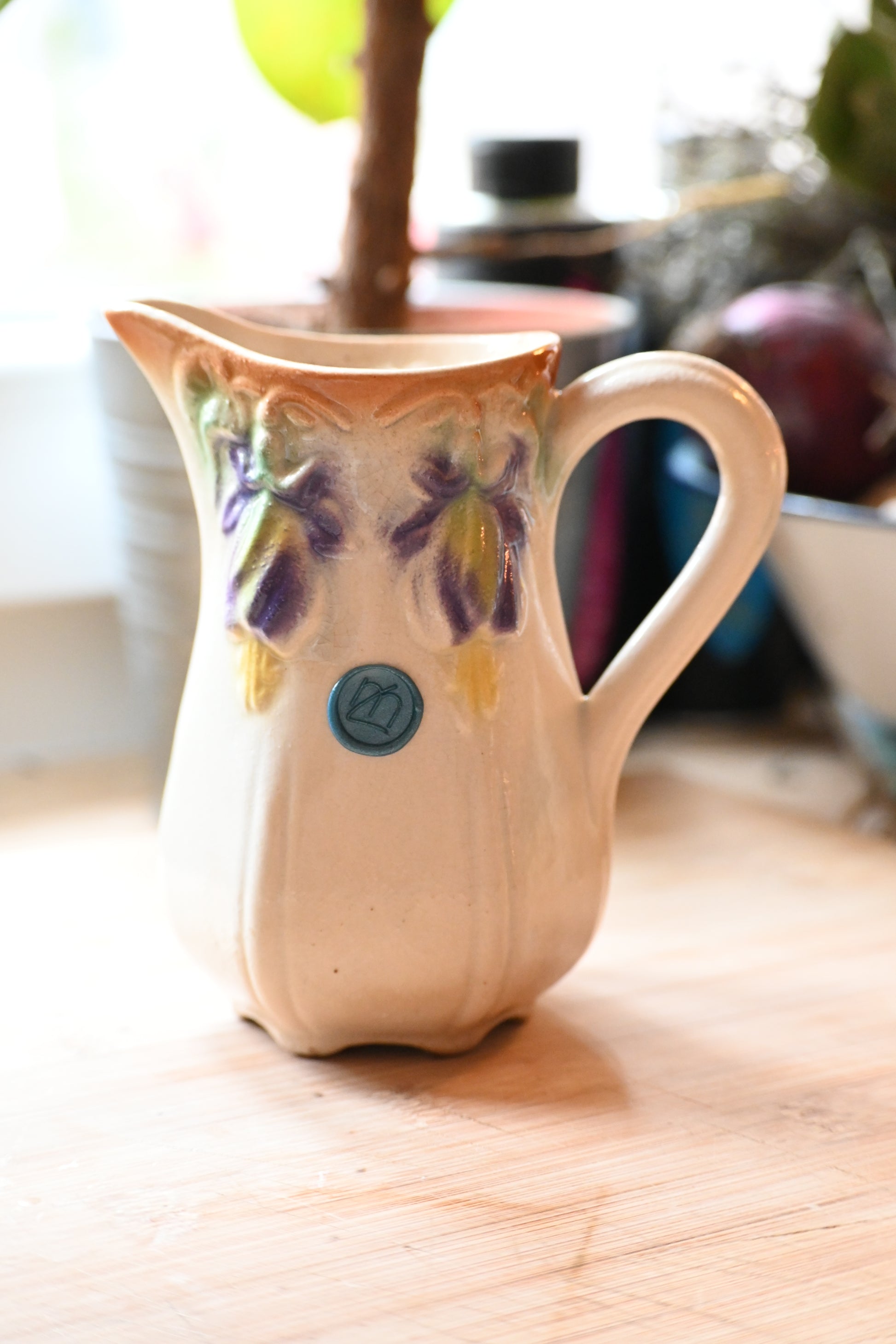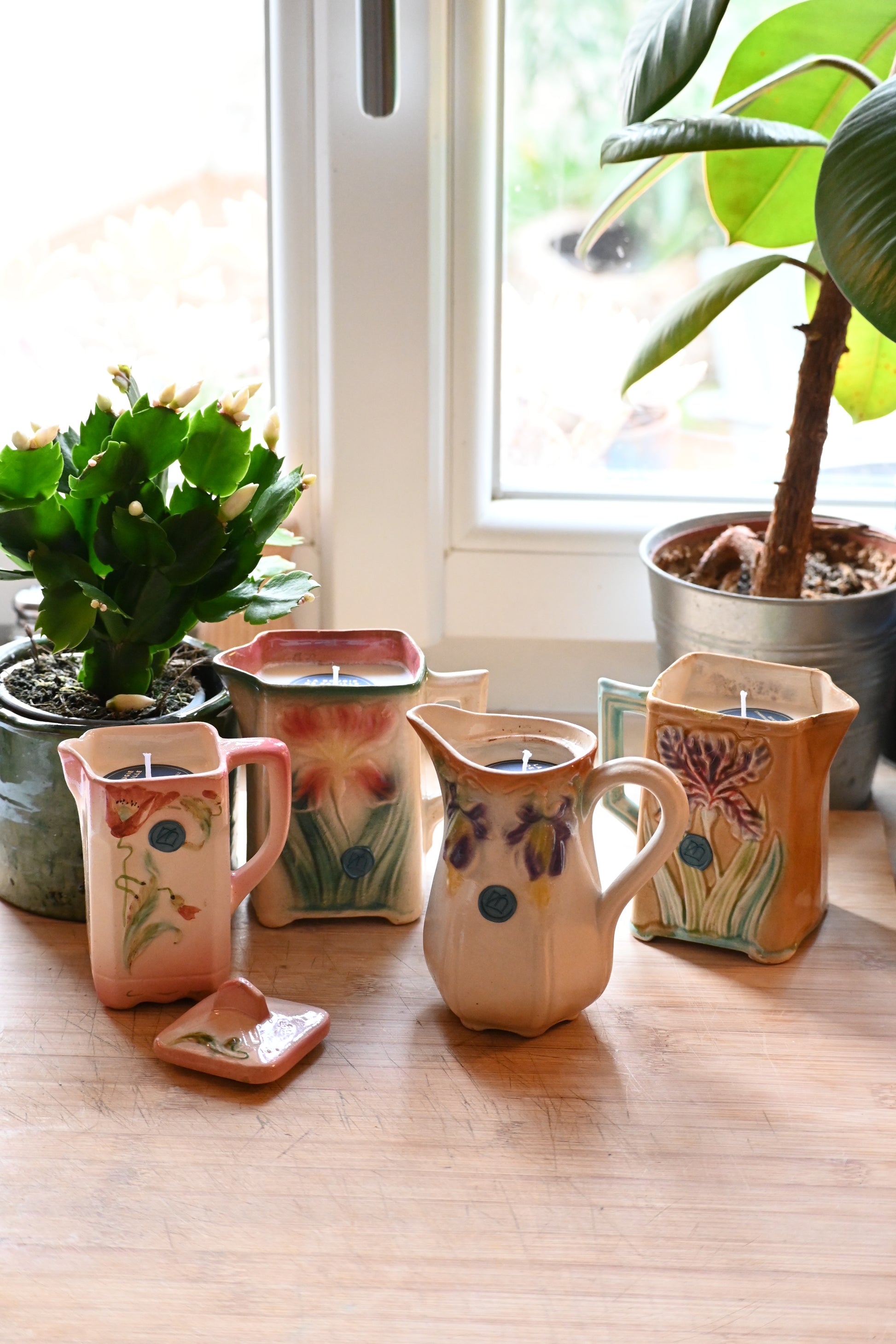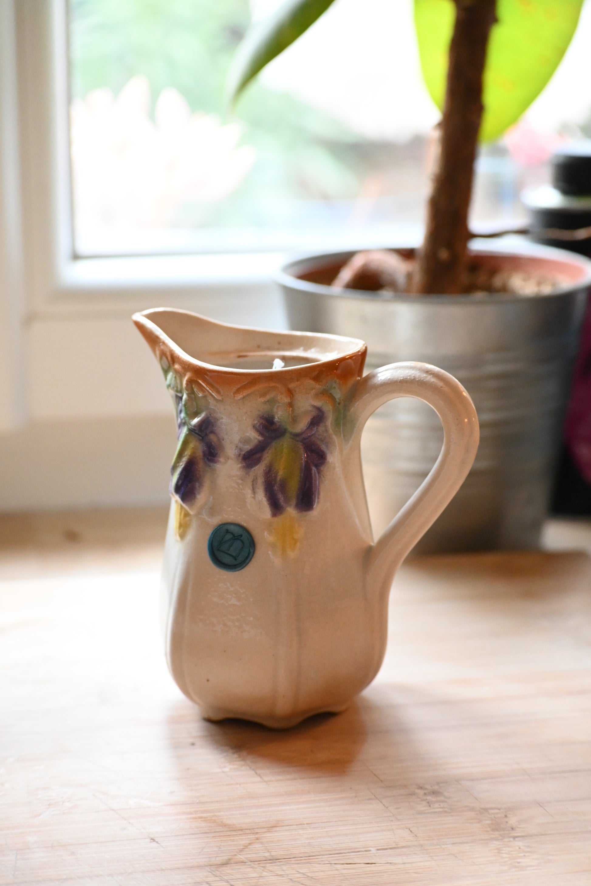Bougie coulée dans un pot à lait en barbotine décoré de clochettes. Une pièce rare. Il fera un petit vase parfait après avoir été consumé.