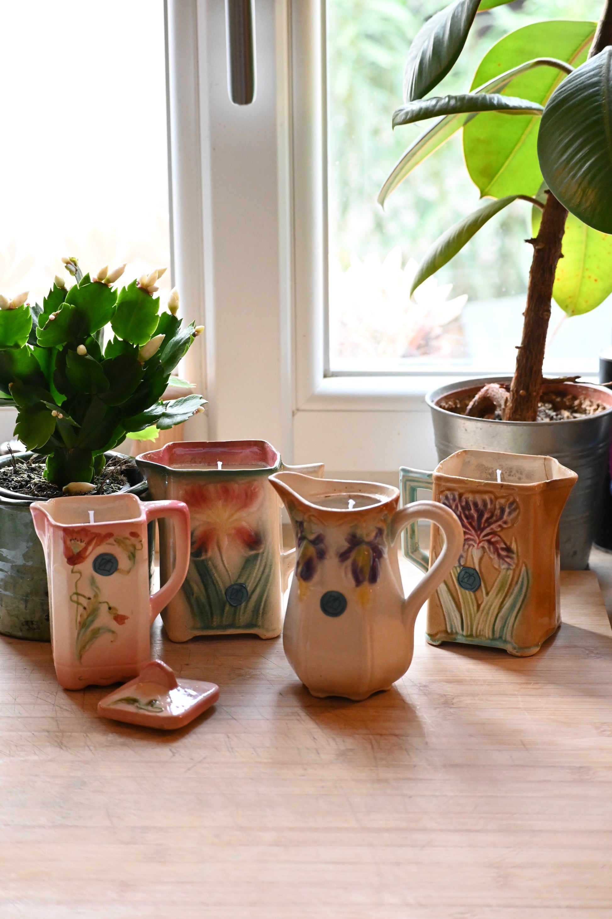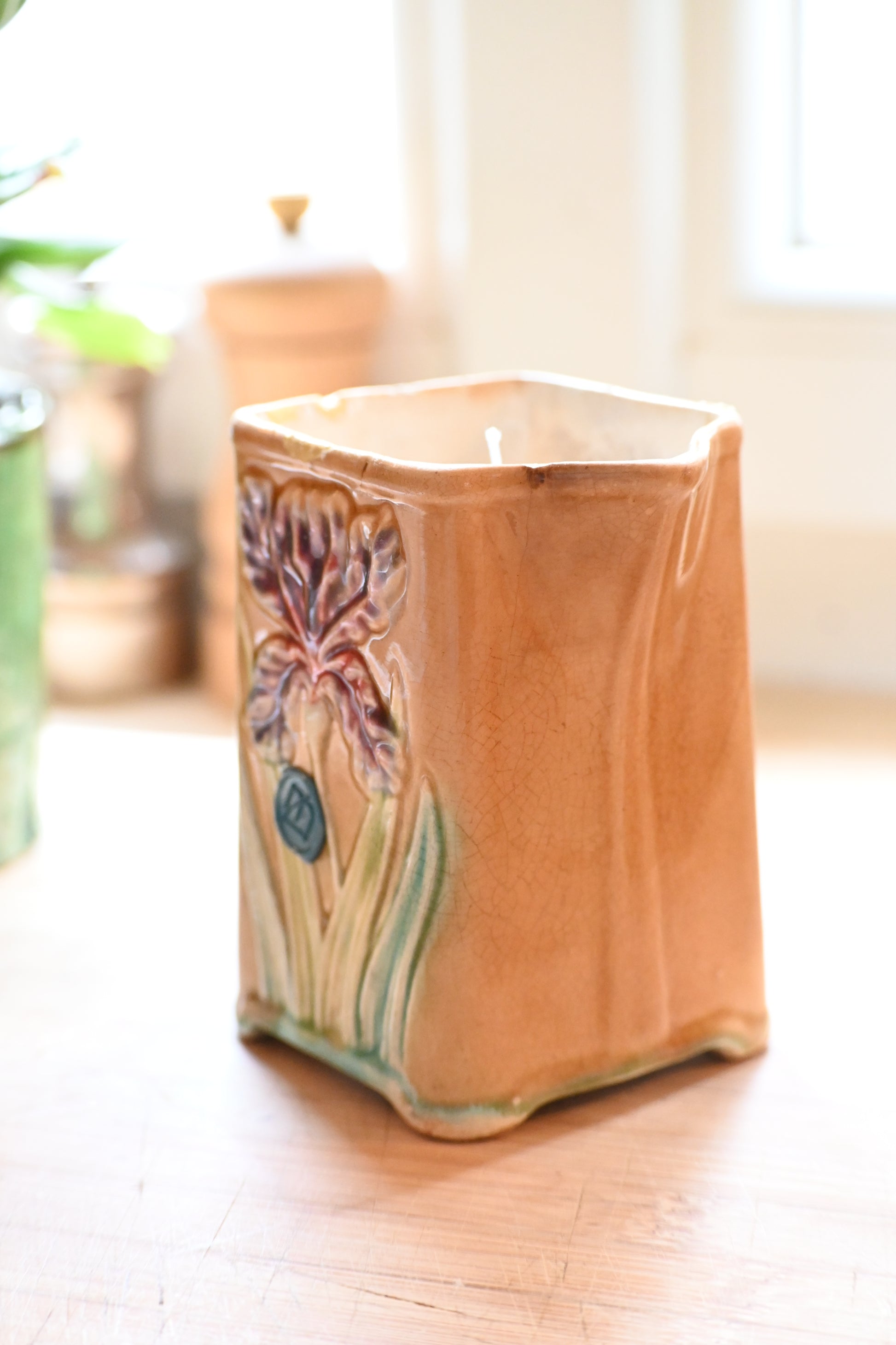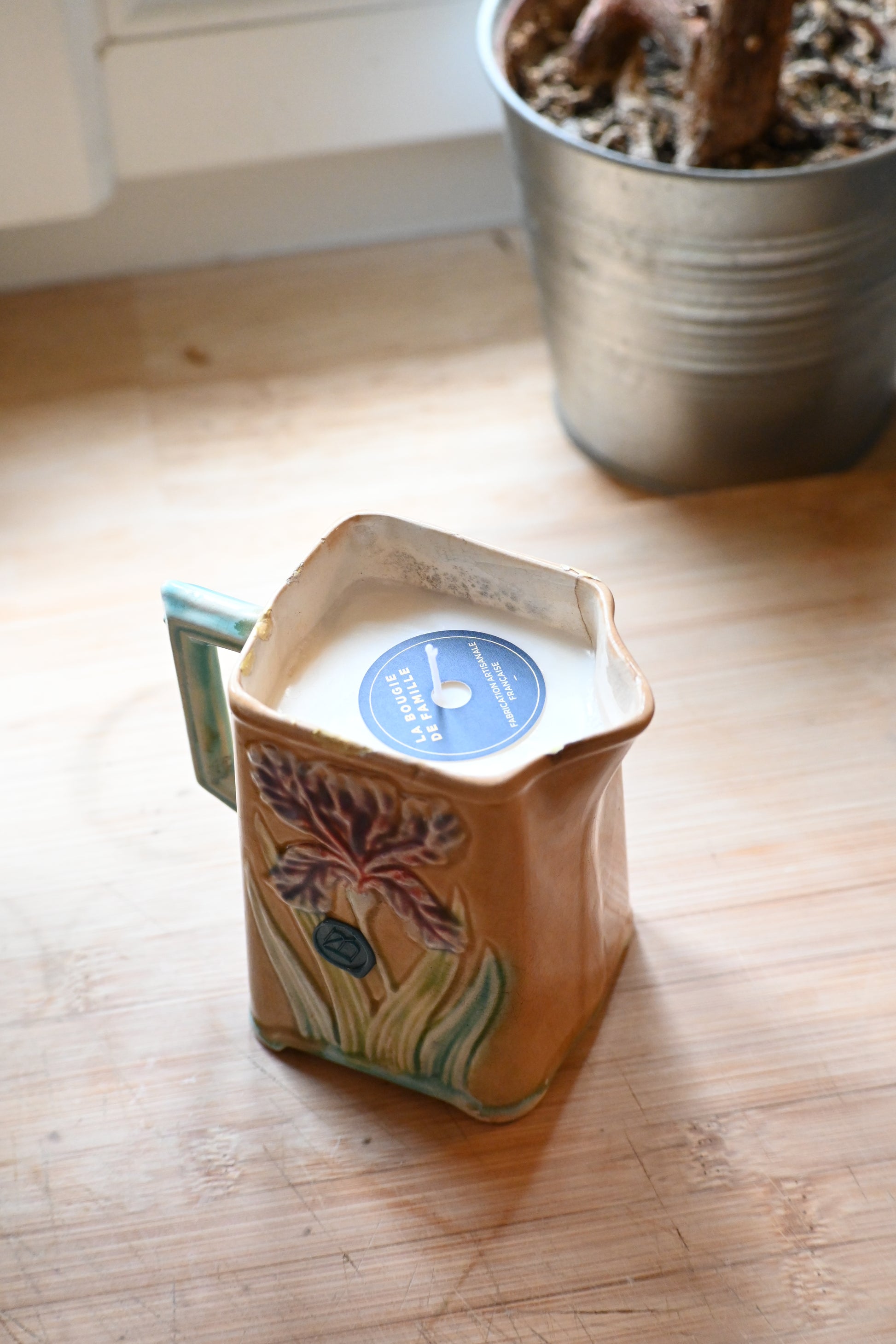 Bougie coulée dans un pot à lait en barbotine décoré d’un iris. Une pièce rare. Il fera un petit vase parfait après avoir été consumé.
