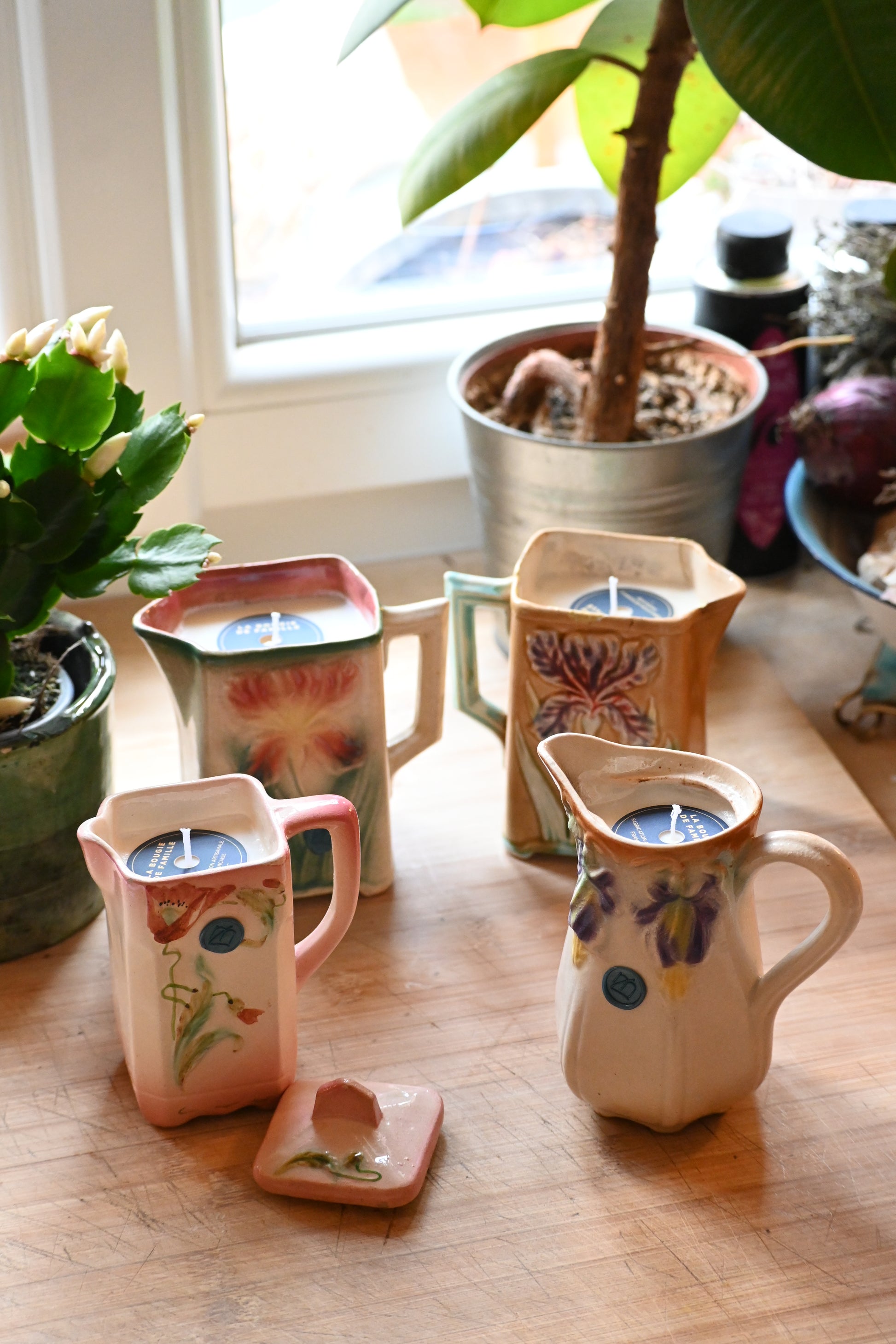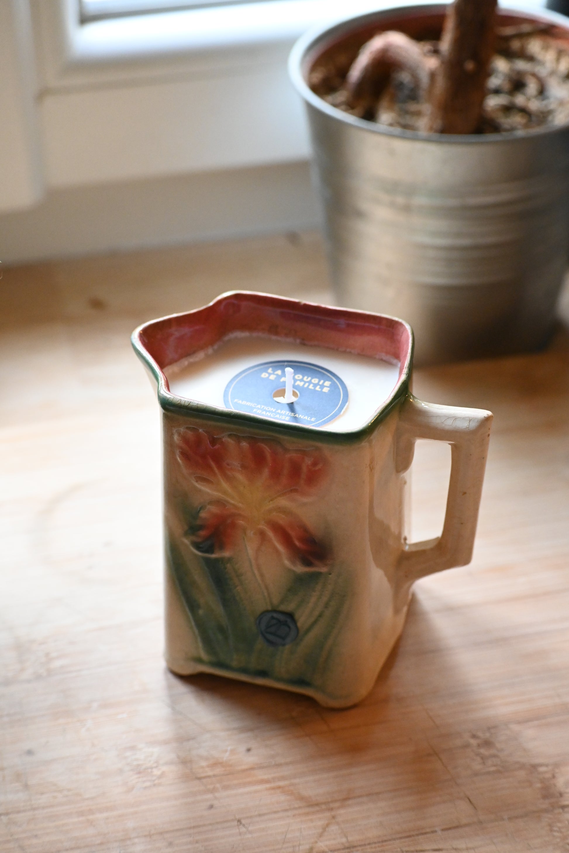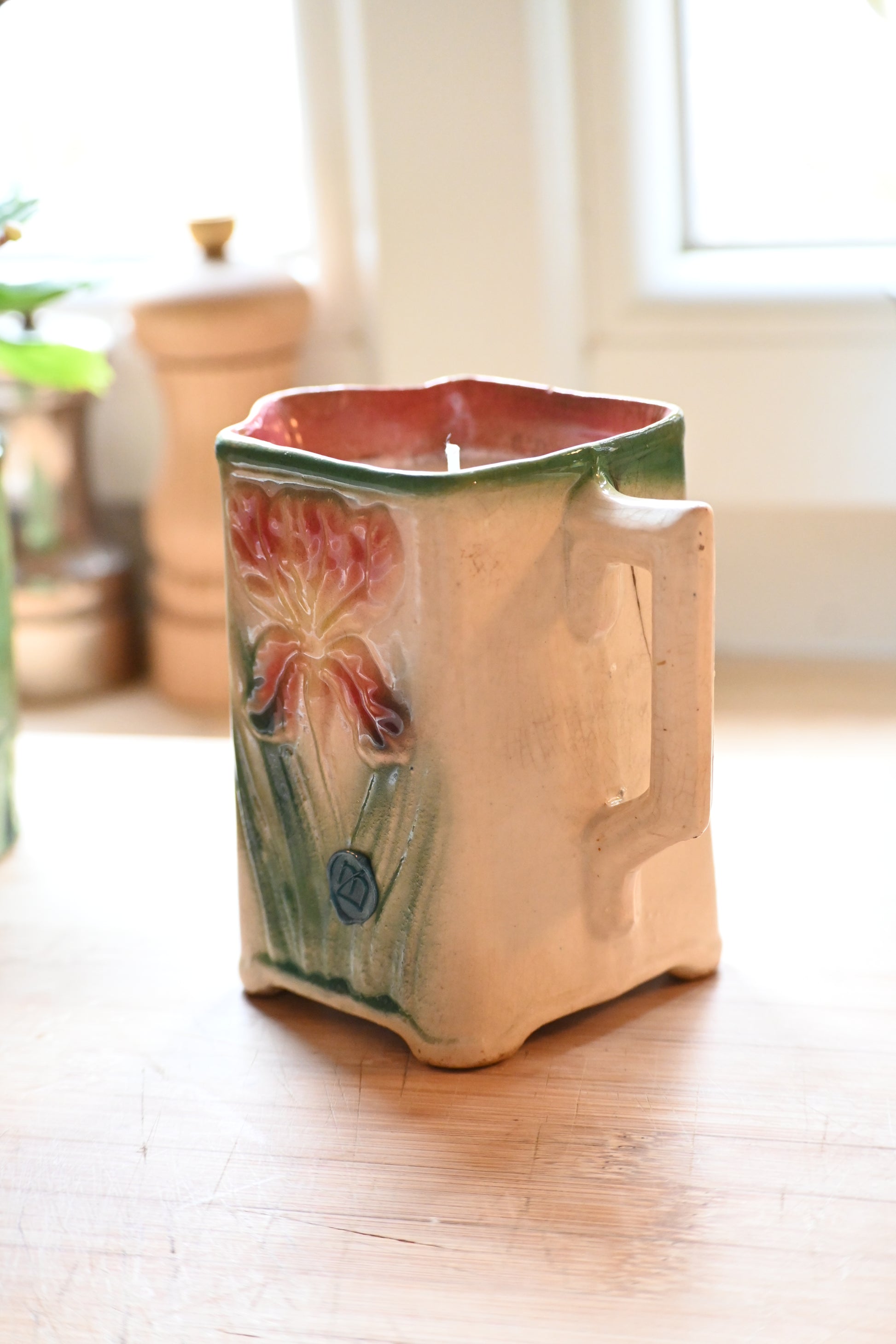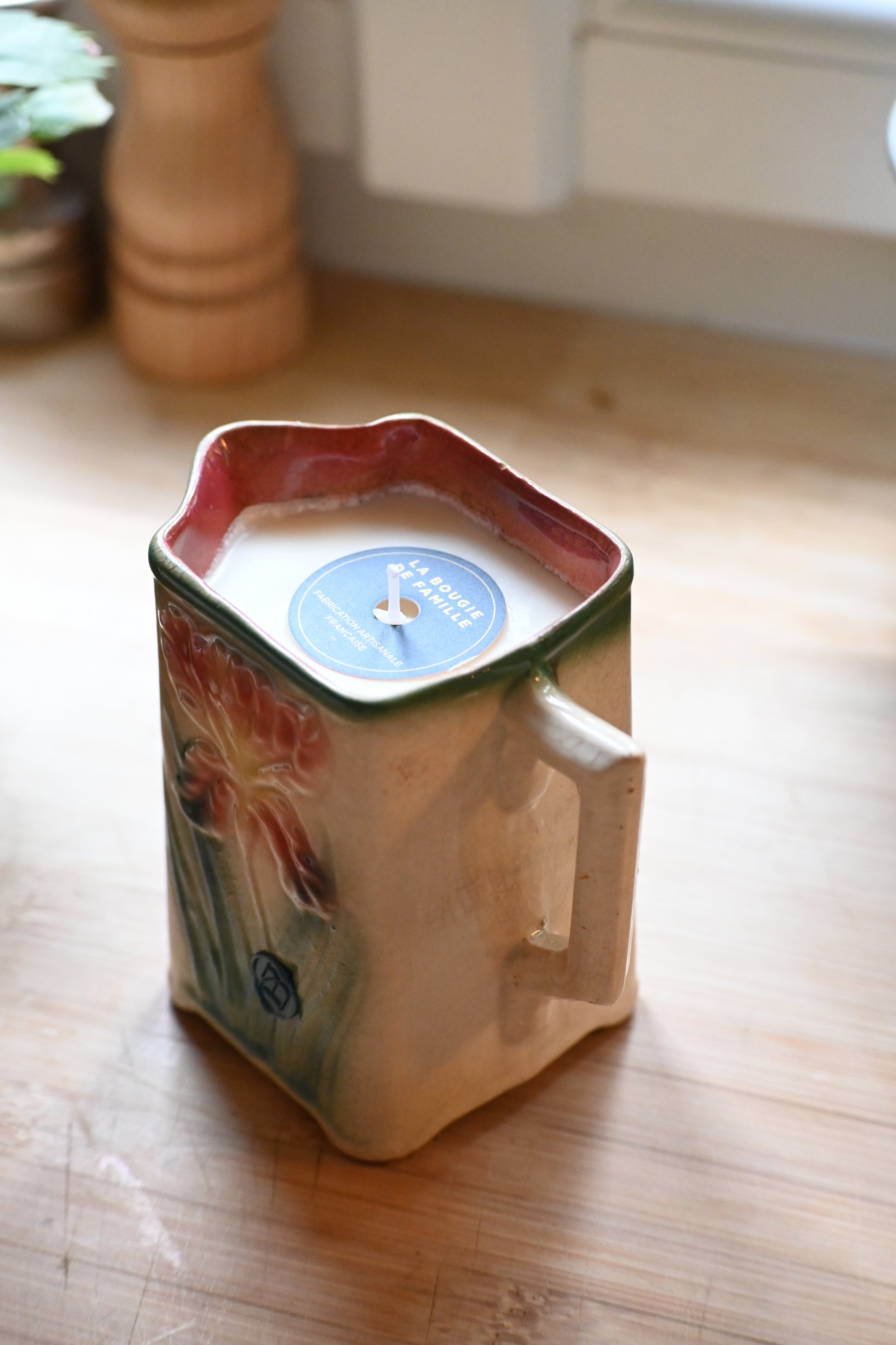 Bougie coulée dans un pot à lait en barbotine décoré d’un iris. Une pièce rare. Il fera un petit vase parfait après avoir été consumé.