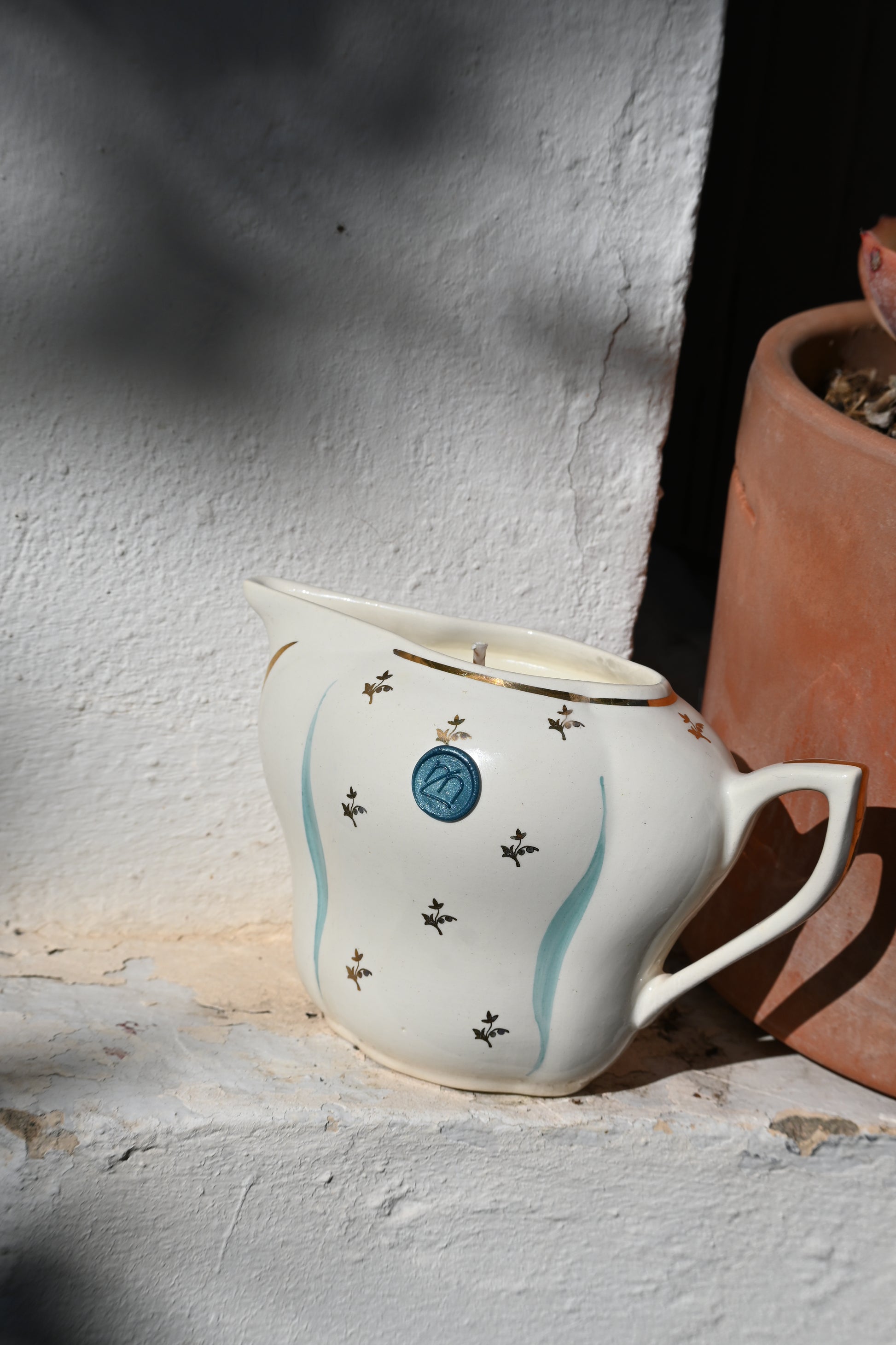 Bougie coulée dans un pot à lait bleu et doré. Une fois votre bougie terminée il se transformera en joli petit vase.