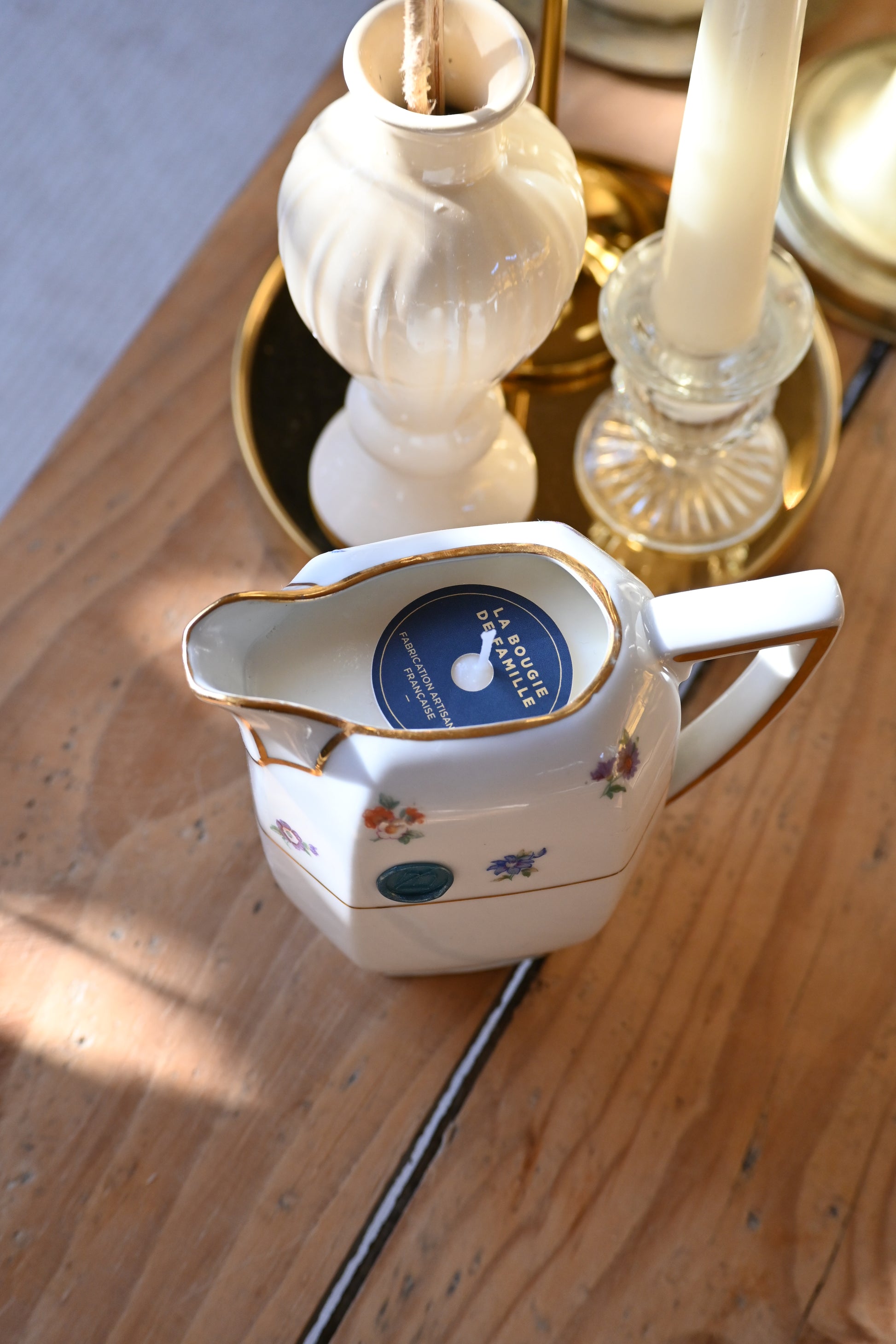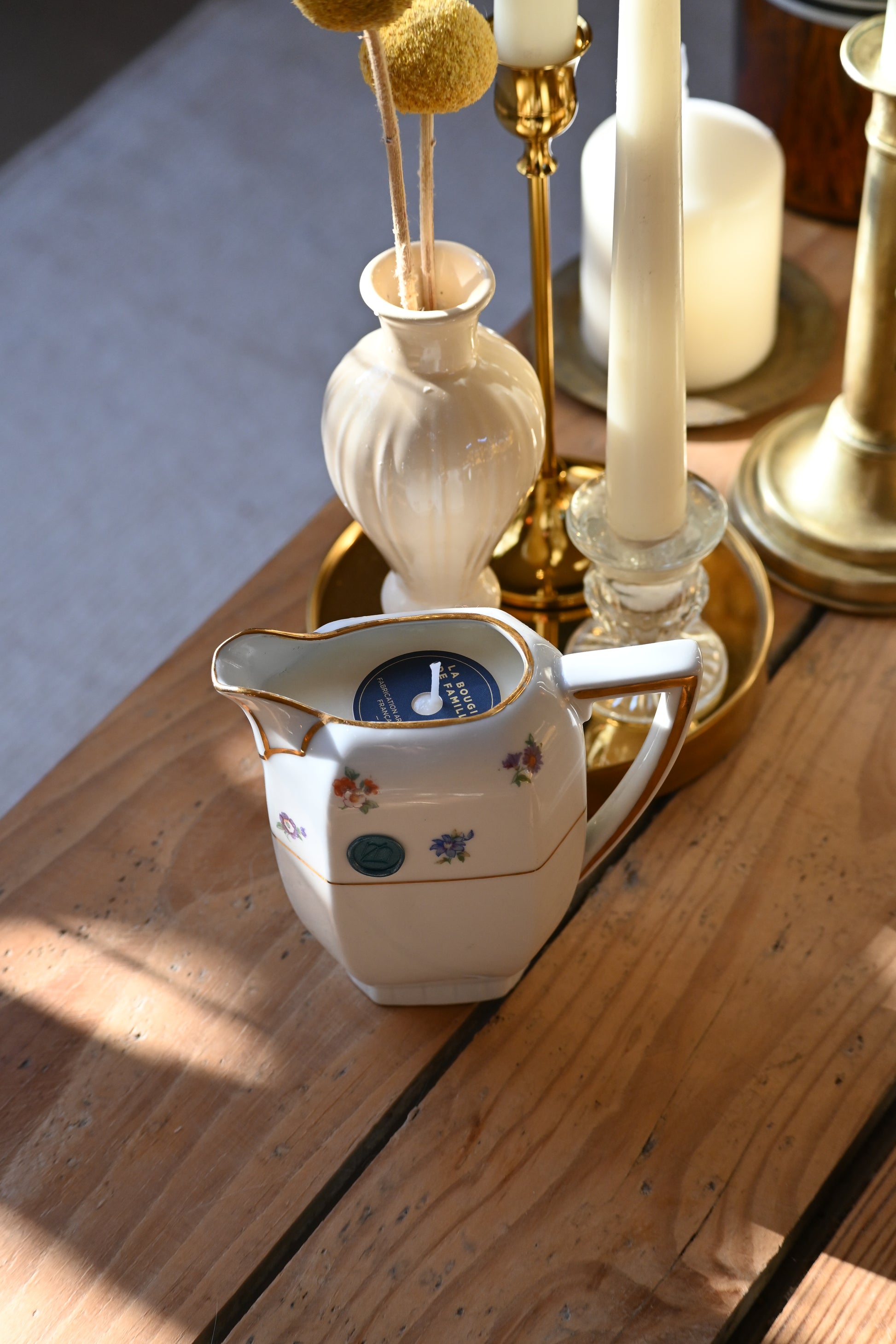 Bougie coulée dans un pot à lait blanc décoré de petites fleurs et d’un liseré doré. Il fera un petit vase parfait après avoir été consumé.