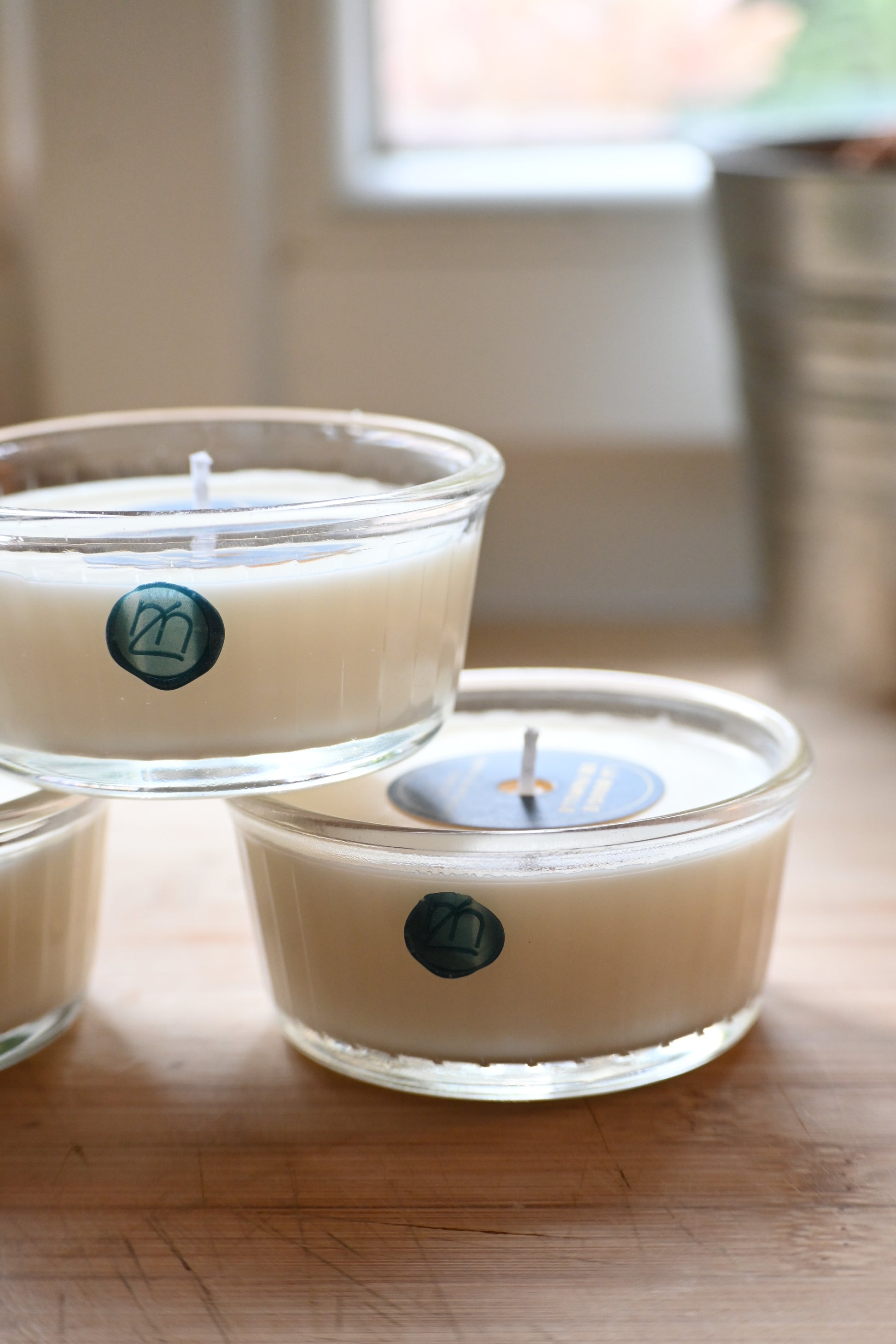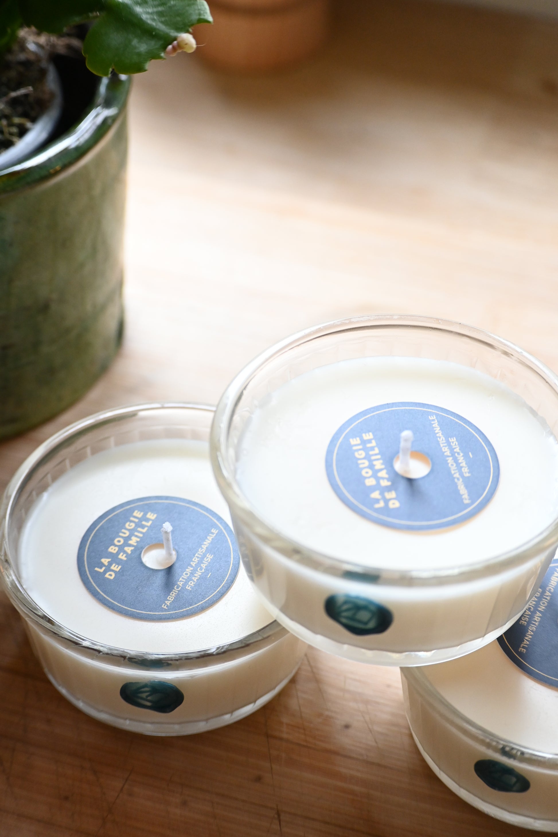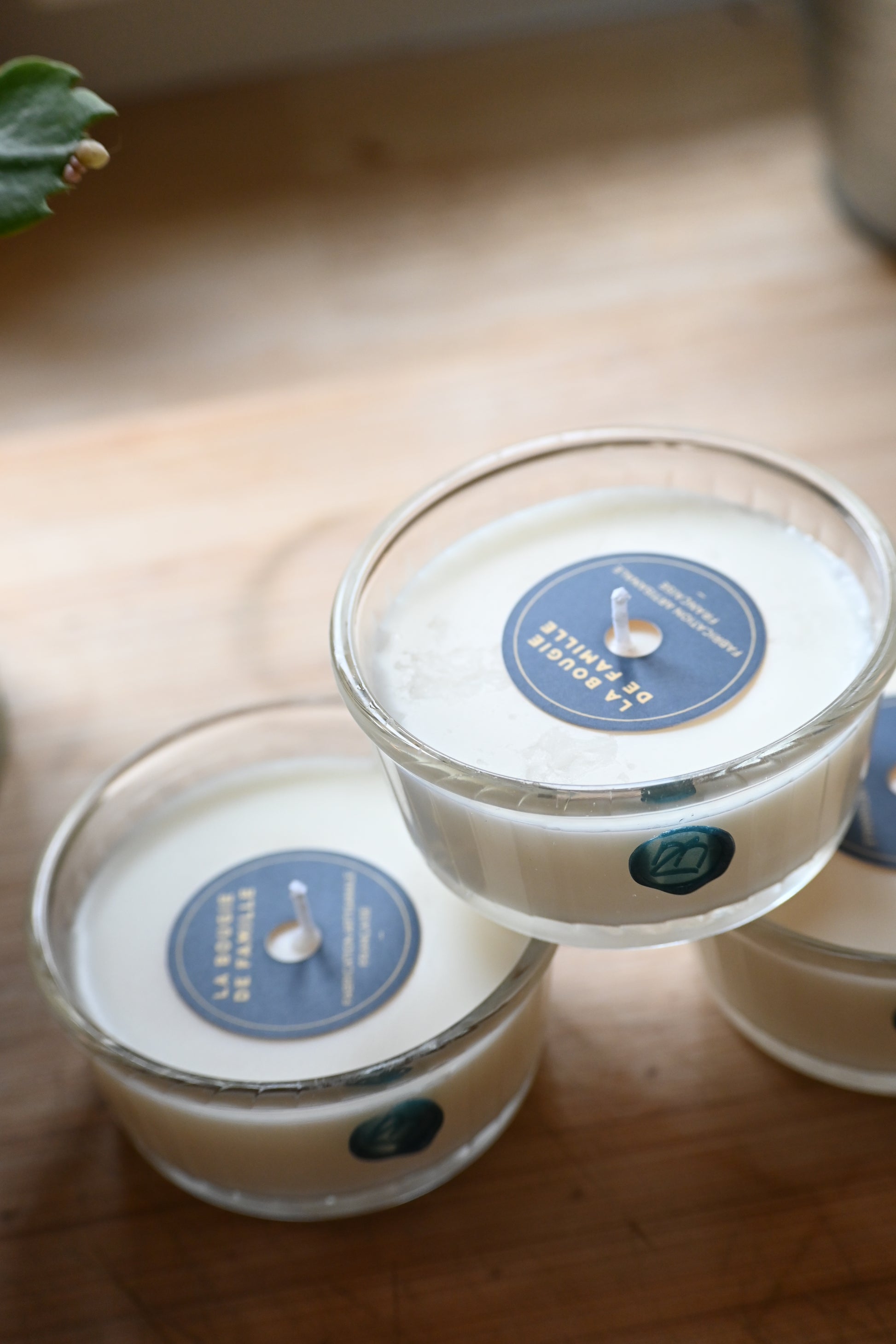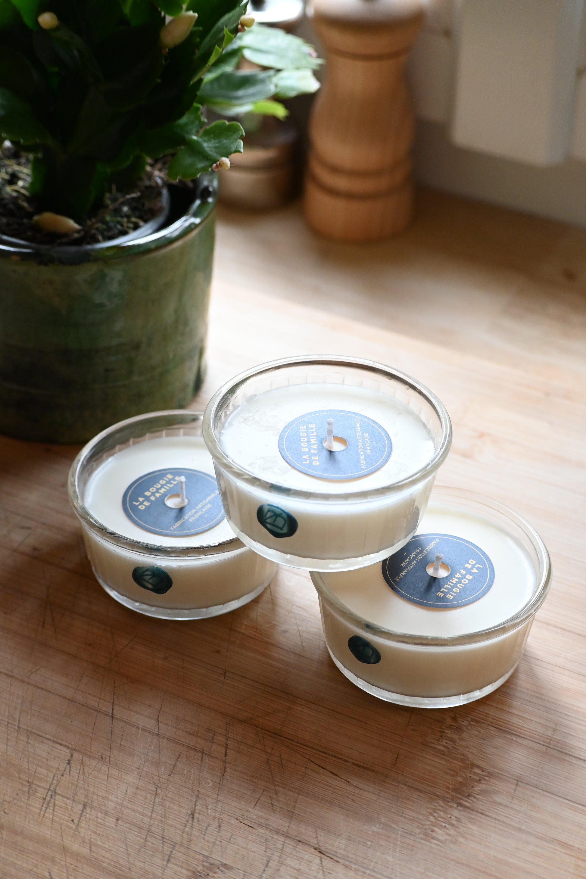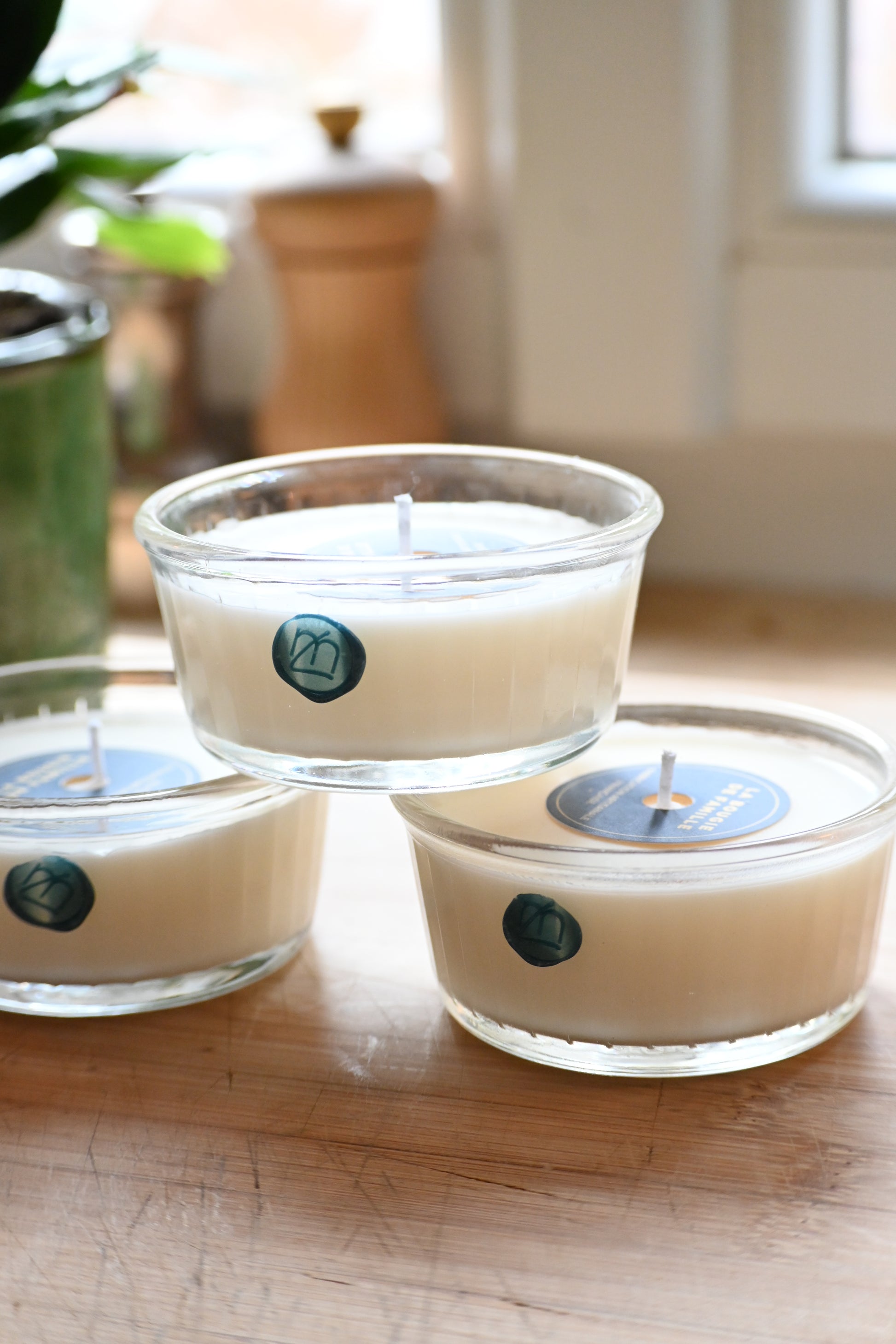 Bougie coulée dans un ramequin ocre. Ce contenant est un incontournable des 70's, nostalgie assurée avec cette bougie aux couleurs pop!