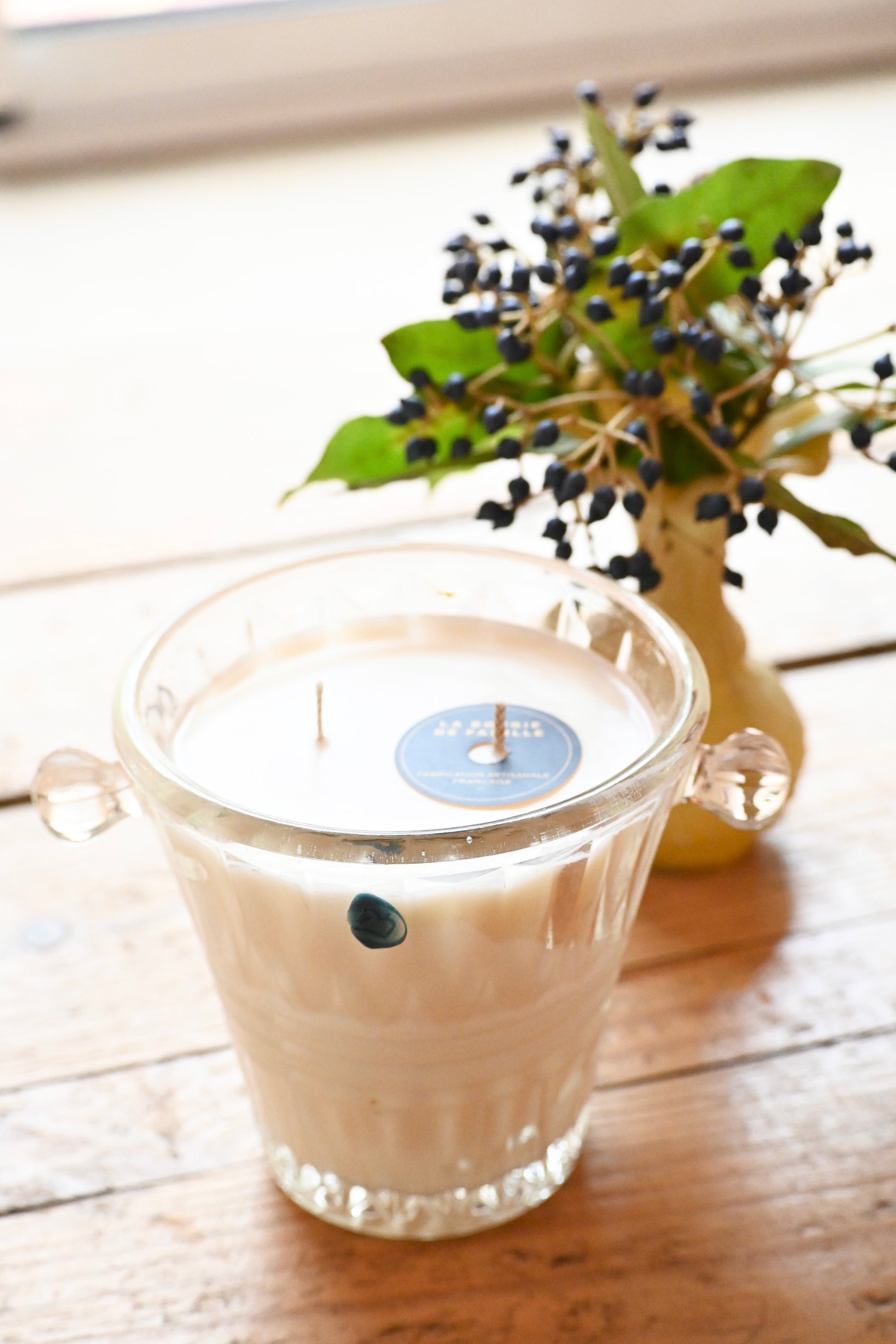 Bougie coulée dans un seau à glace en verre ciselé. Une pièce qui embellira vos jolies soirées.