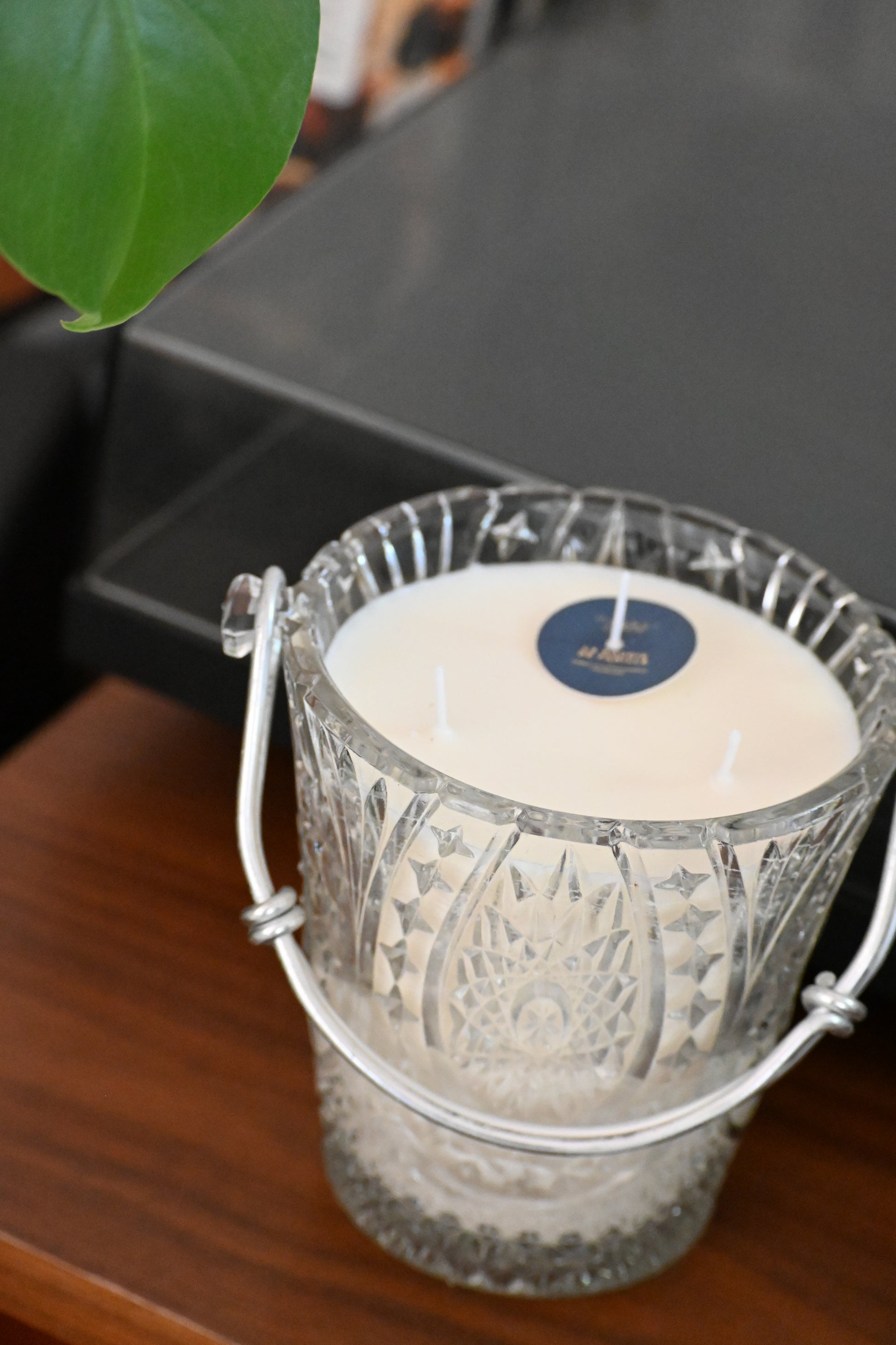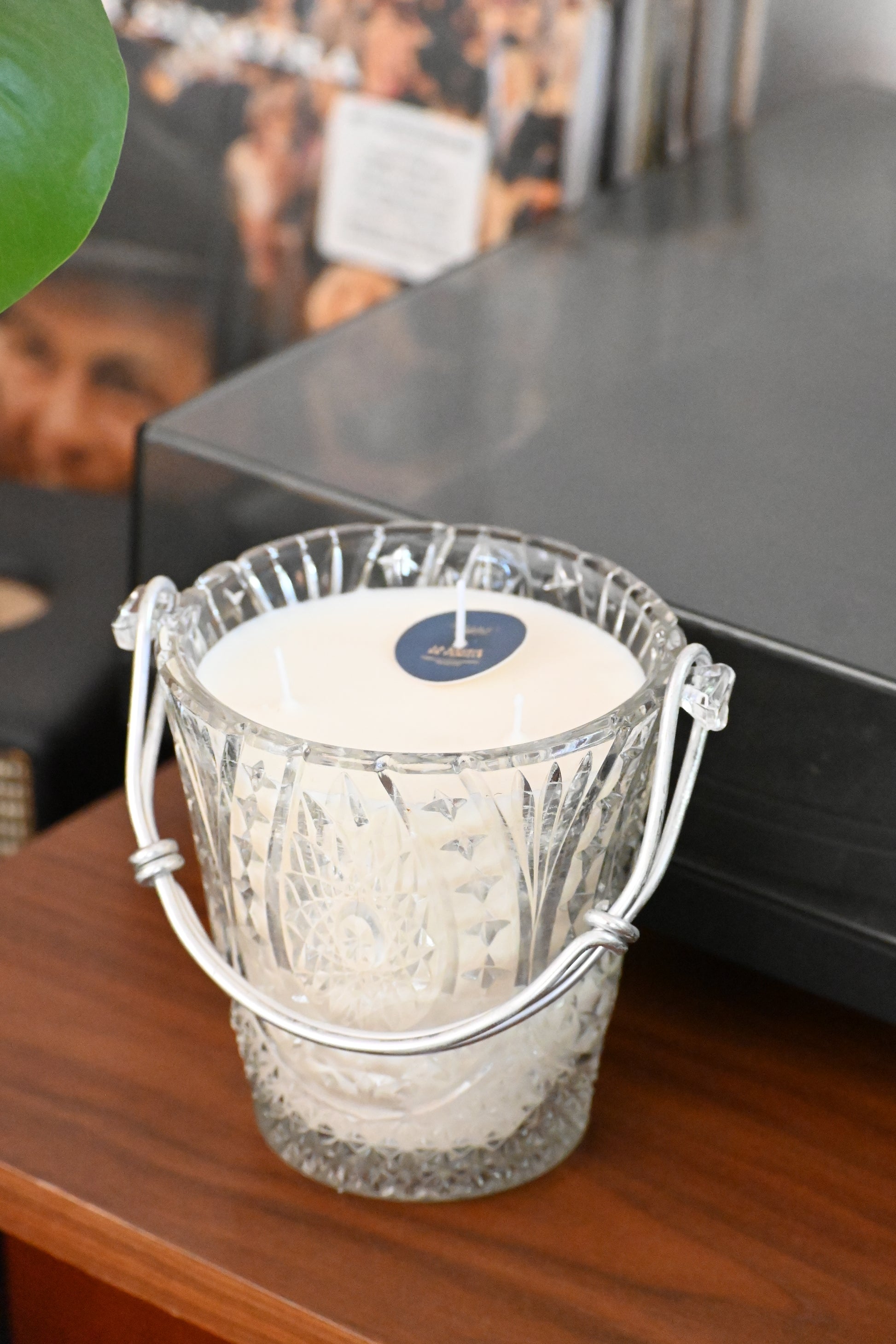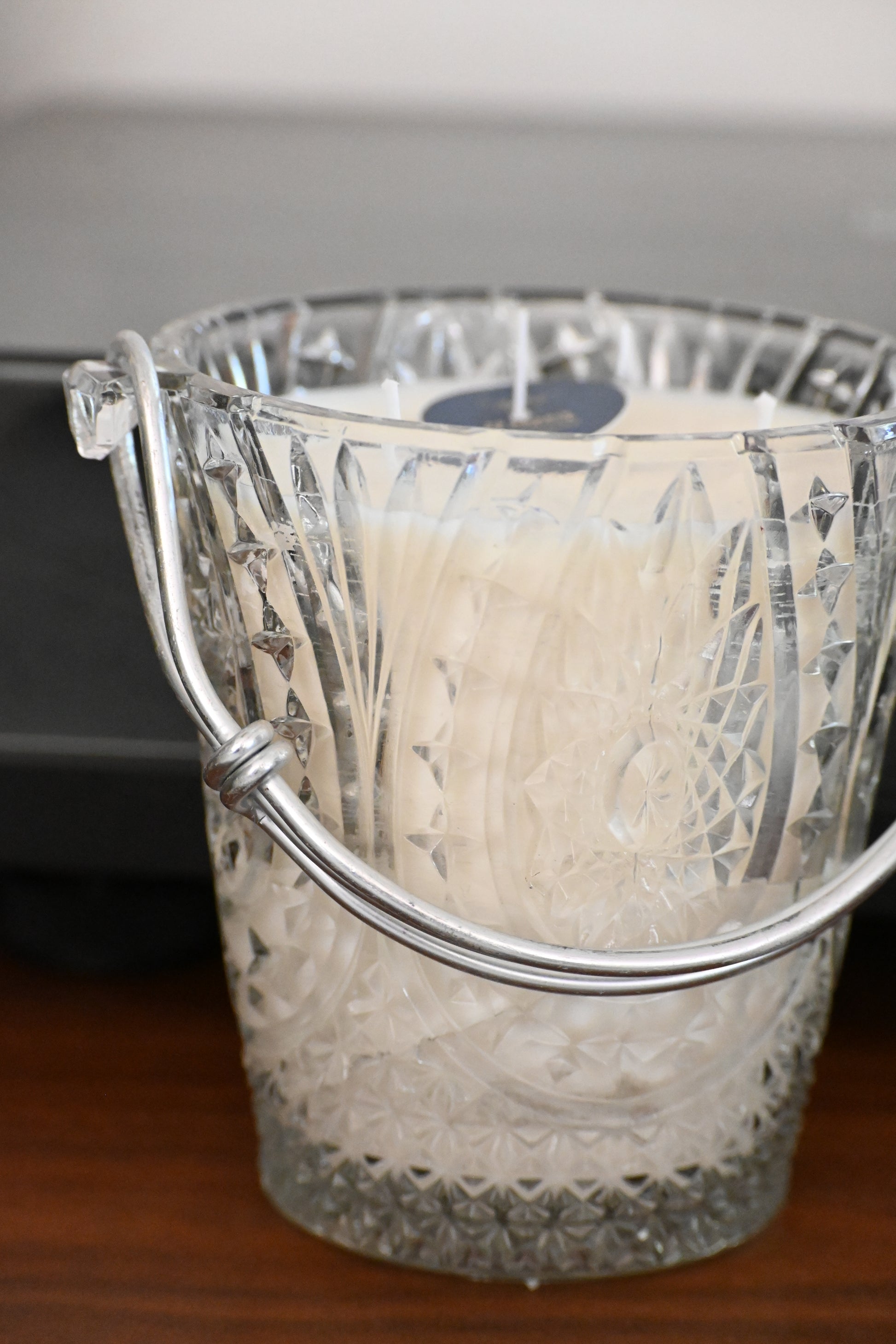 Bougie coulée dans un seau à glace en verre ciselé muni d'une anse argentée. Une pièce qui embellira vos jolies soirées.