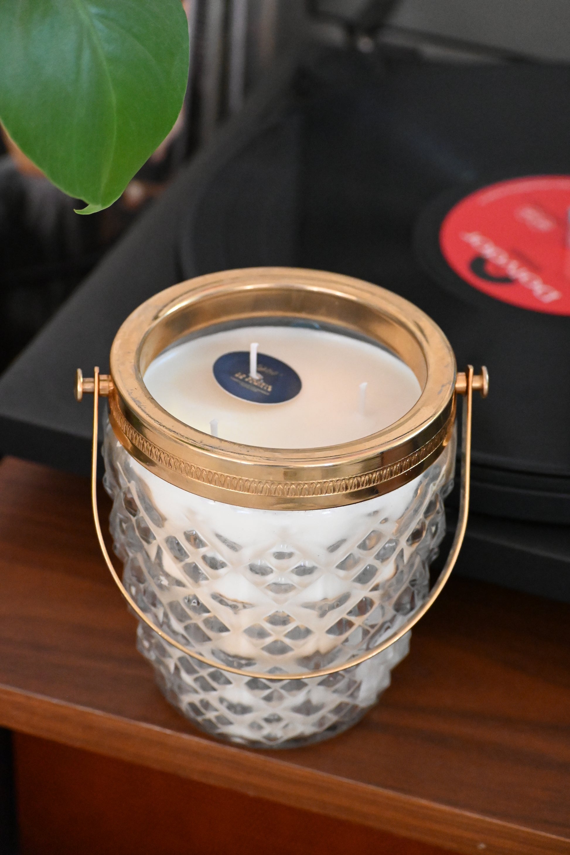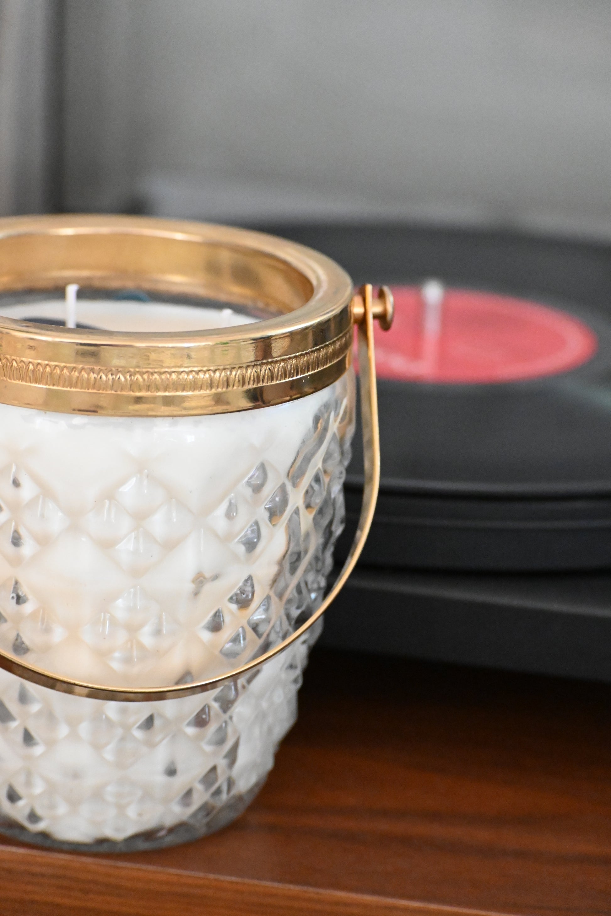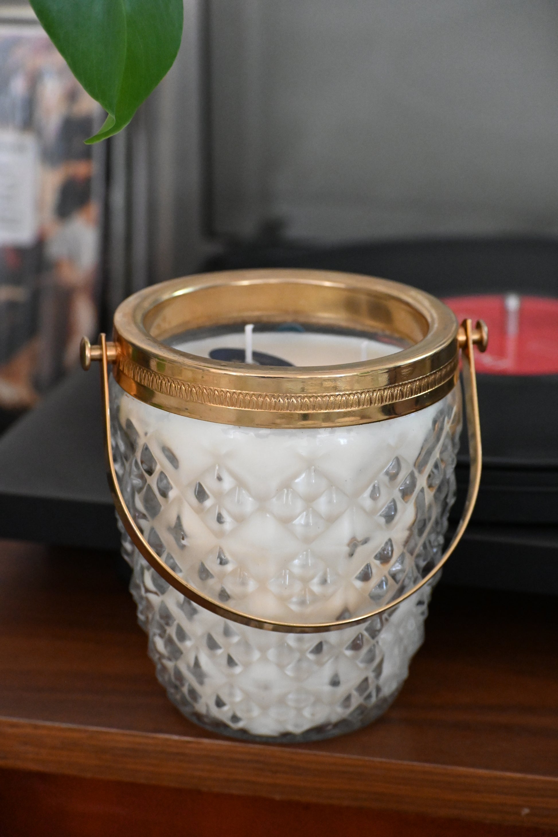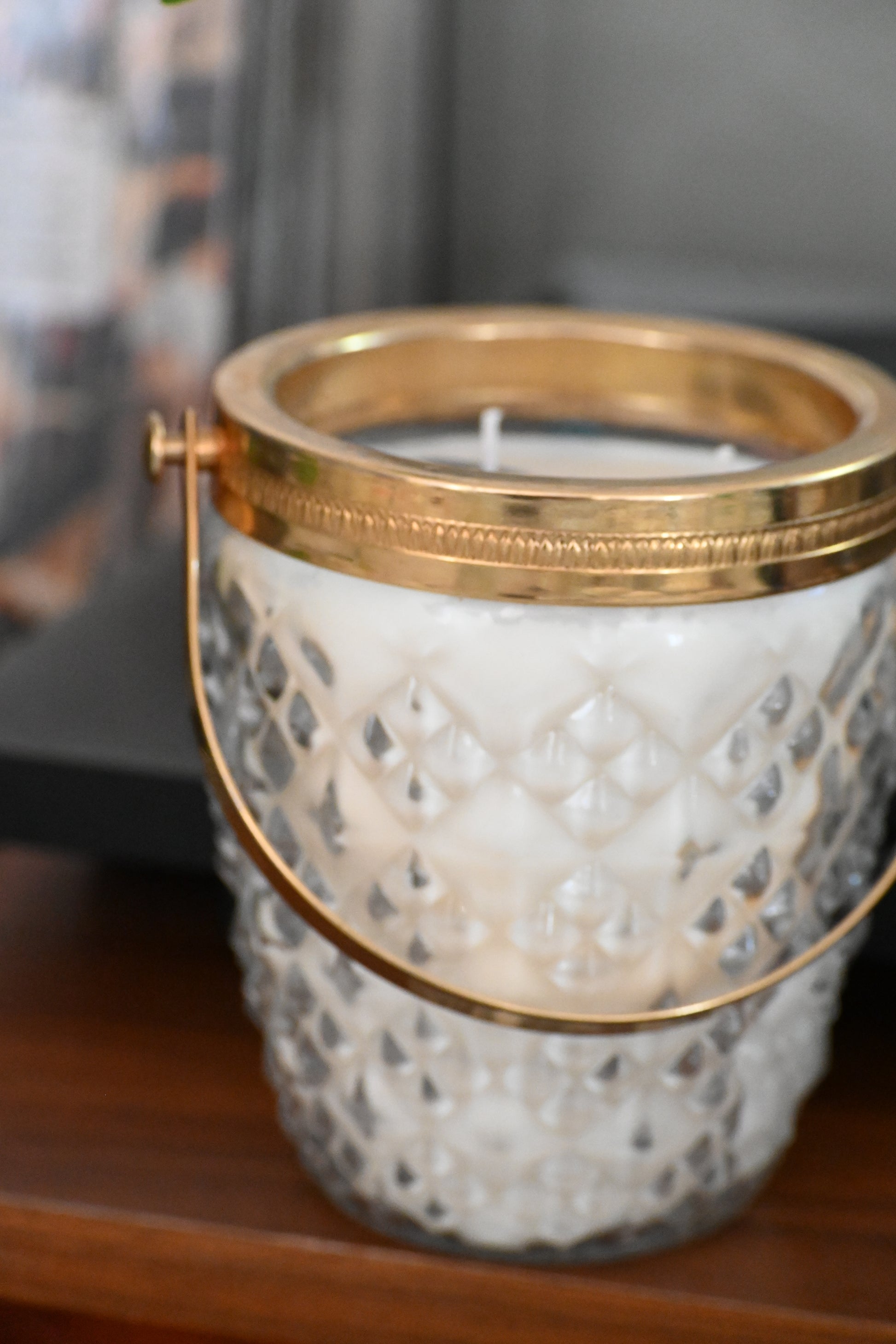 Bougie coulée dans un seau à glace en verre ciselé muni d'une anse dorée. Une pièce qui embellira vos jolies soirées.