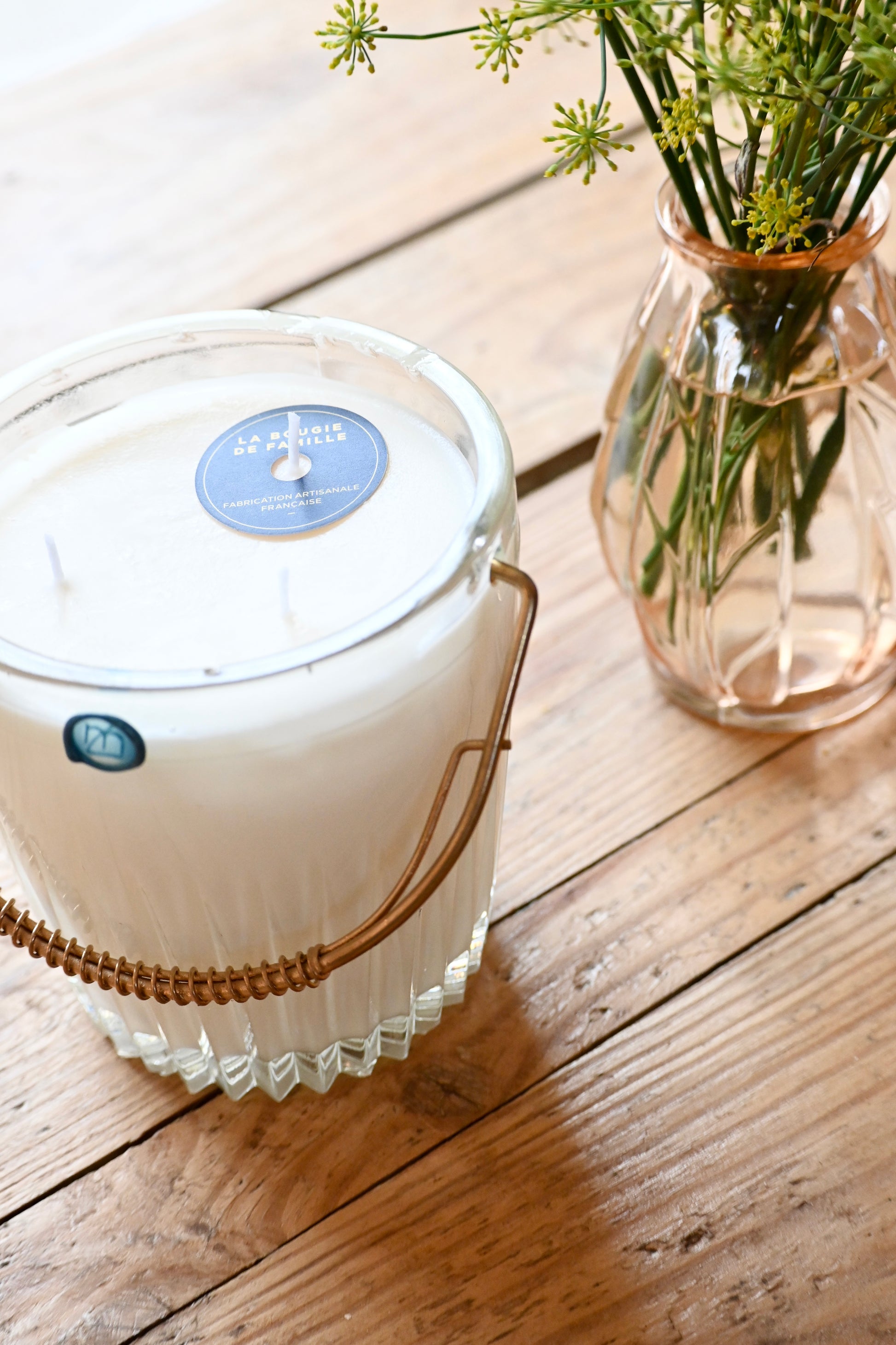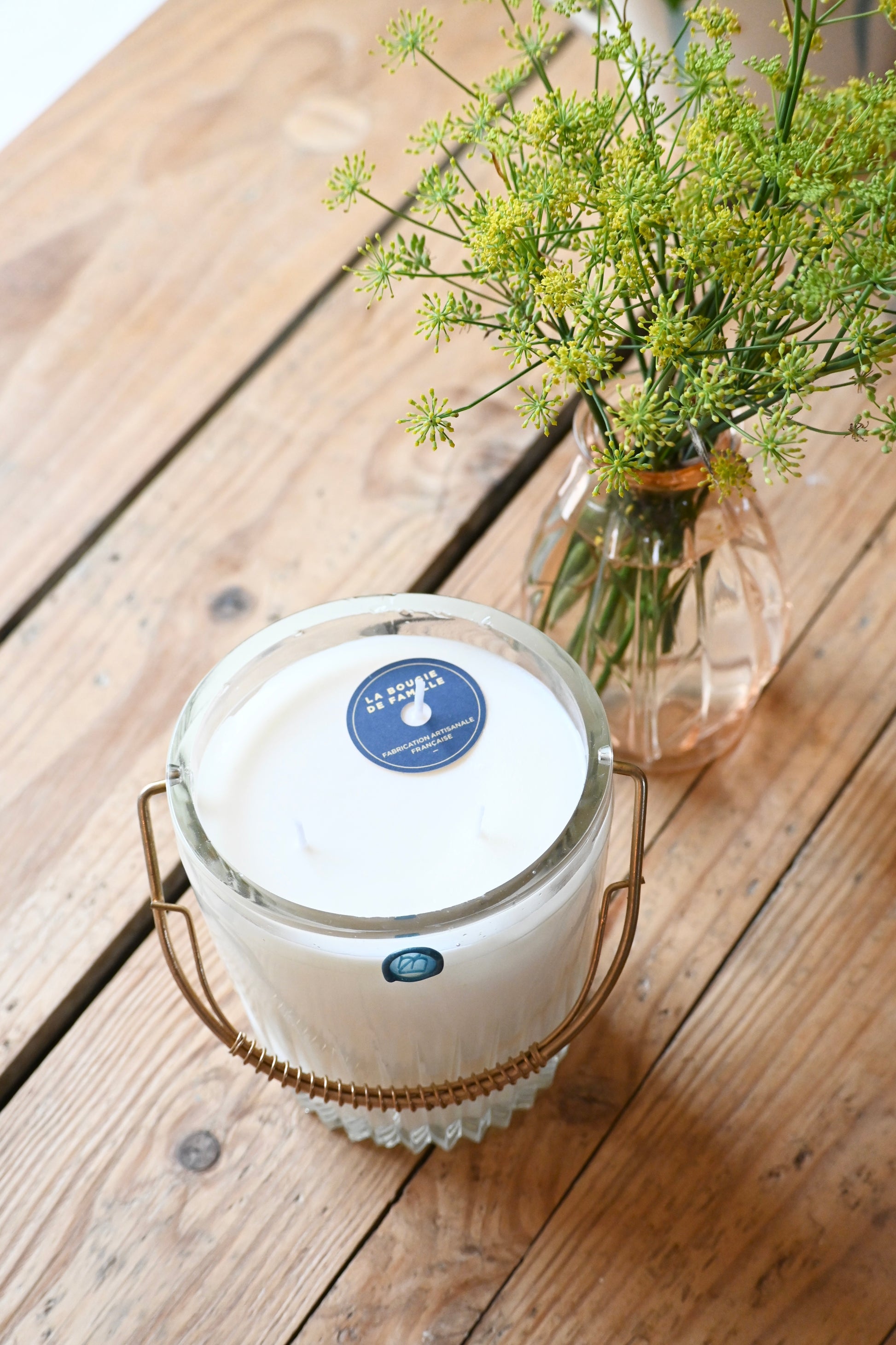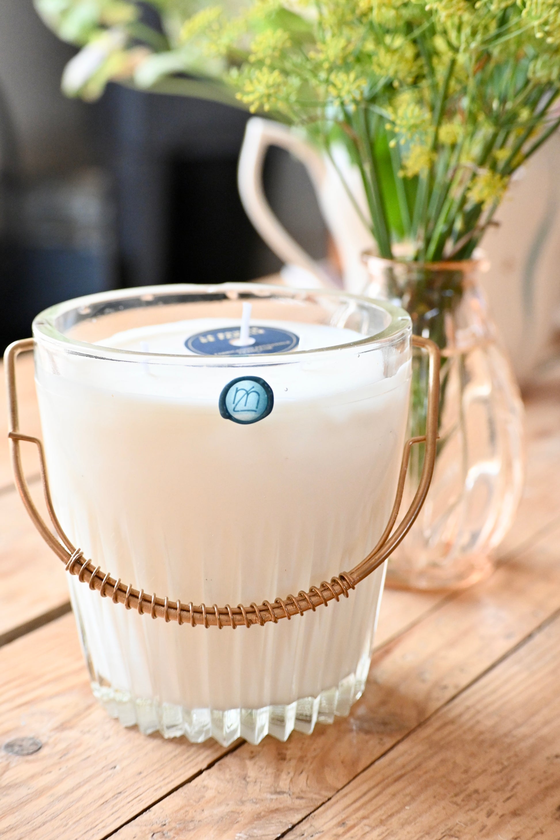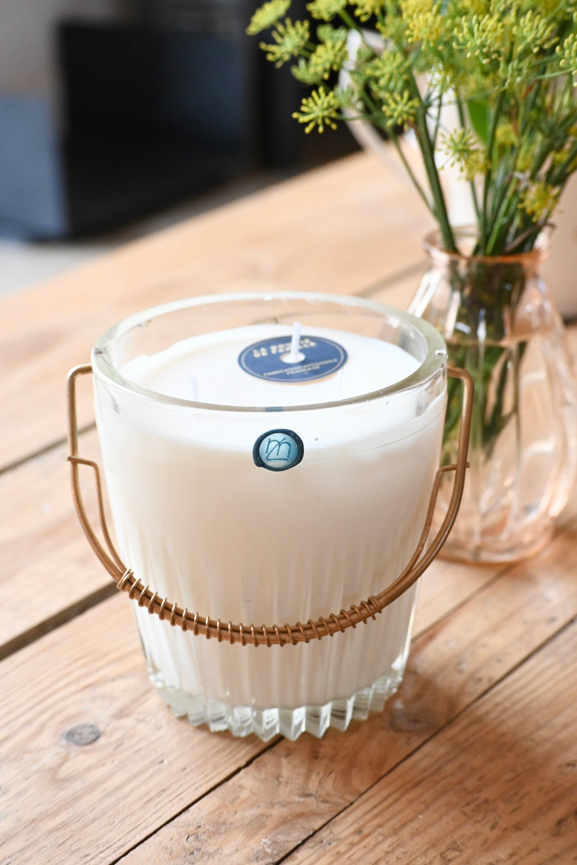 Bougie coulée dans un seau à glace en verre ciselé. Une pièce qui embellira vos jolies soirées.