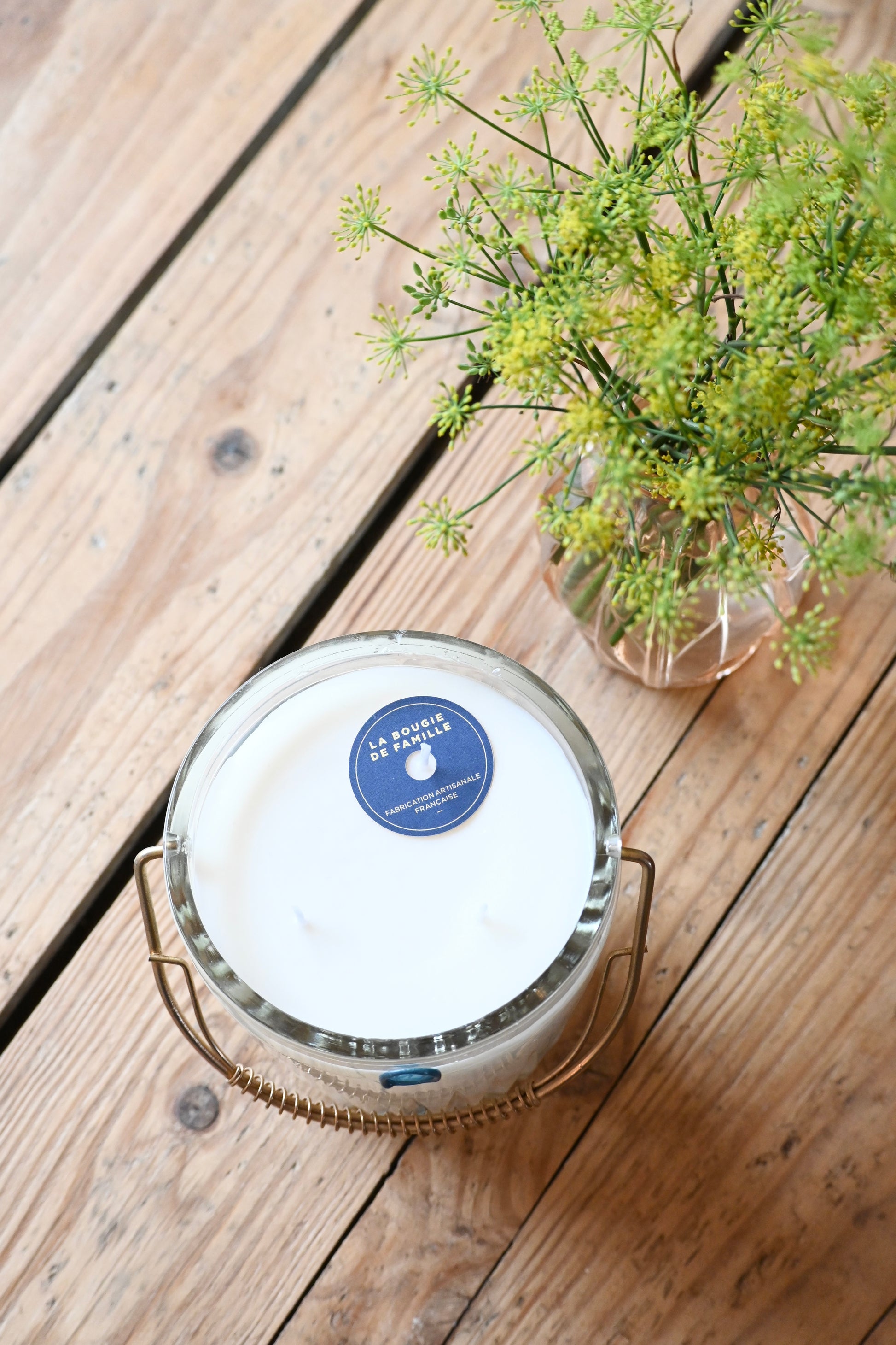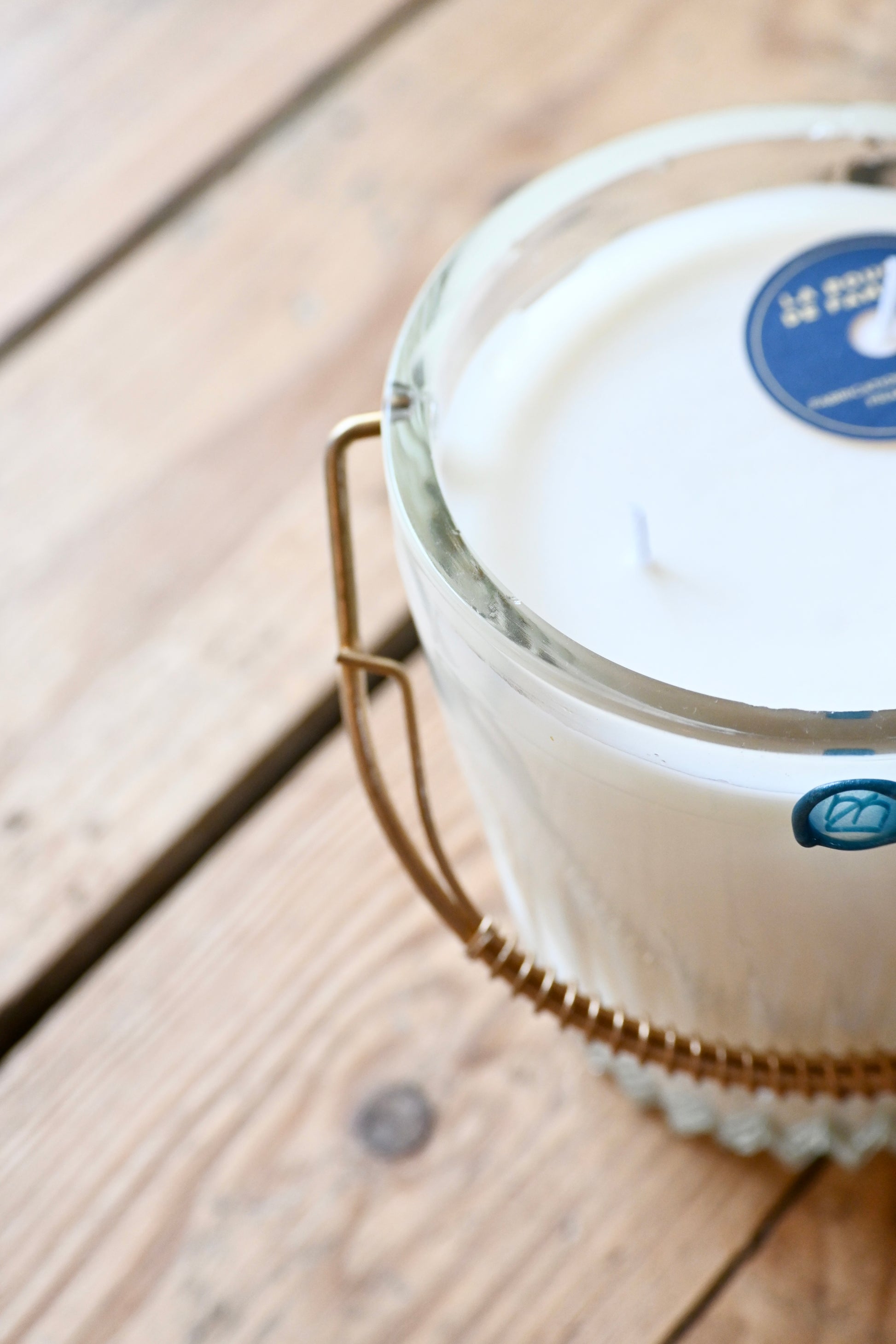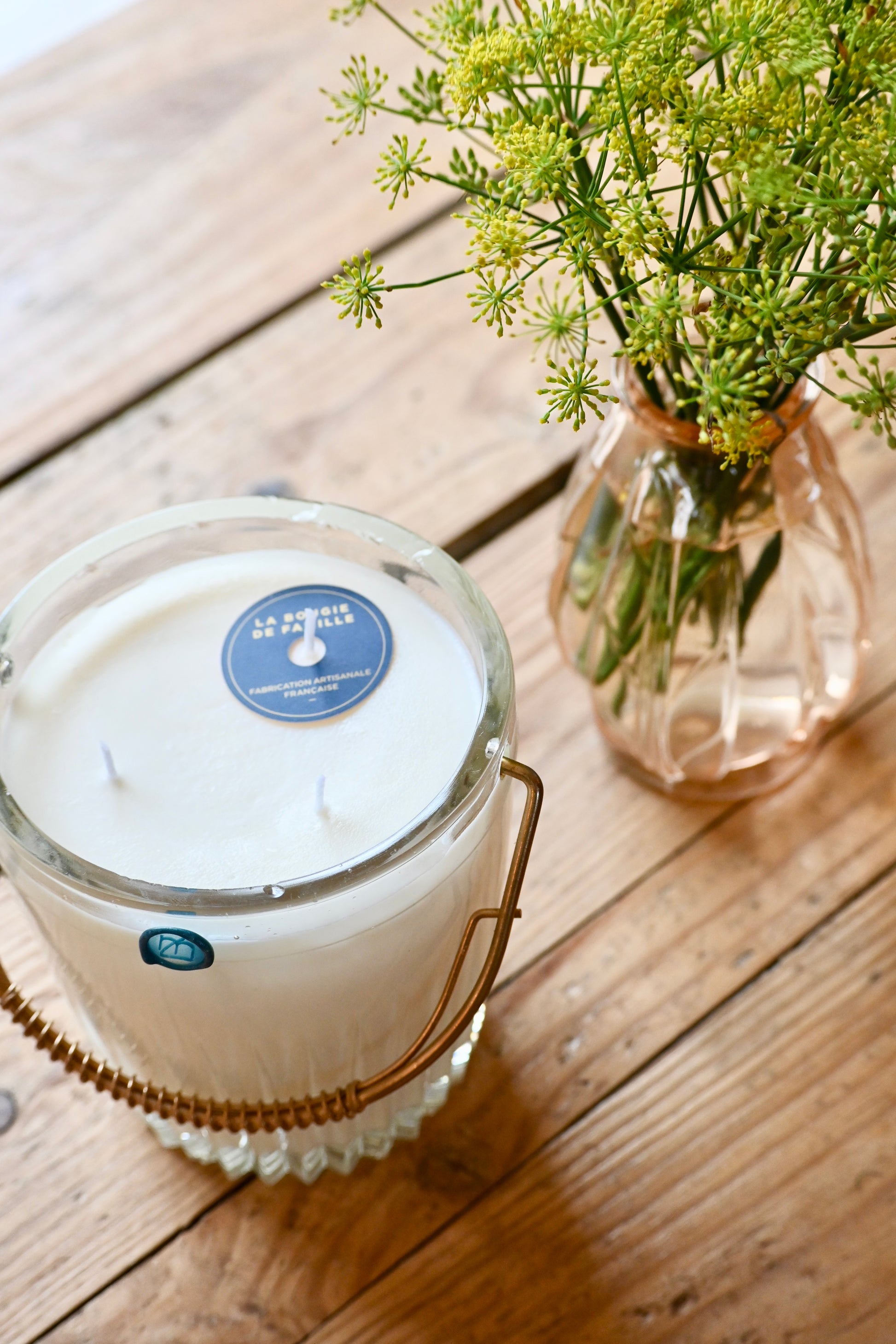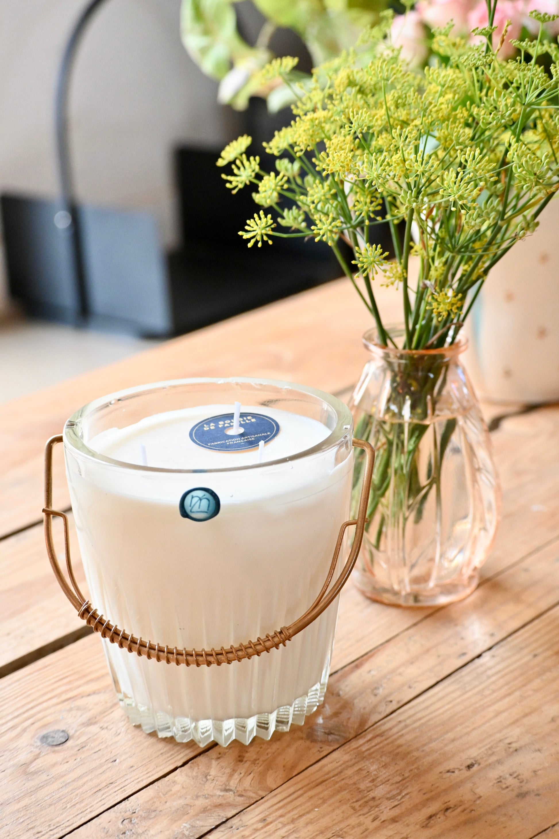 Bougie coulée dans un seau à glace en verre ciselé. Une pièce qui embellira vos jolies soirées.