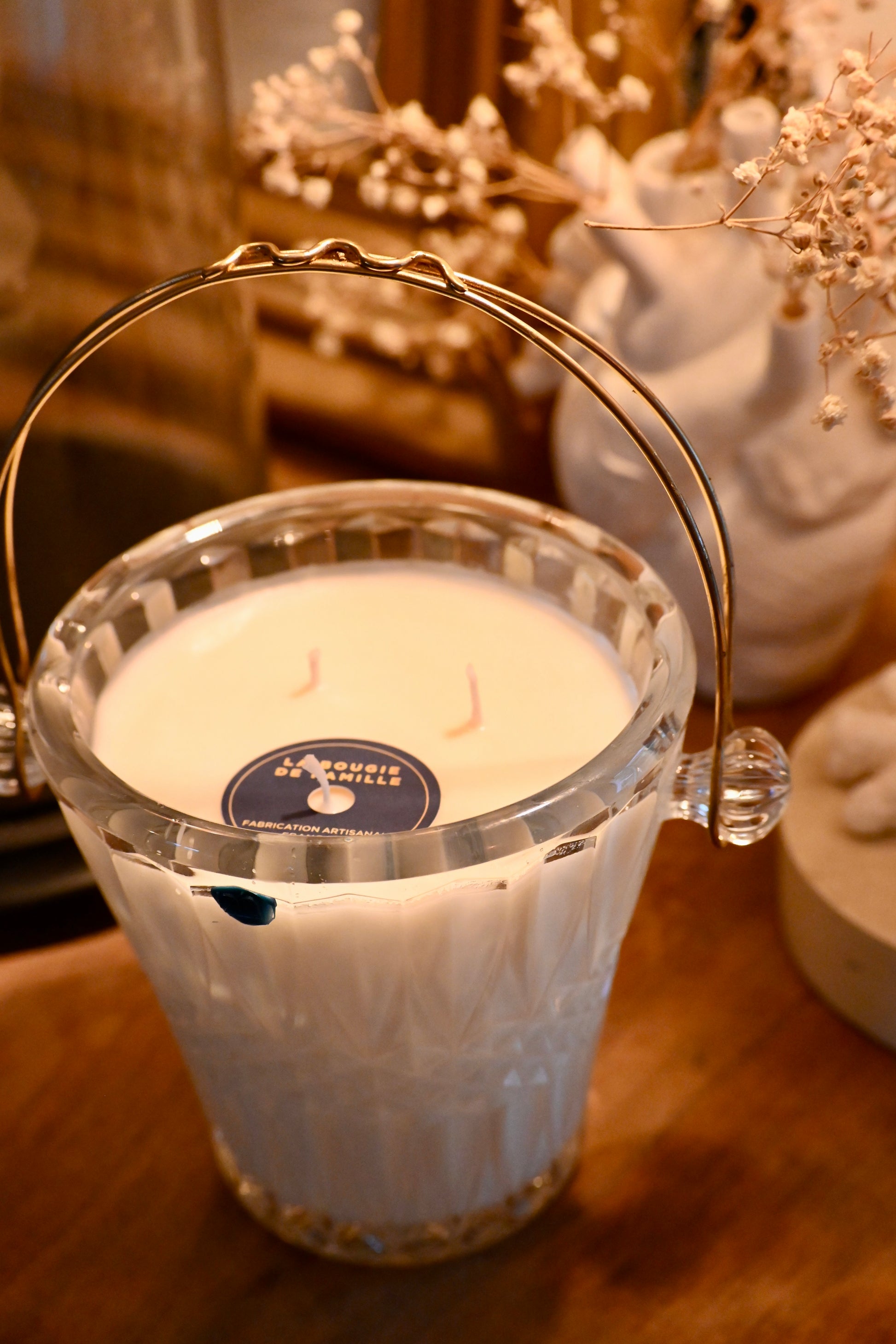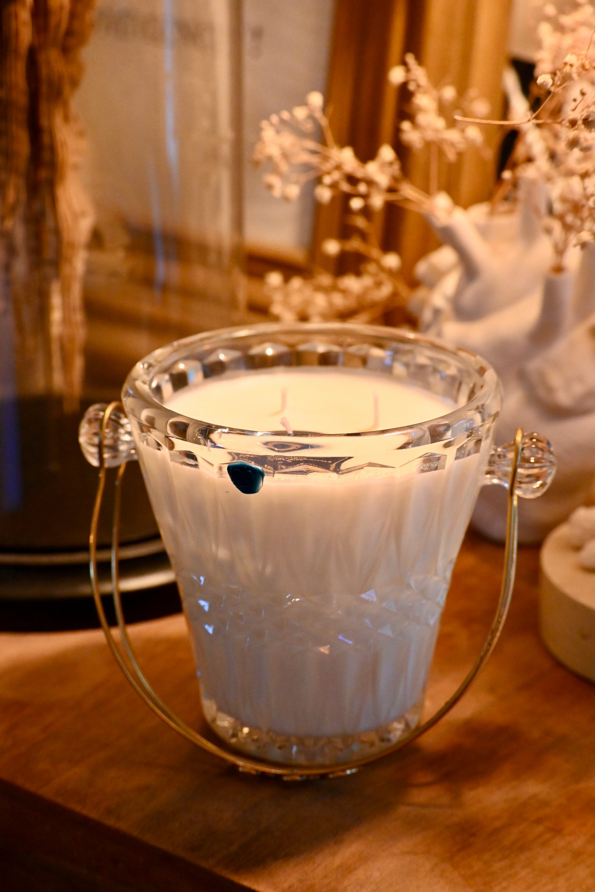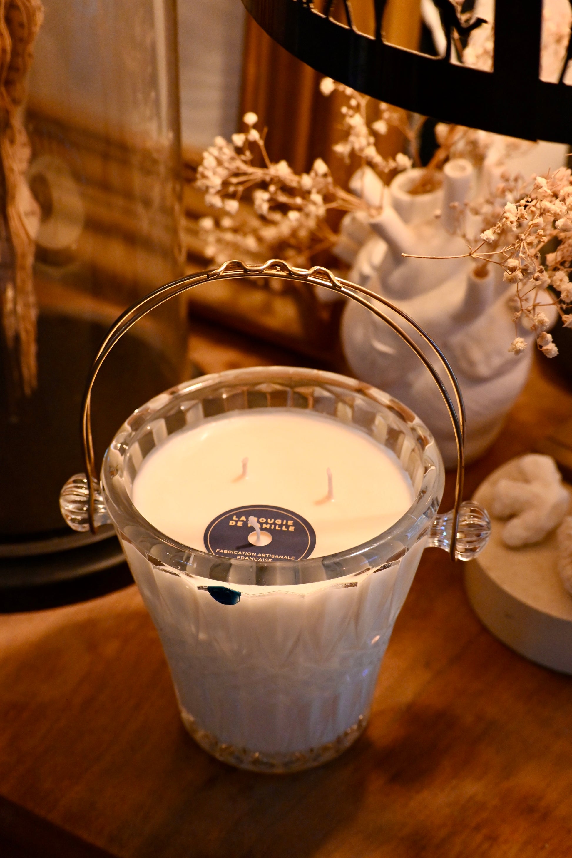 Bougie coulée dans un seau à glace en verre ciselé. Une pièce qui embellira vos jolies soirées.