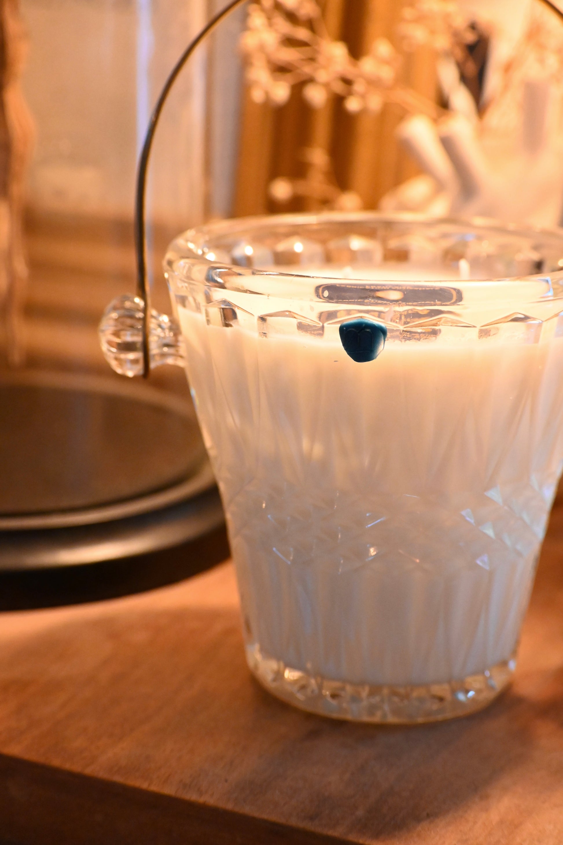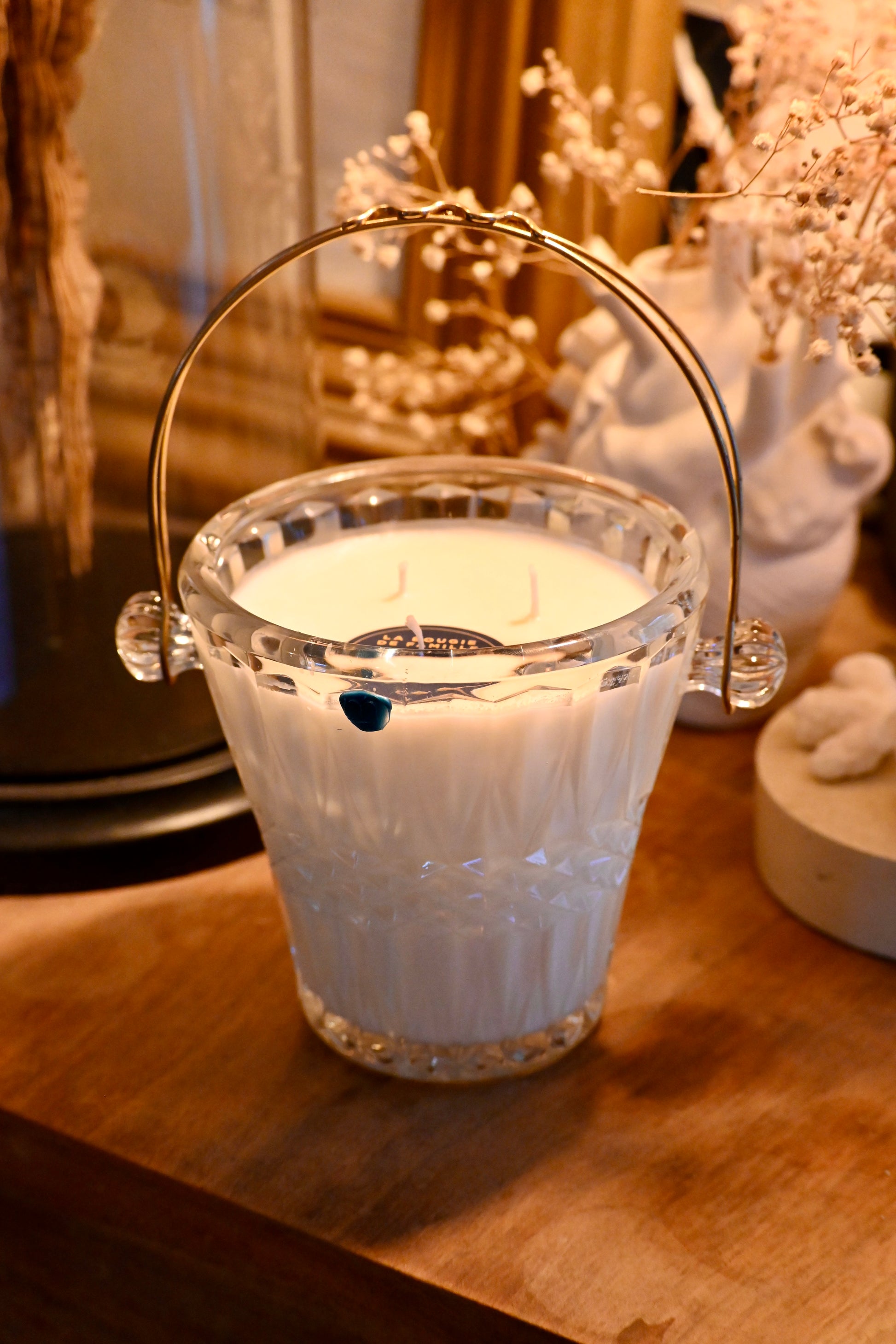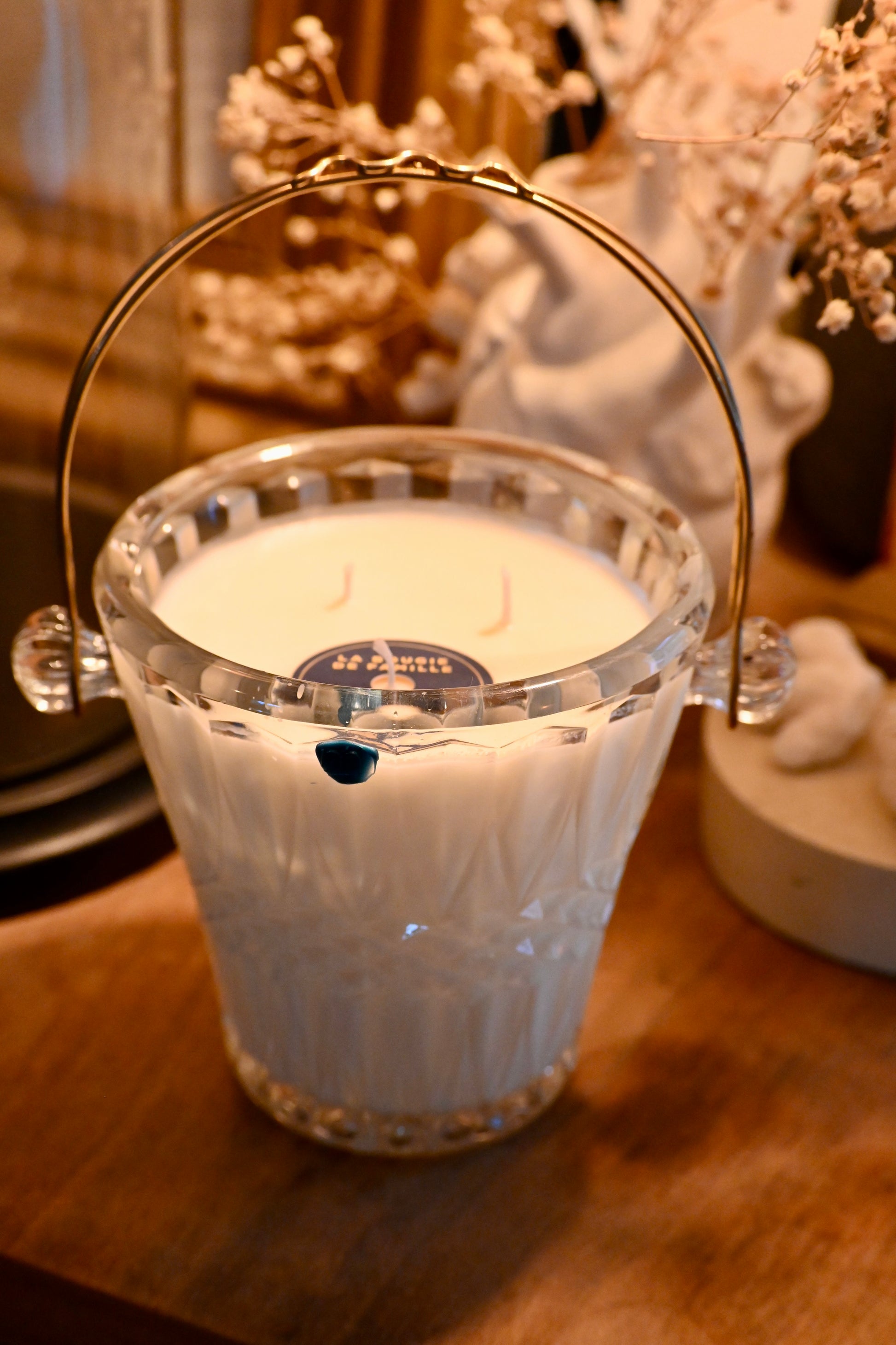 Bougie coulée dans un seau à glace en verre ciselé. Une pièce qui embellira vos jolies soirées.
