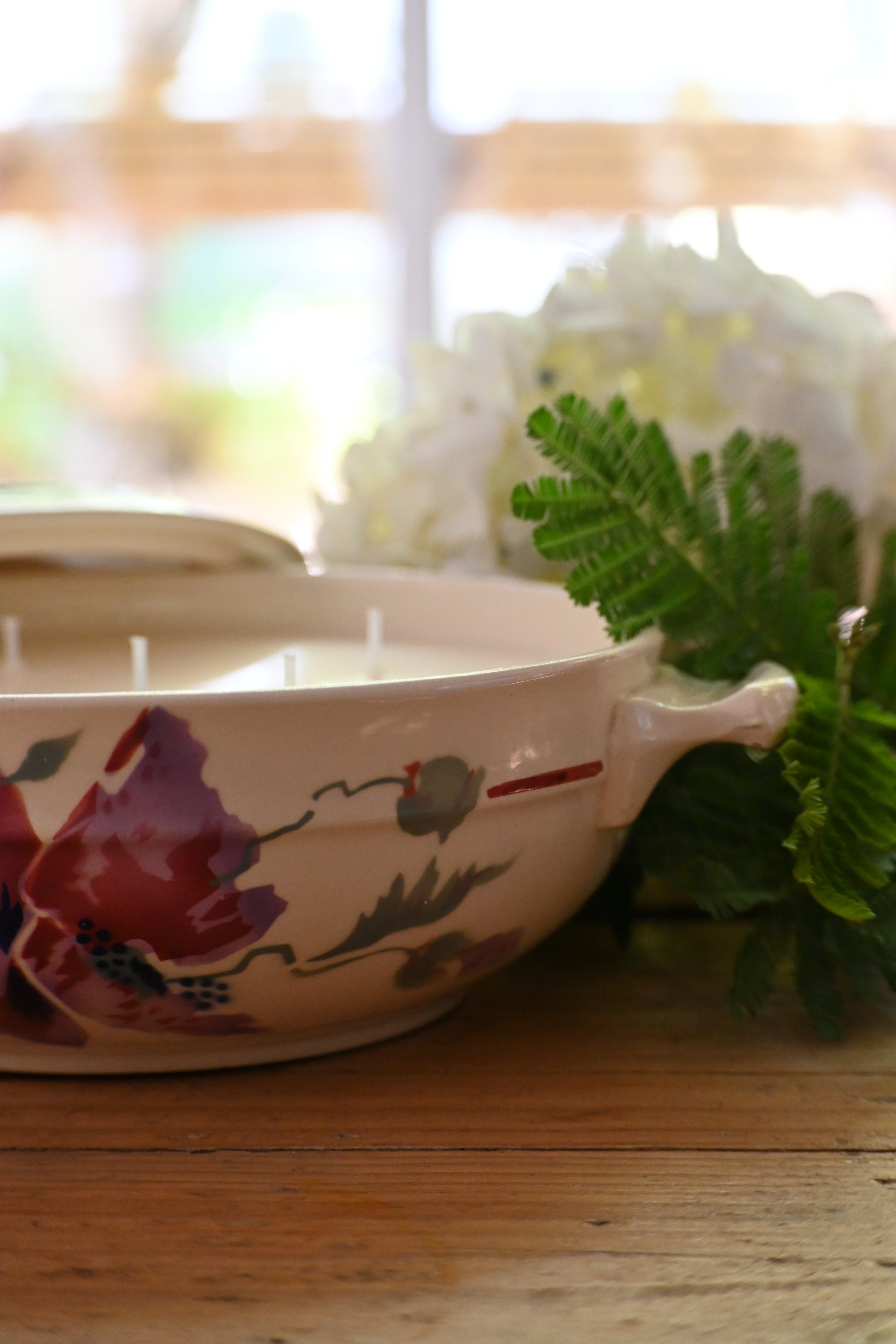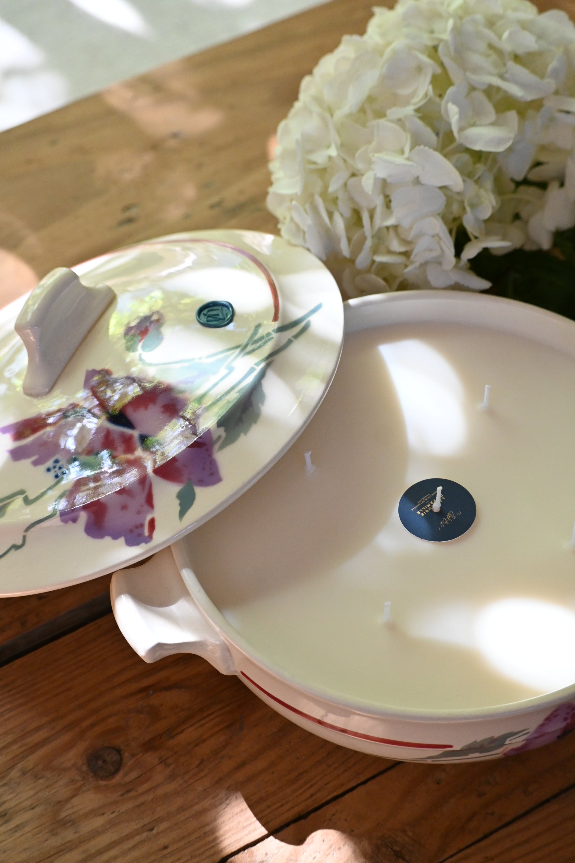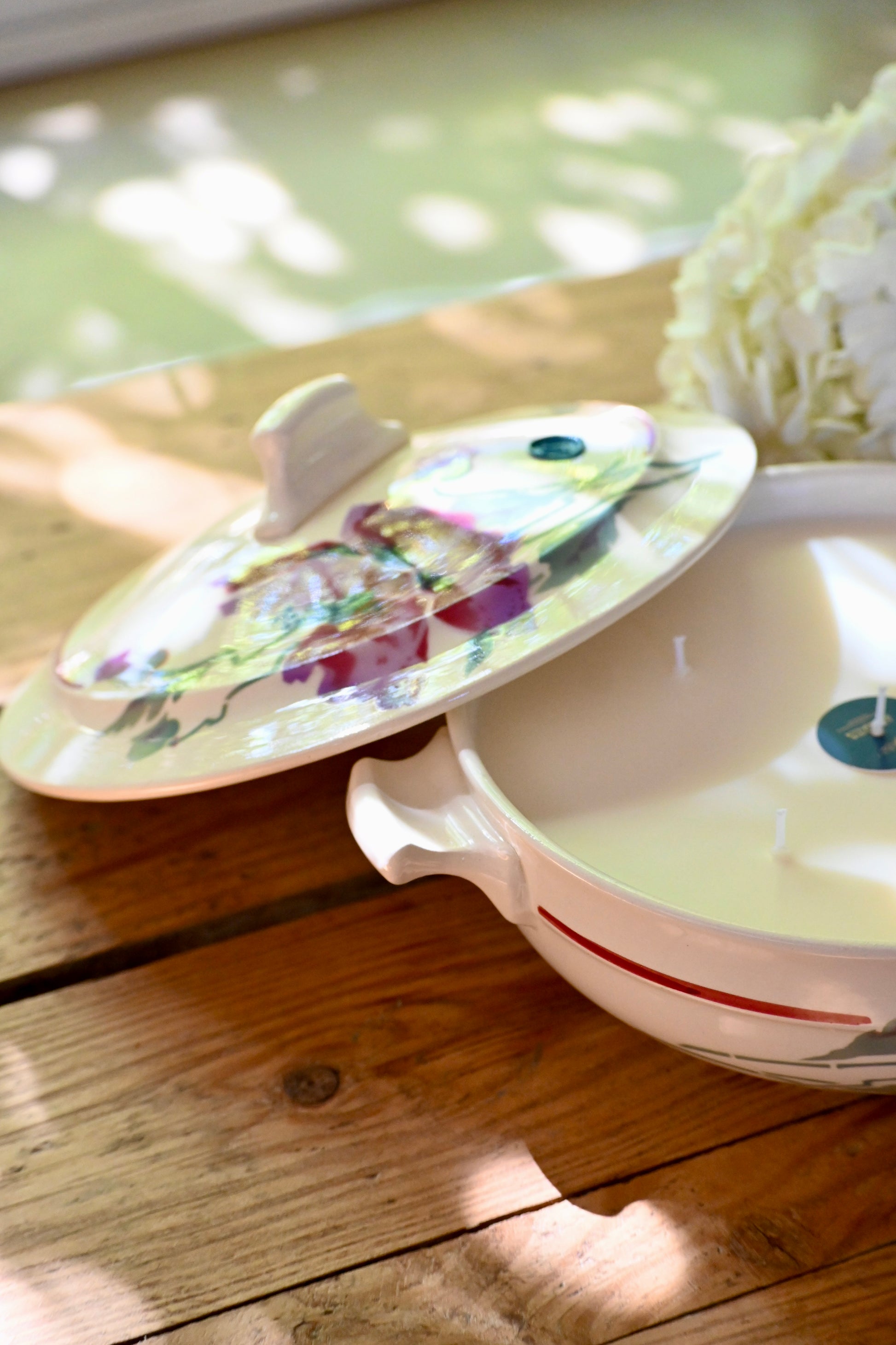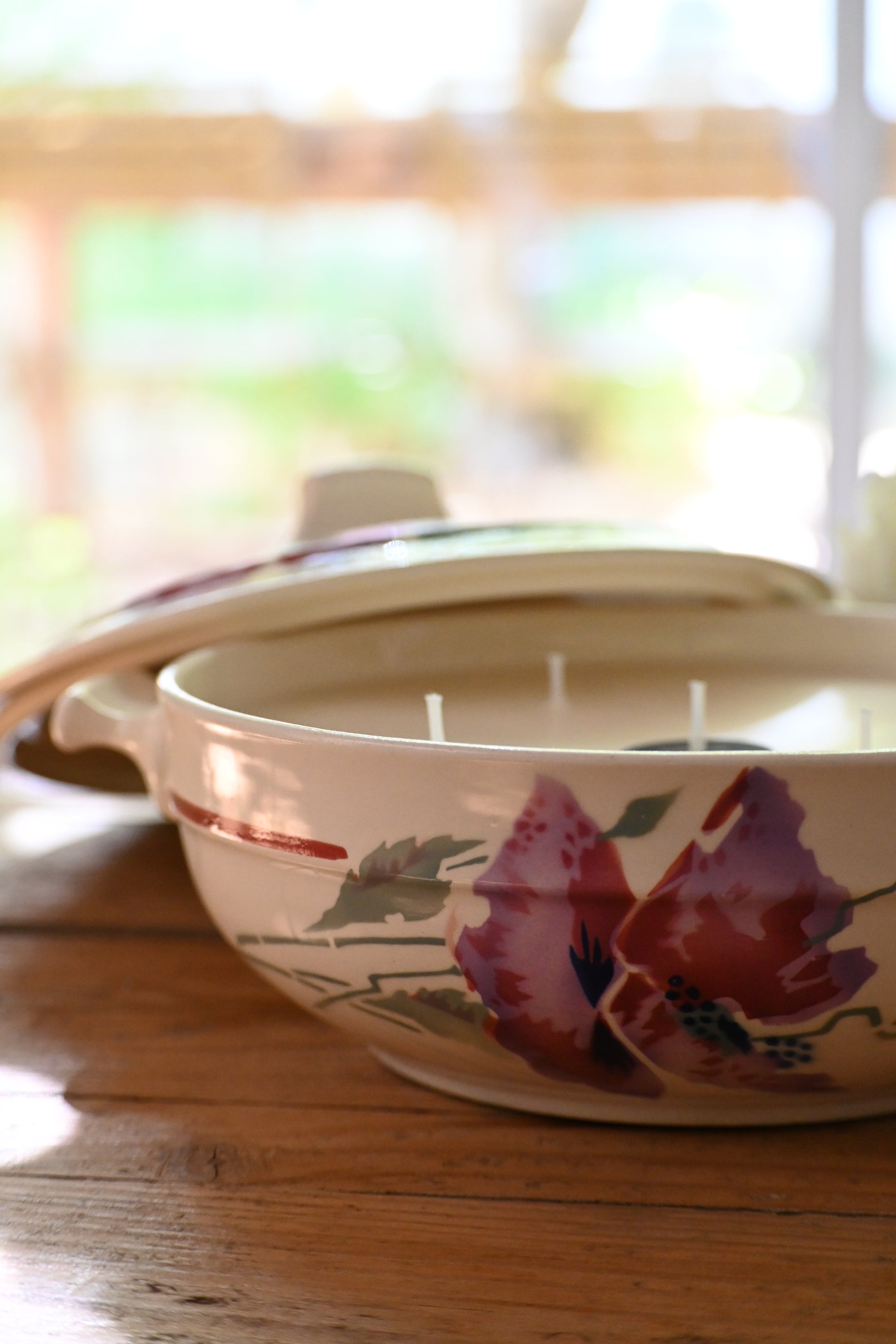 Bougie coulée dans une petite soupière décorée de fleurs de pavots. Une fois terminée elle sera parfaite pour rejoindre votre vaisselle et servir vos convives.