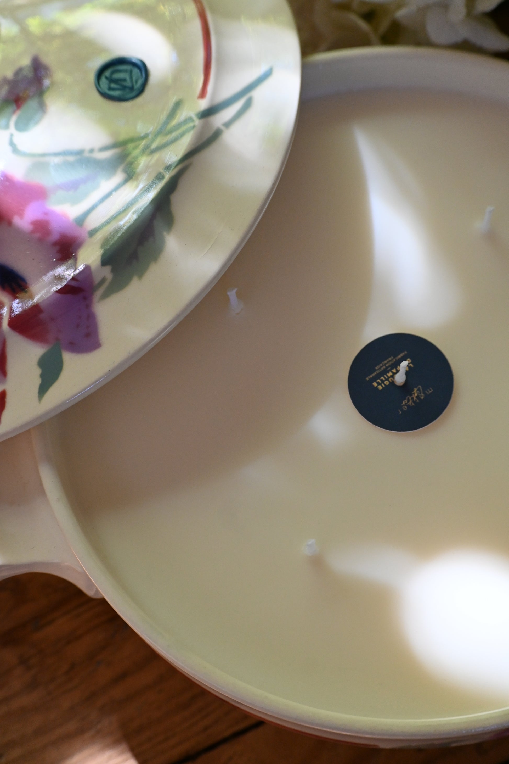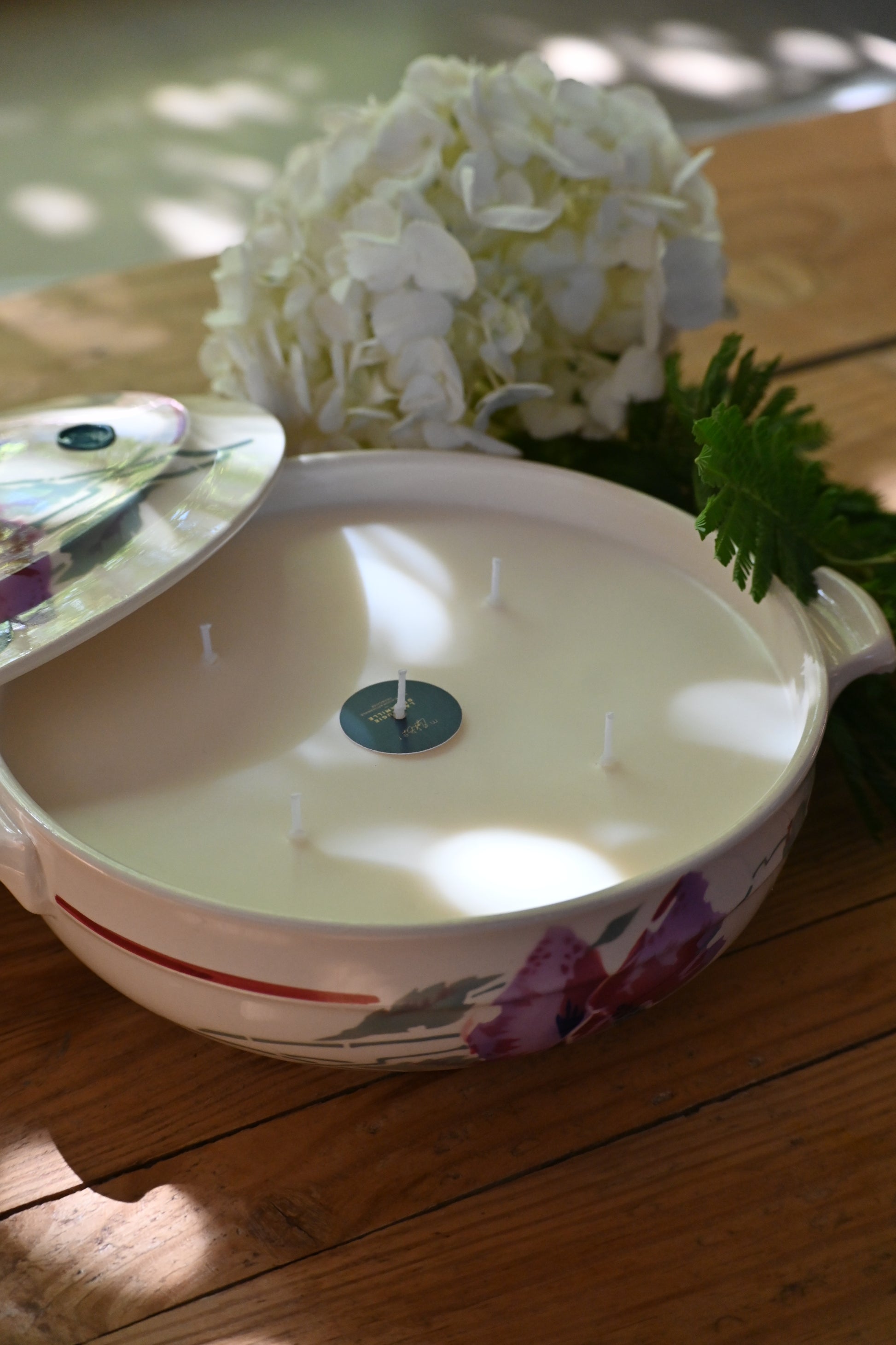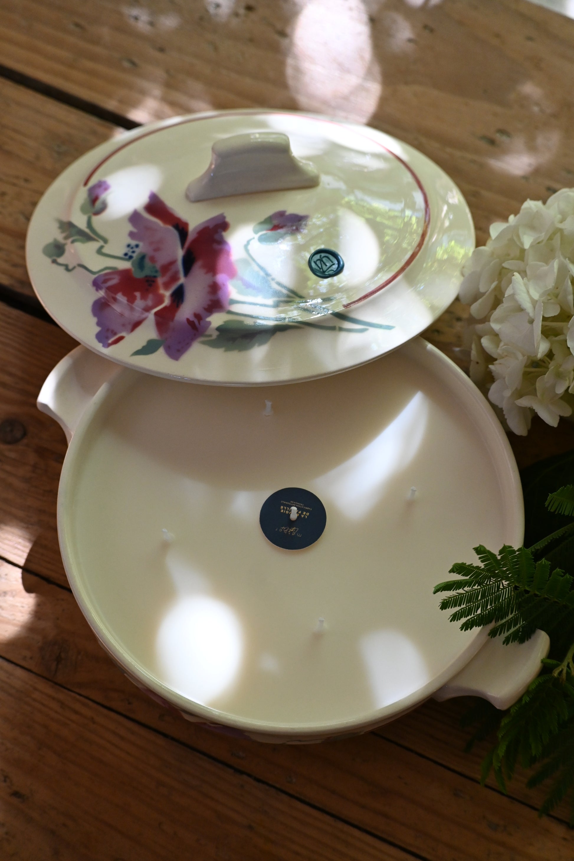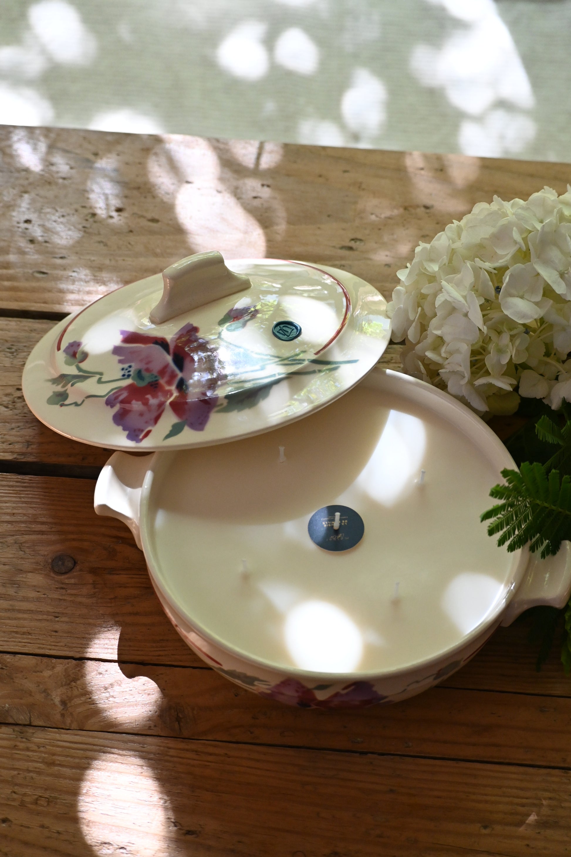 Bougie coulée dans une petite soupière décorée de fleurs de pavots. Une fois terminée elle sera parfaite pour rejoindre votre vaisselle et servir vos convives.