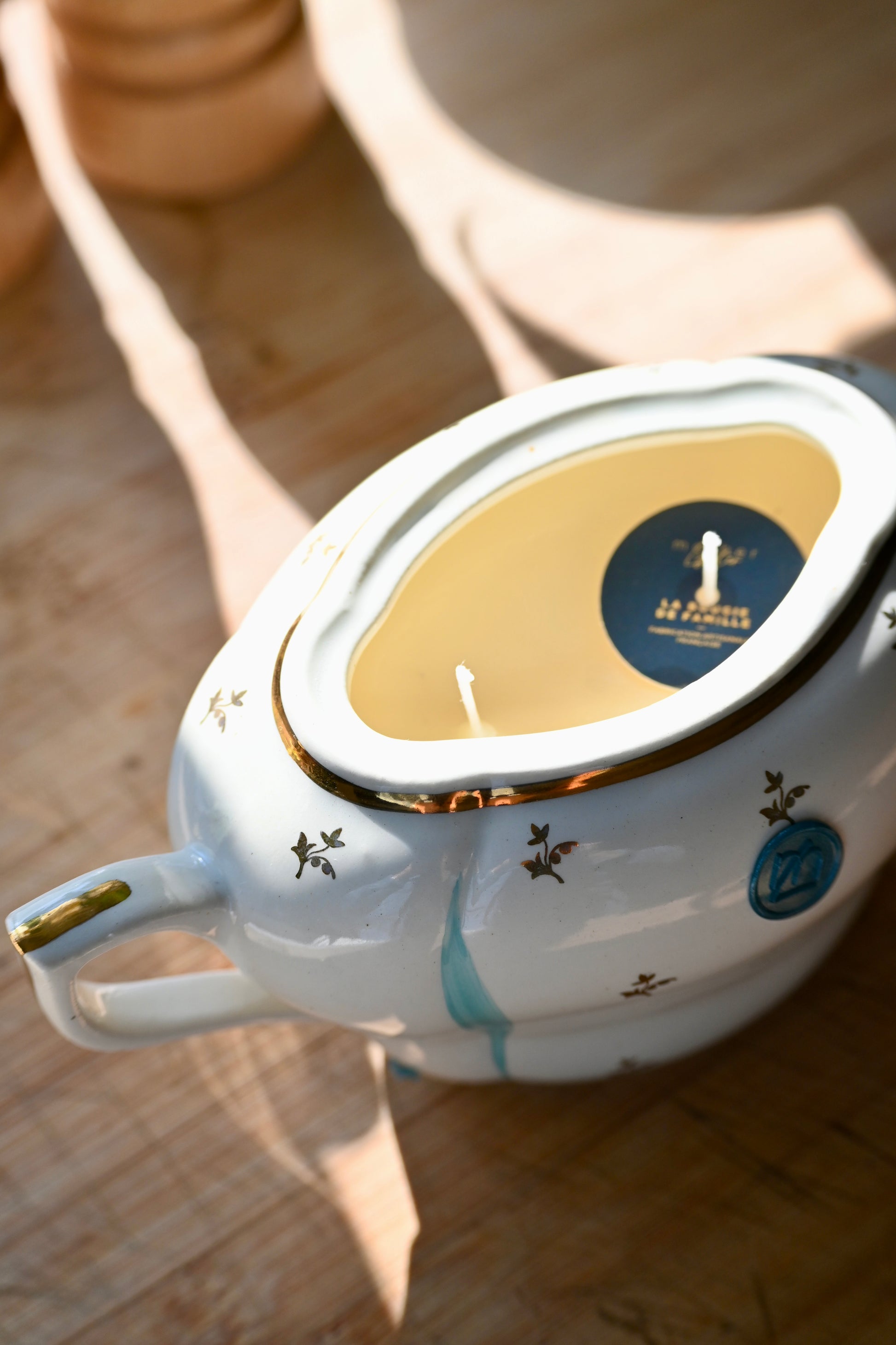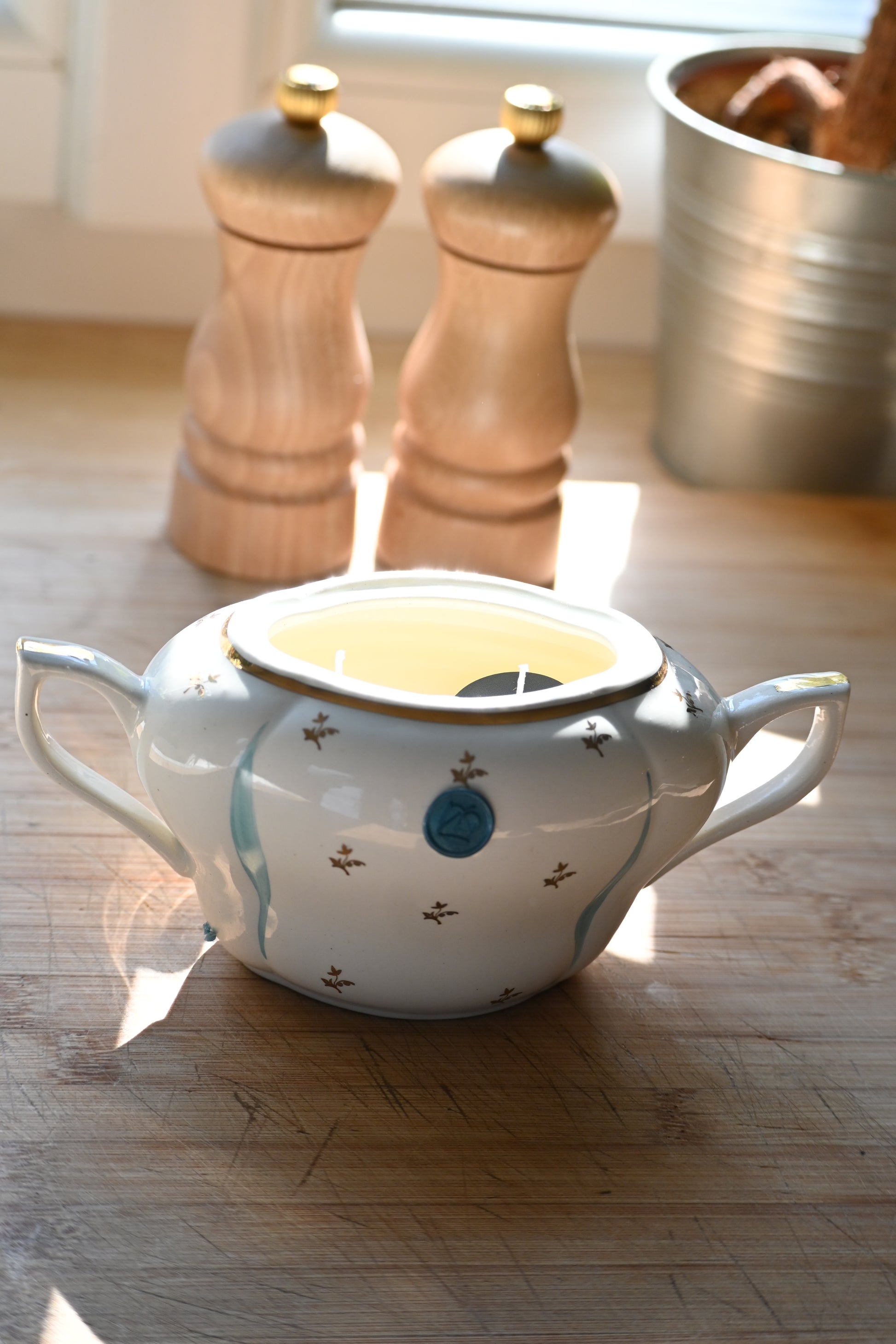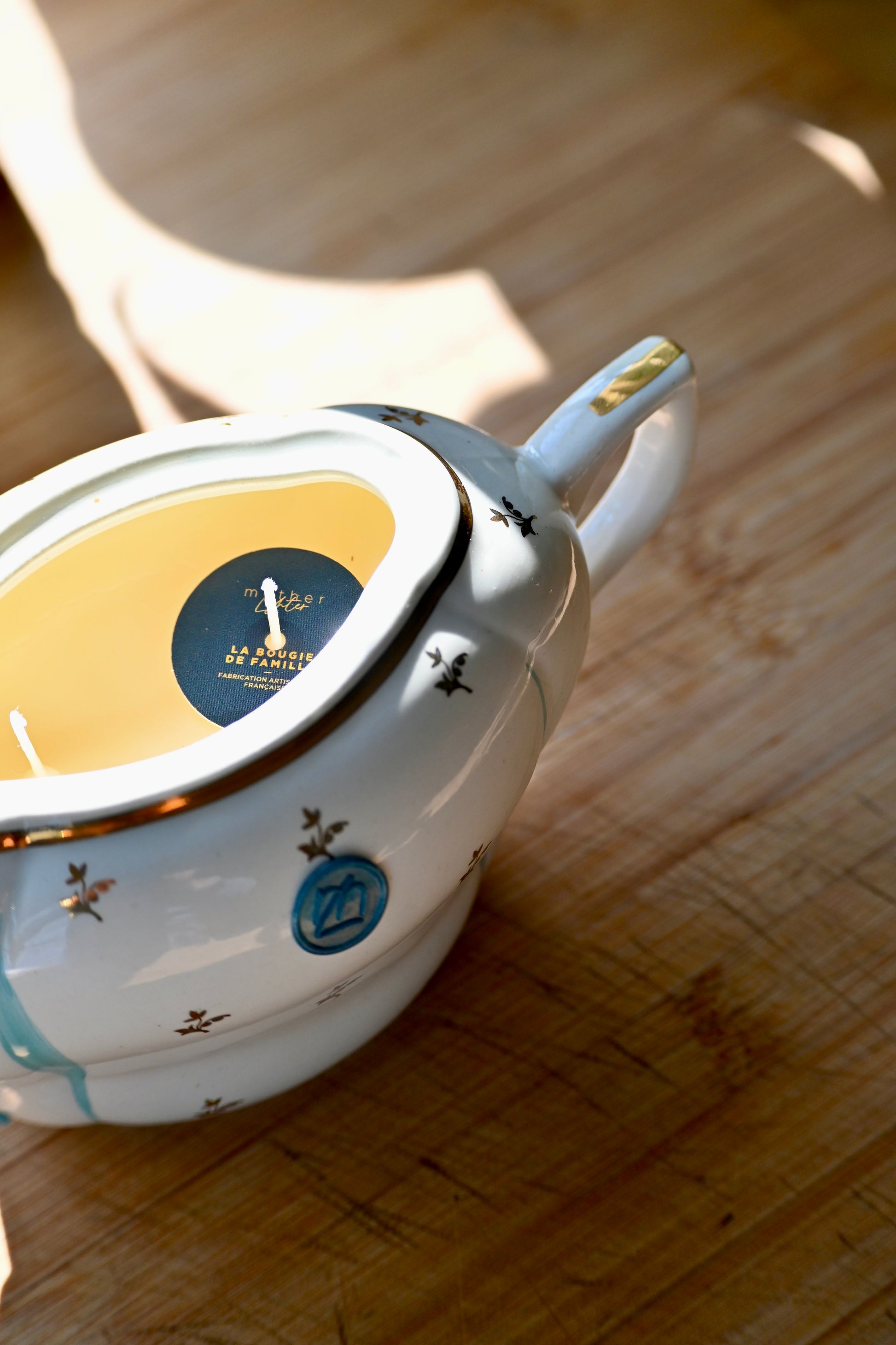 Bougie coulée dans un sucrier bleu et doré. Une fois votre bougie terminée il se transformera en joli petit vase.