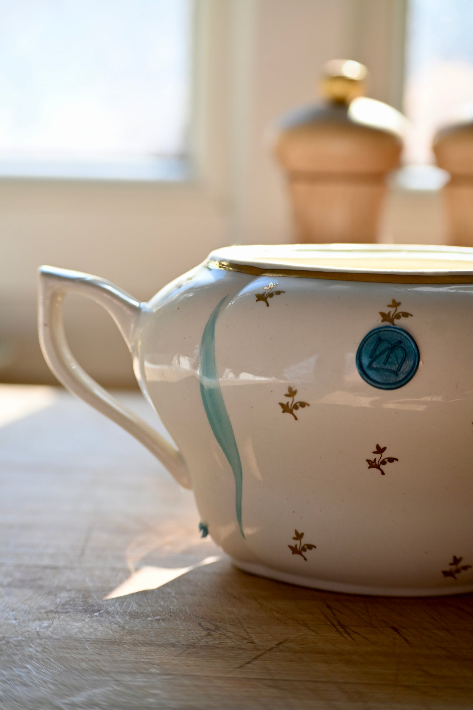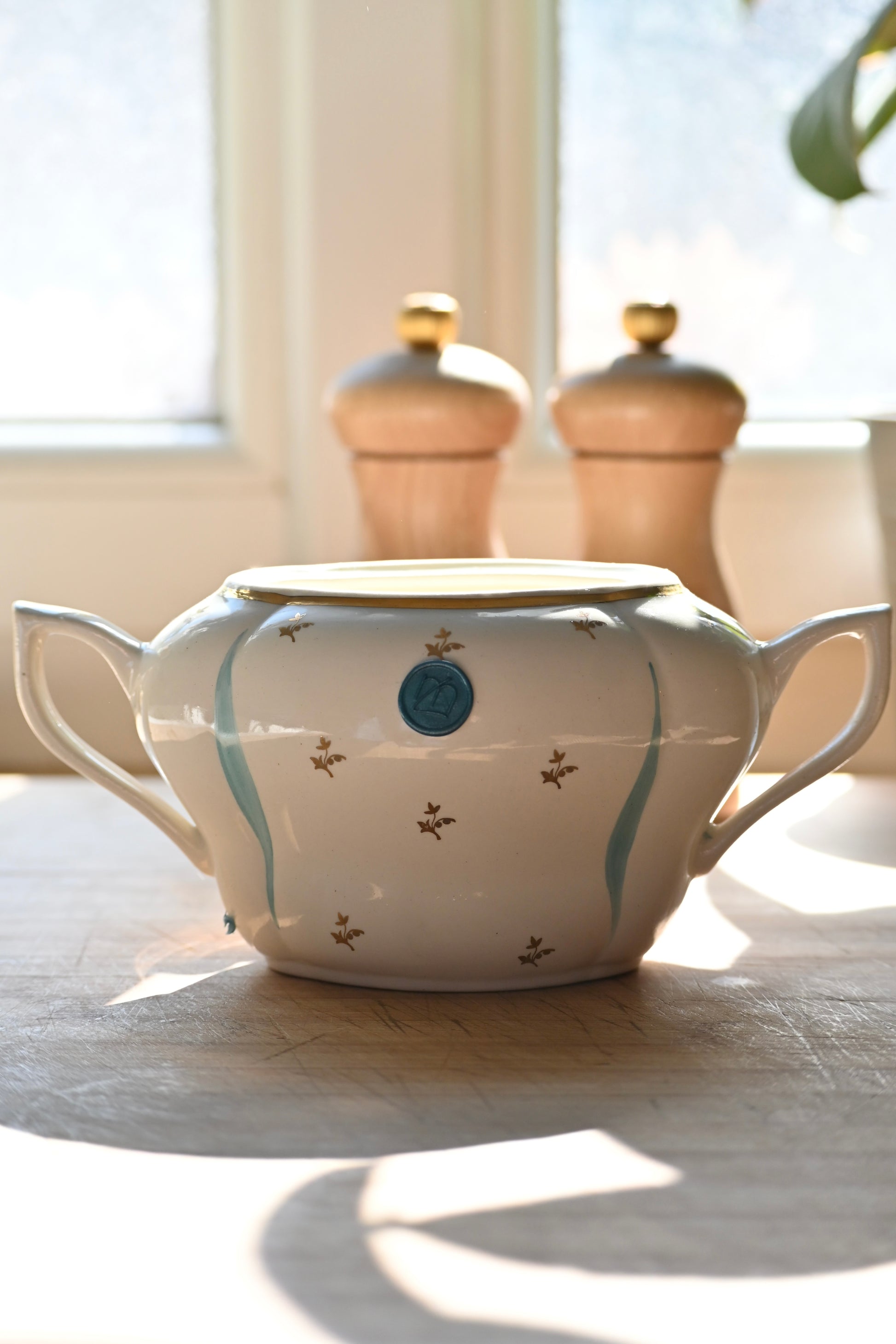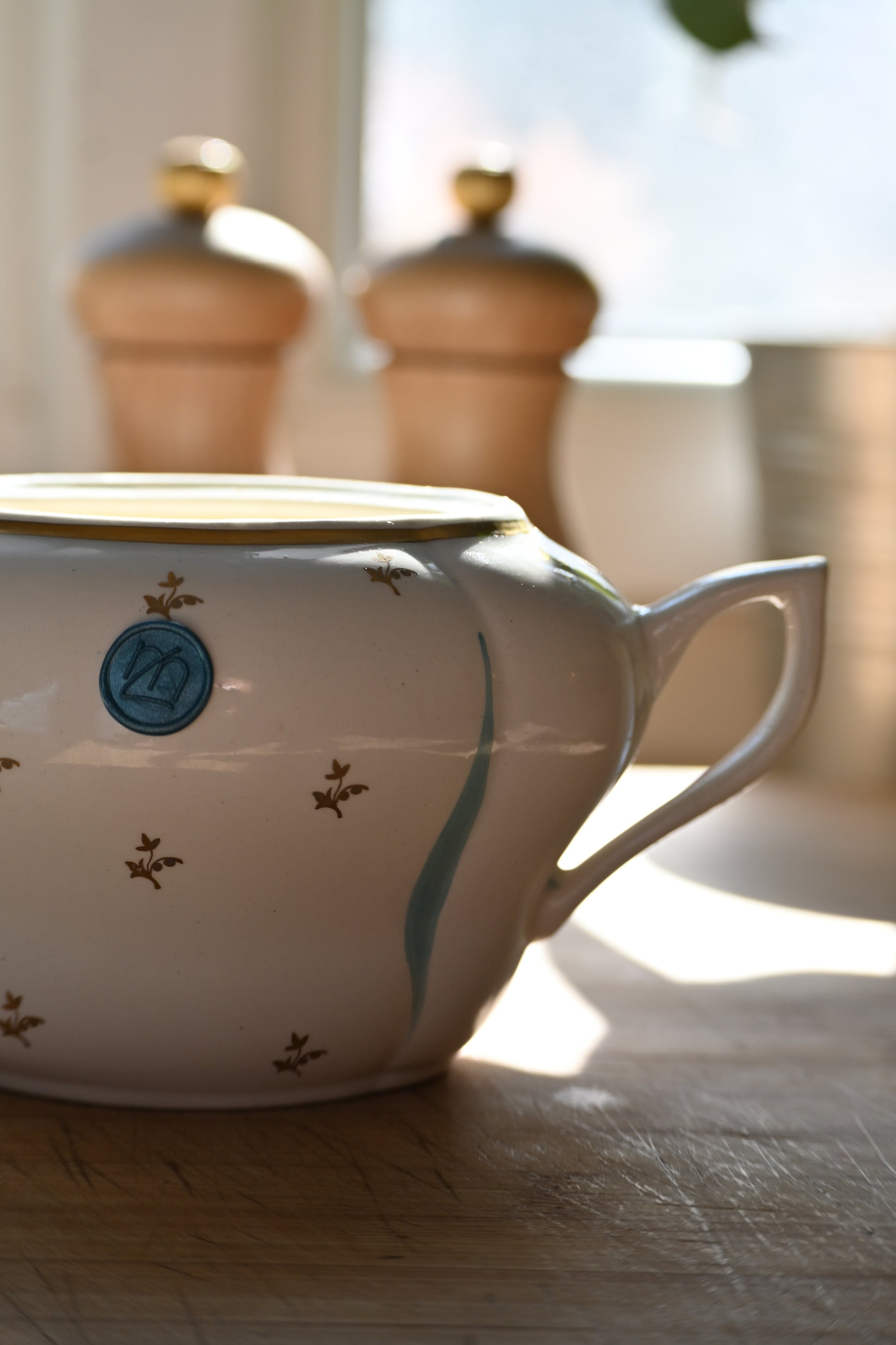 Bougie coulée dans un sucrier bleu et doré. Une fois votre bougie terminée il se transformera en joli petit vase.