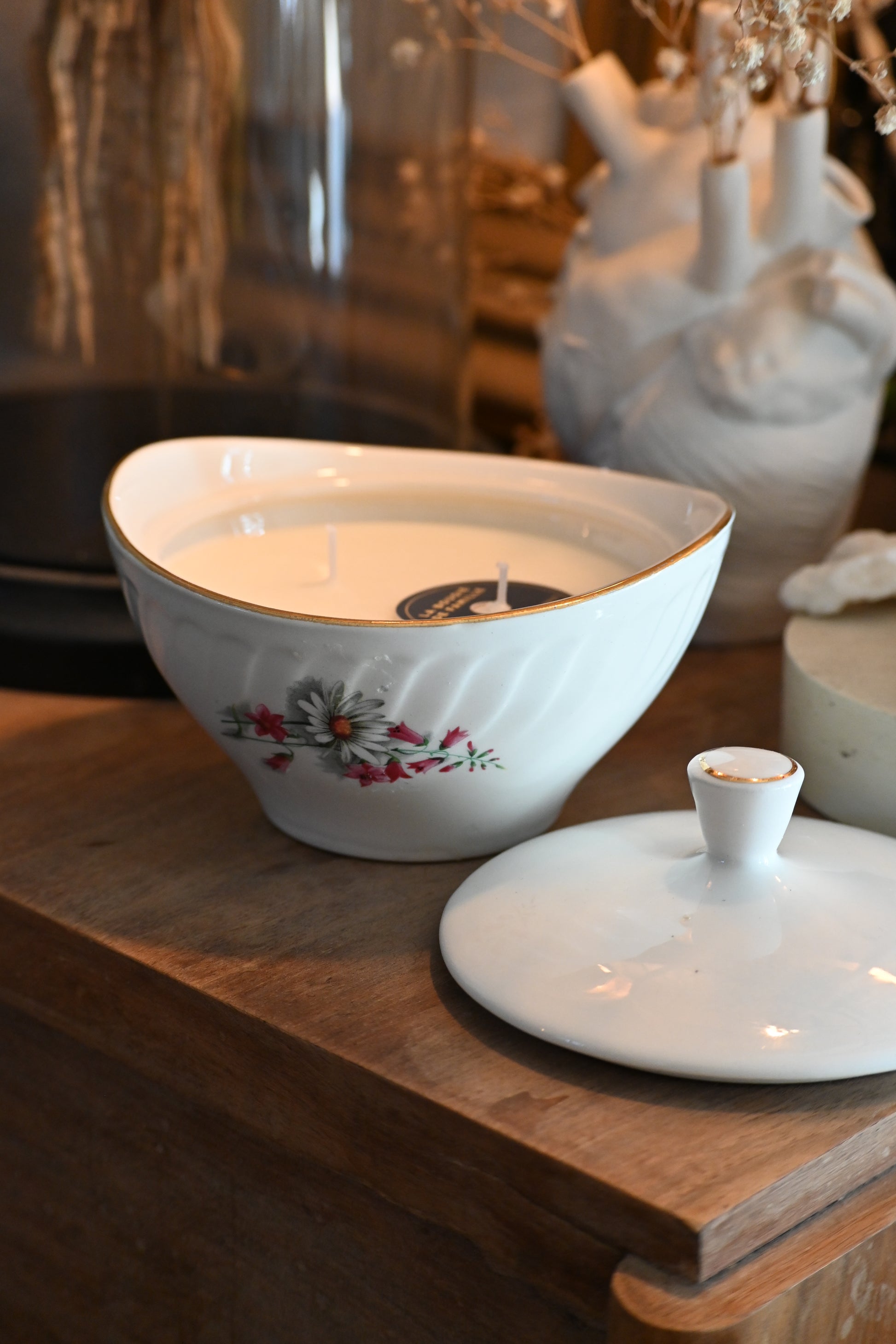 Bougie coulée dans un sucrier décoré de fleurs. Une fois votre bougie terminée il vous servira pour contenir de petits objets ou vos bijoux.