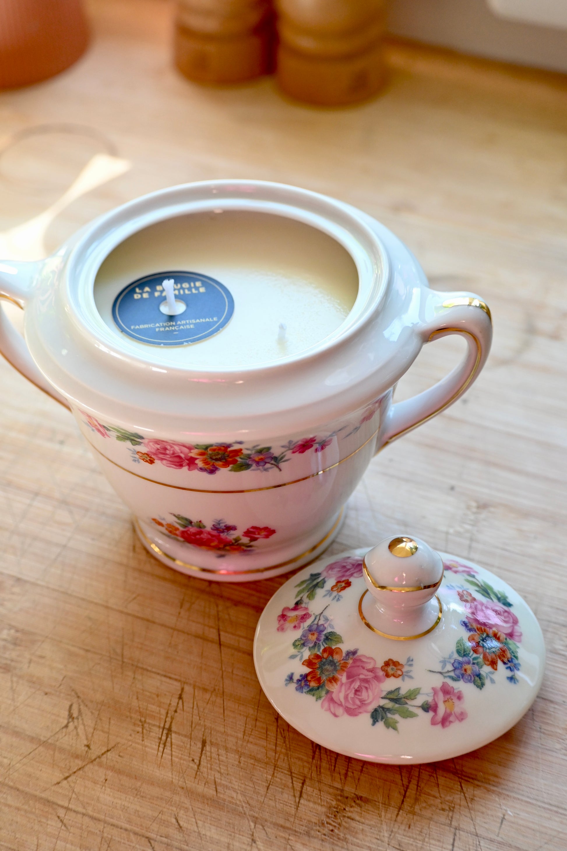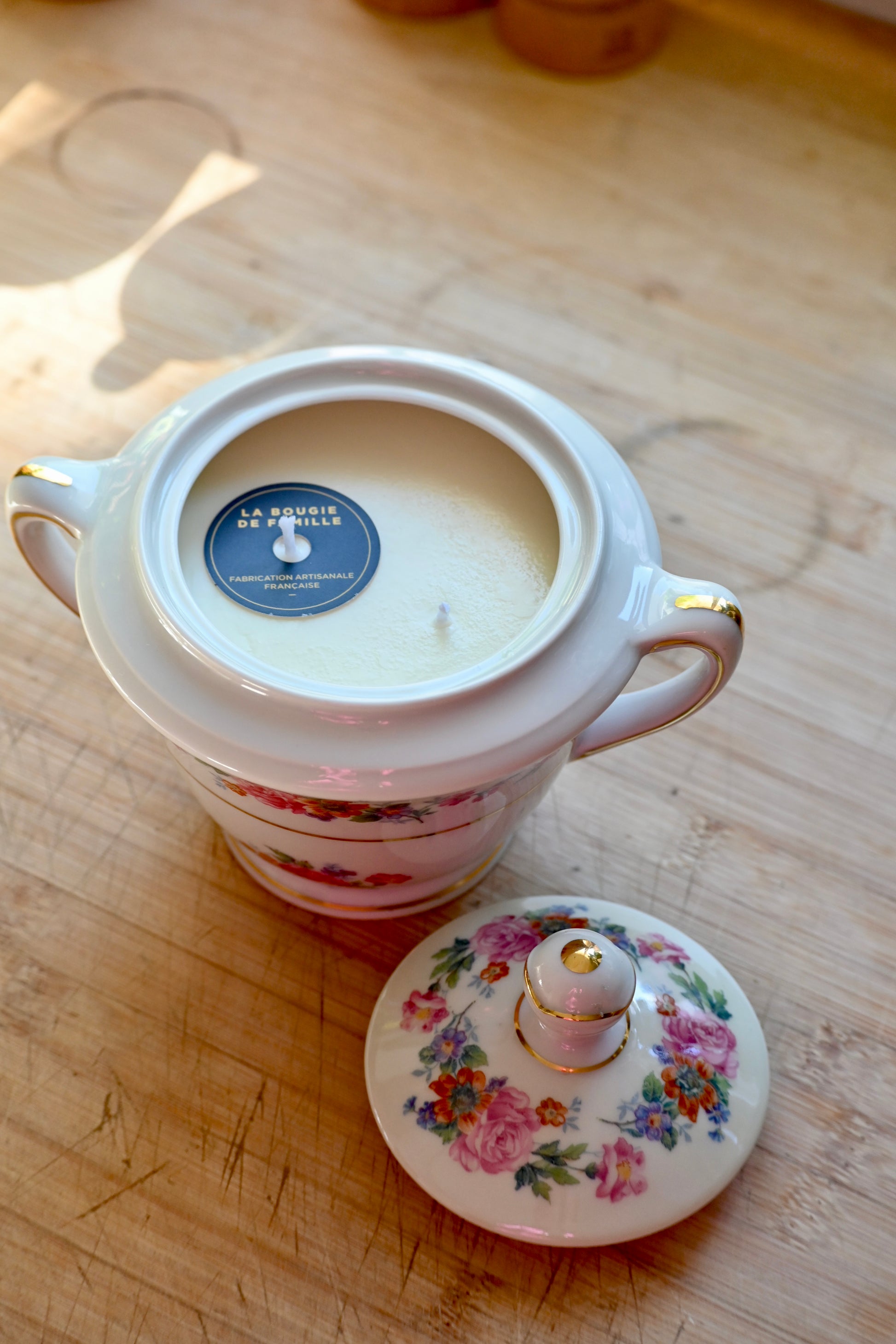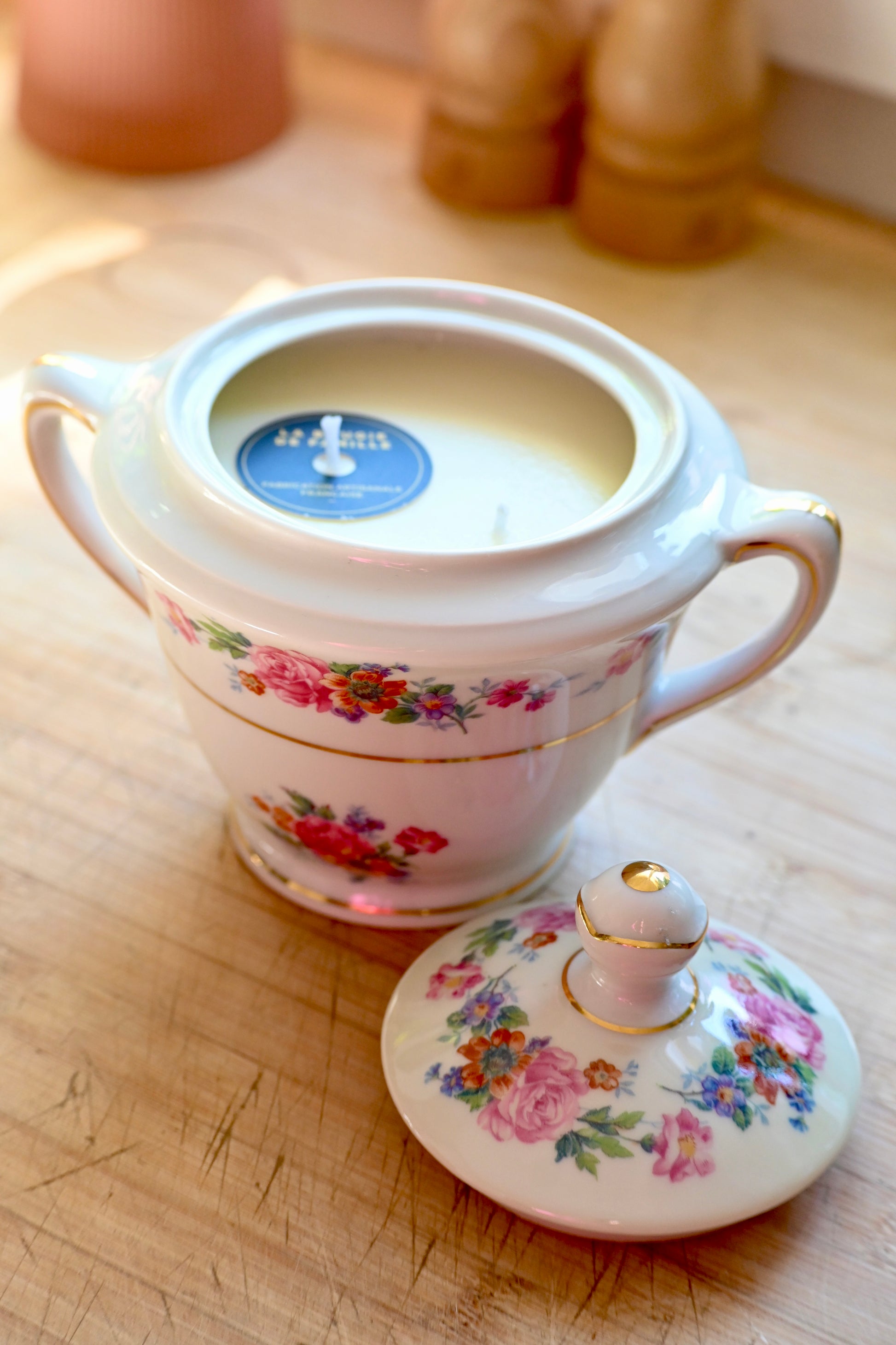 Bougie coulée dans un sucrier décoré de fleurs. Une fois votre bougie terminée il vous servira pour contenir de petits objets ou vos bijoux.