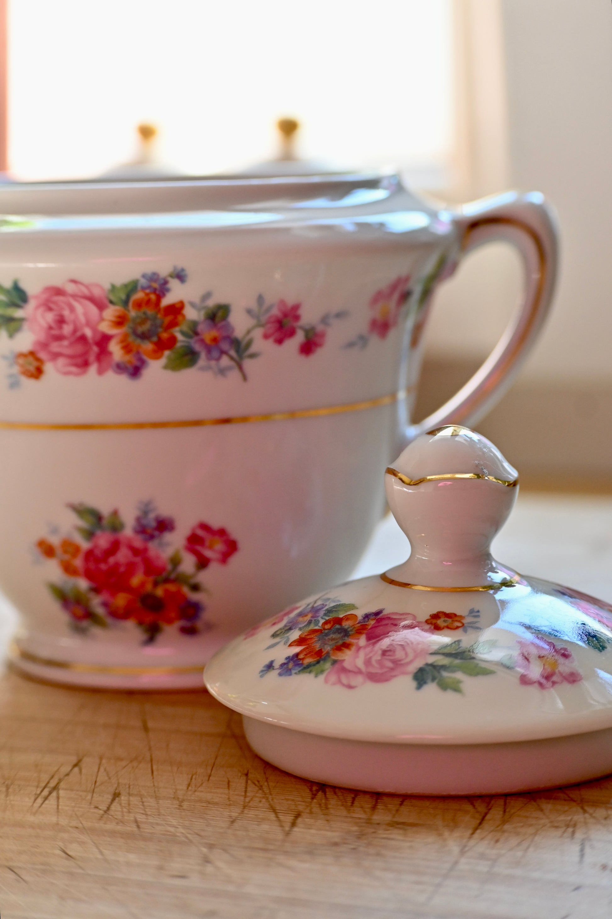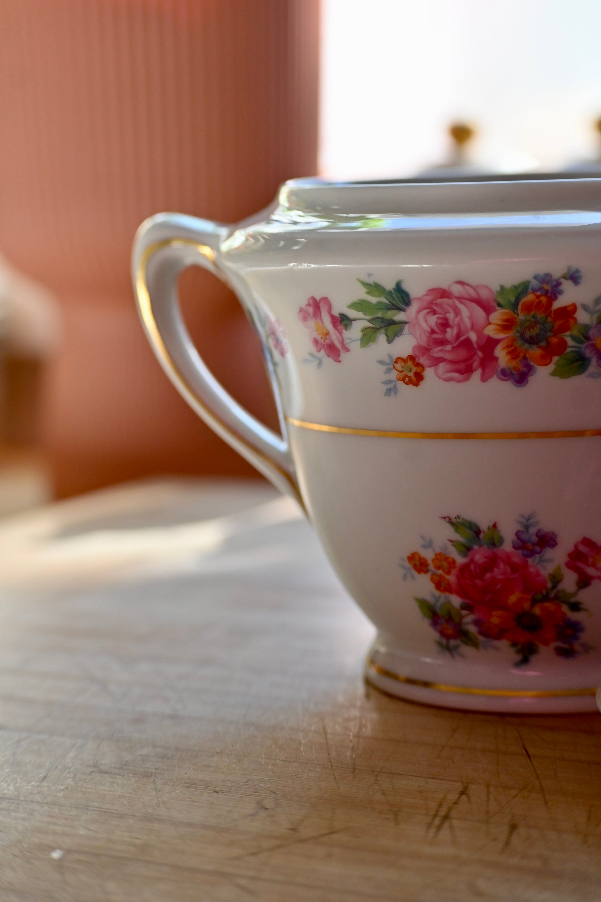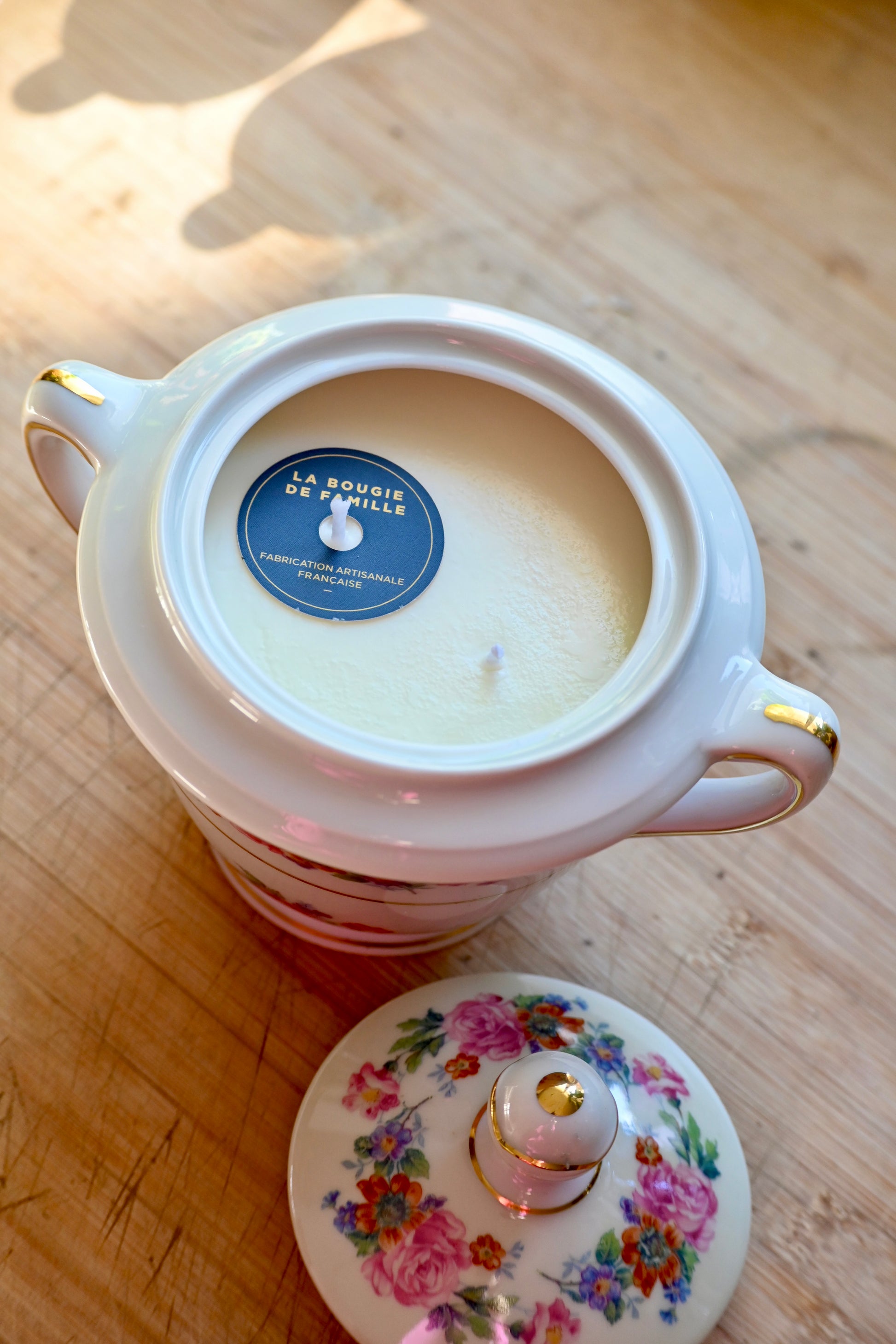 Bougie coulée dans un sucrier décoré de fleurs. Une fois votre bougie terminée il vous servira pour contenir de petits objets ou vos bijoux.