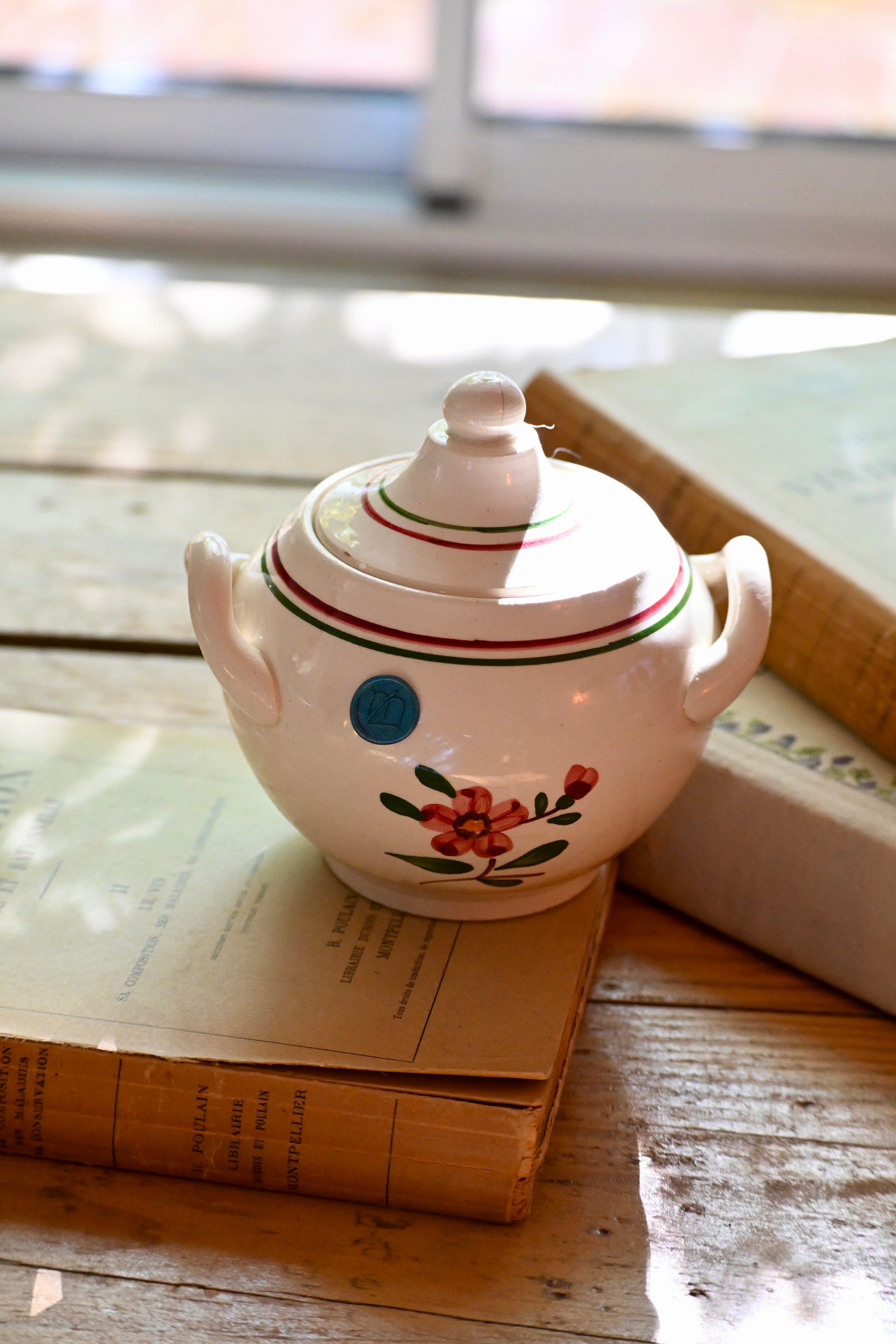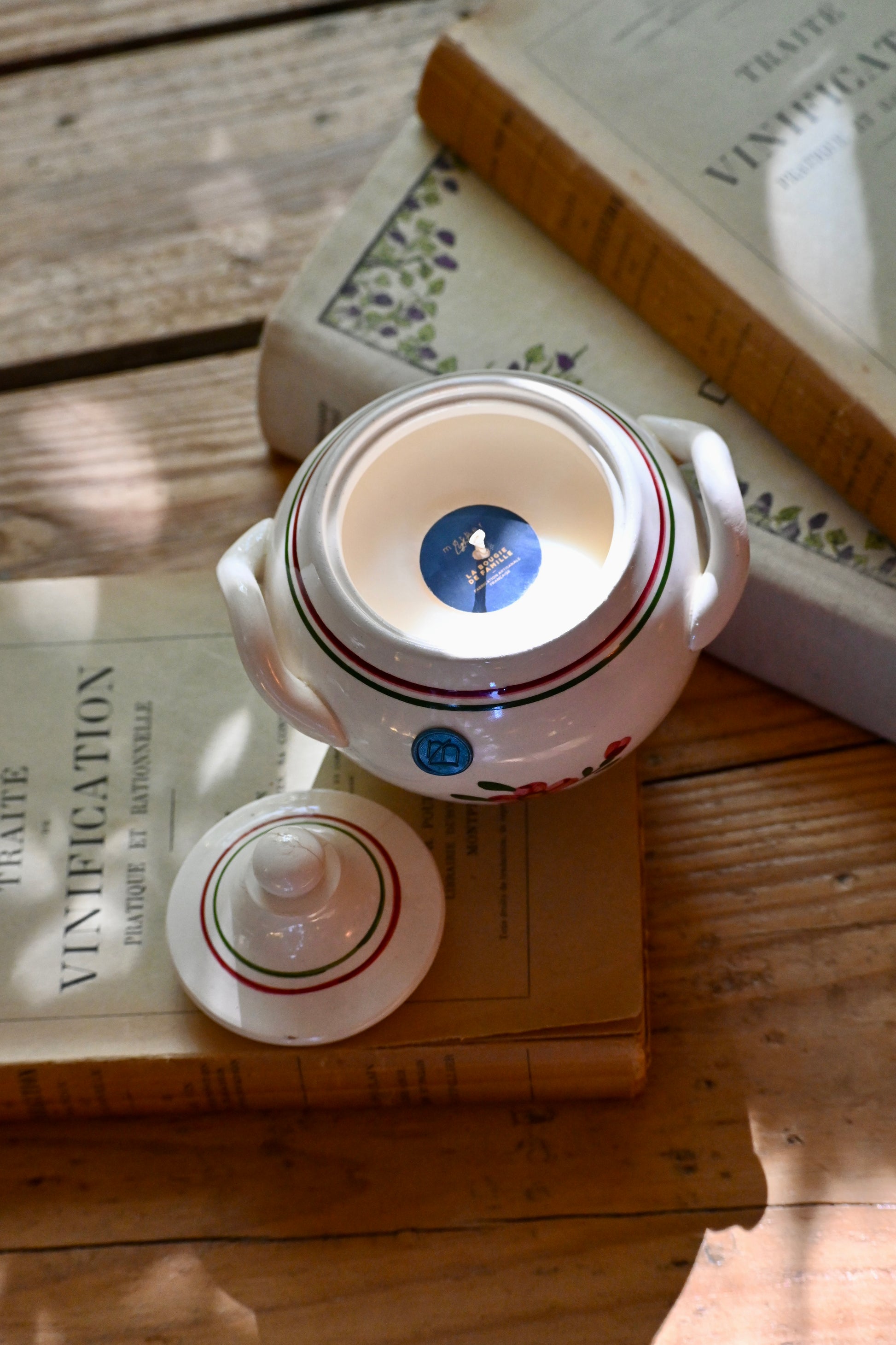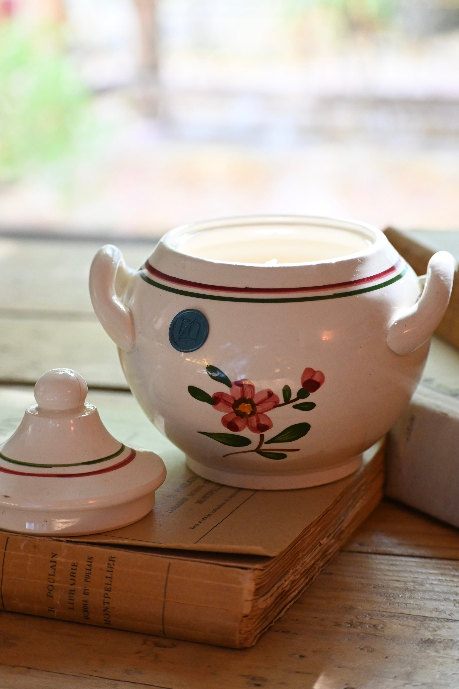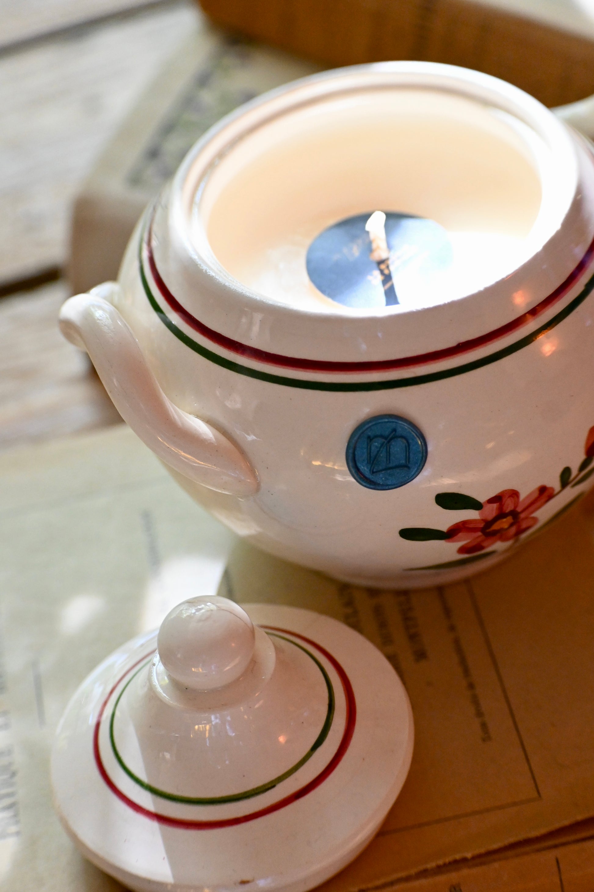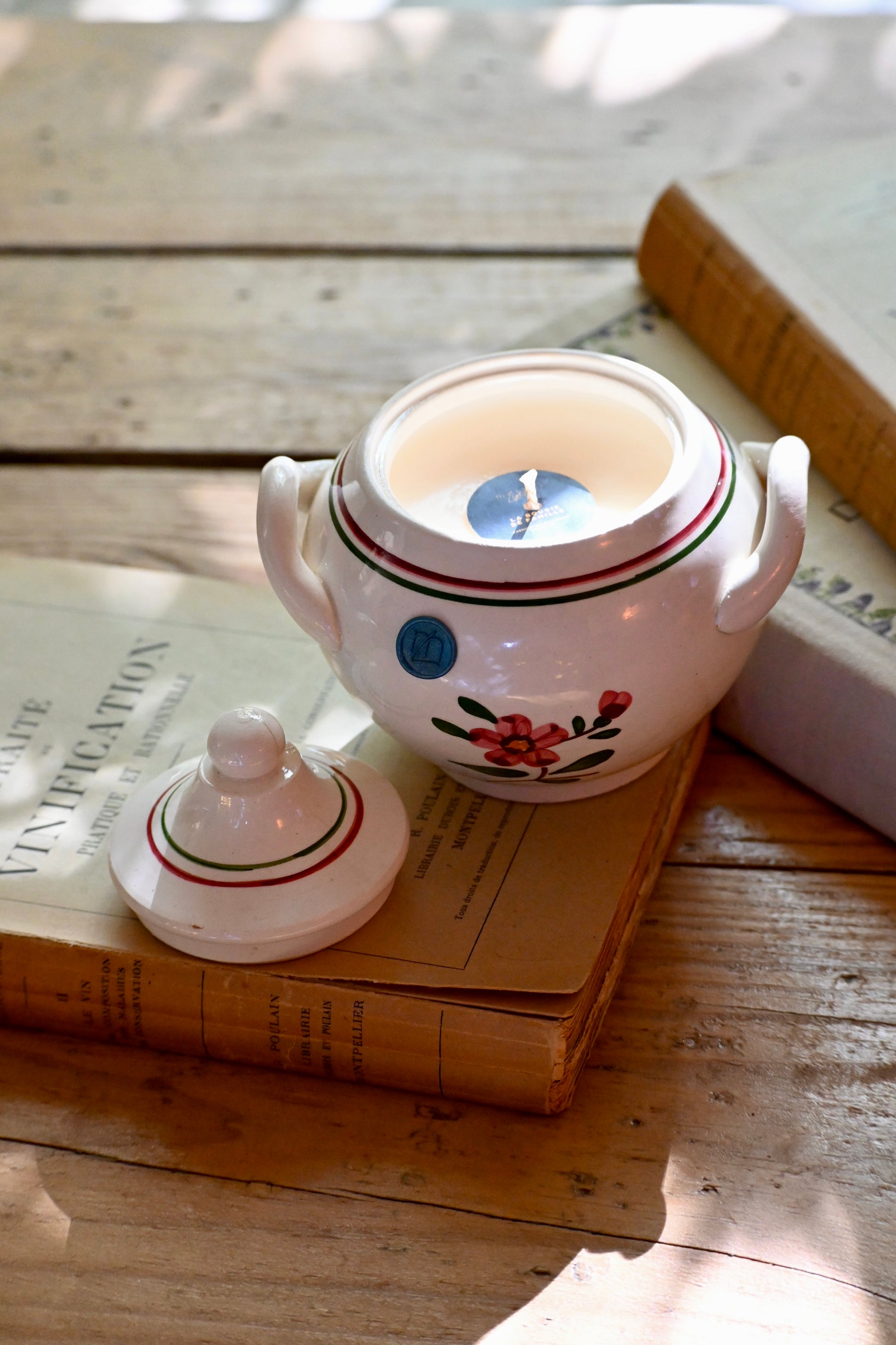 Bougie coulée dans un sucrier décoré de petites fleurs vertes et roses. Une fois votre bougie terminée il vous servira pour contenir vos bijoux ou autres petits objets .