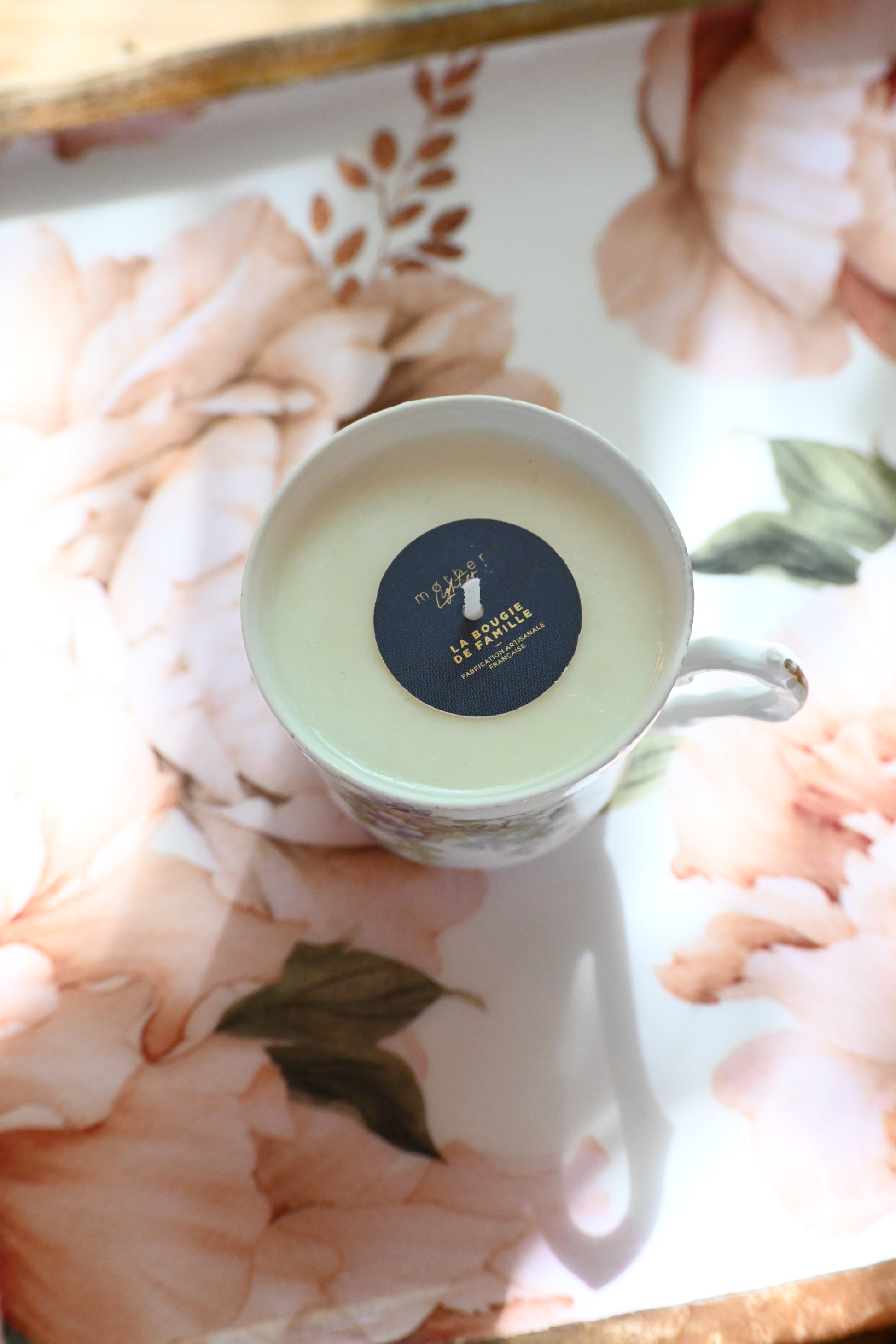 Bougie coulée dans une jolie tasse décorée d’anémones violettes. Une fois terminée, elle sera parfaite pour un café.