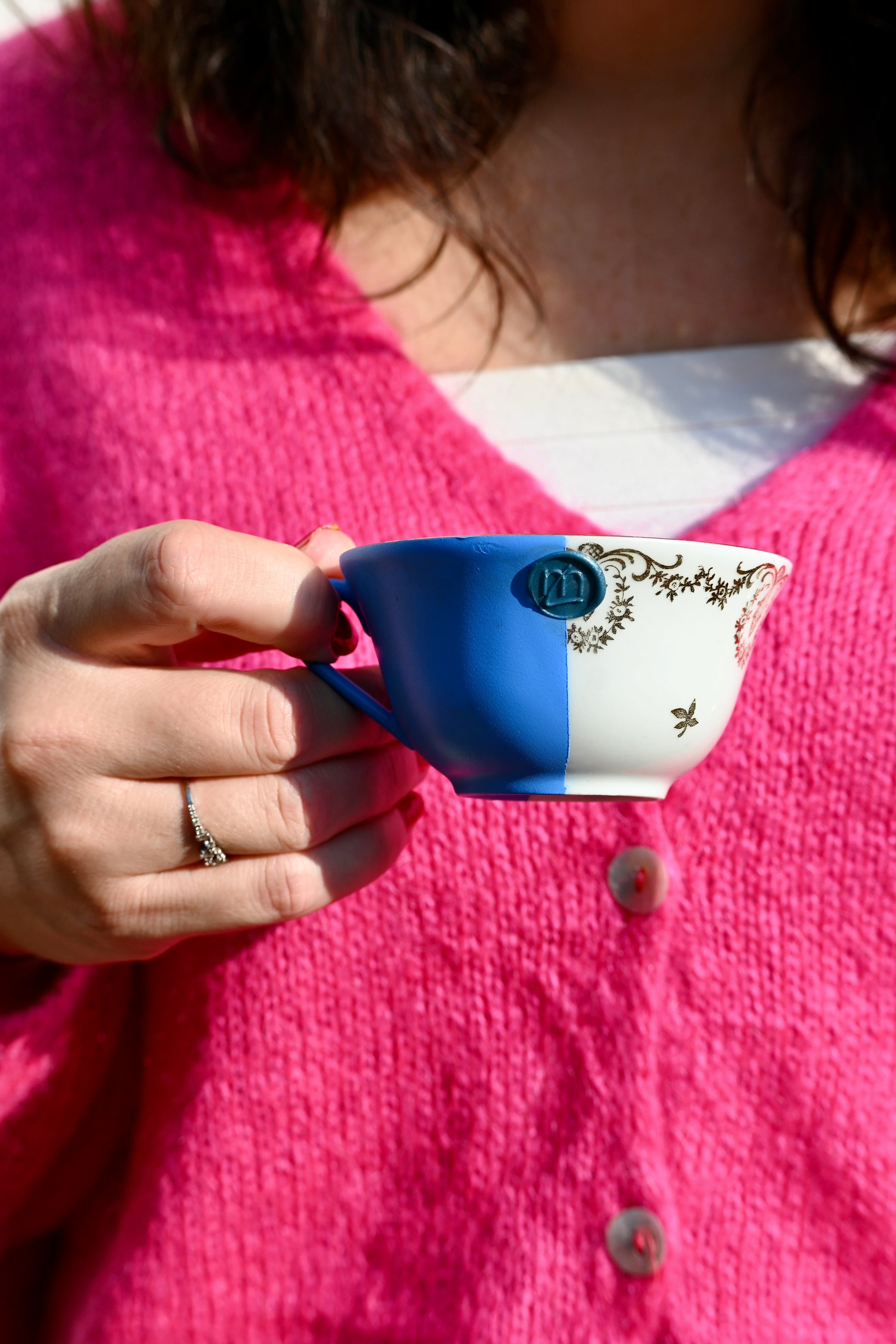 Bougie coulée dans une tasse décorée d'un liseré doré, elle est également personnalisé avec une peinture bleue pour lui apporter un côté pop.