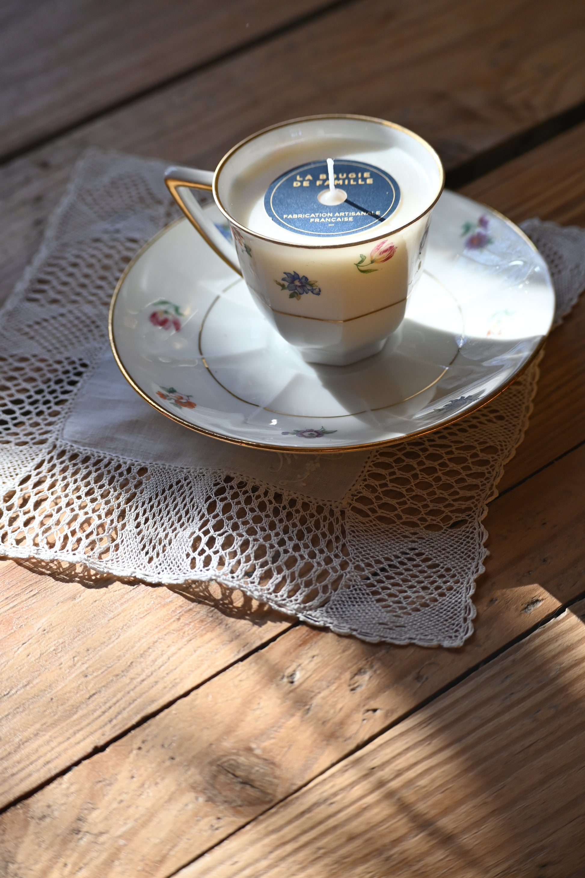 Bougie coulée dans une jolie tasse et sa coupelle décorés de petites fleurs. Une fois terminée, elle sera parfaite pour un café.