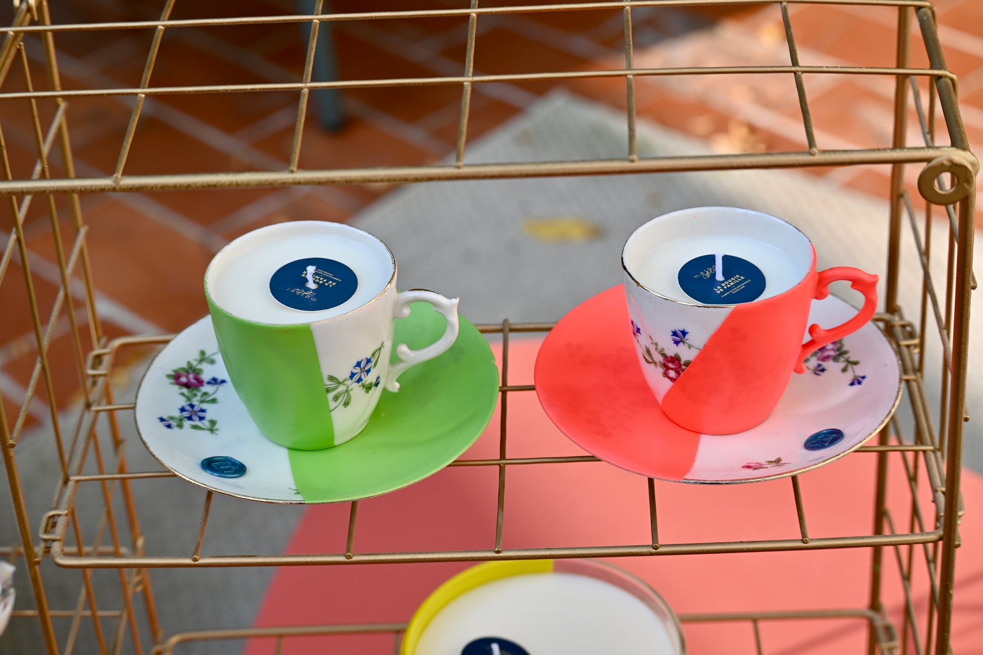 Bougie coulée dans une tasse décorée de petites fleurs et d'un liseré doré, elle est également personnalisé avec une peinture vert pour lui apporter un côté pop.