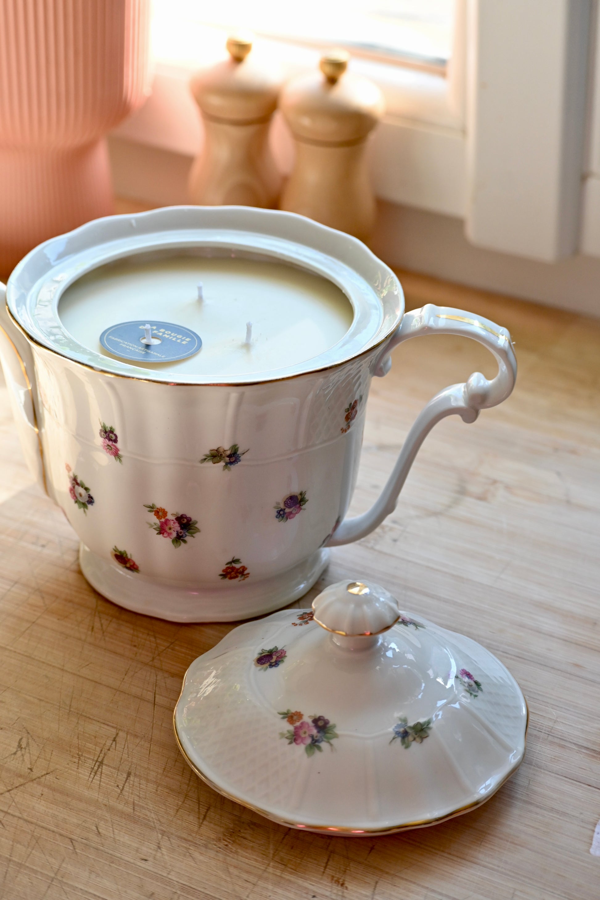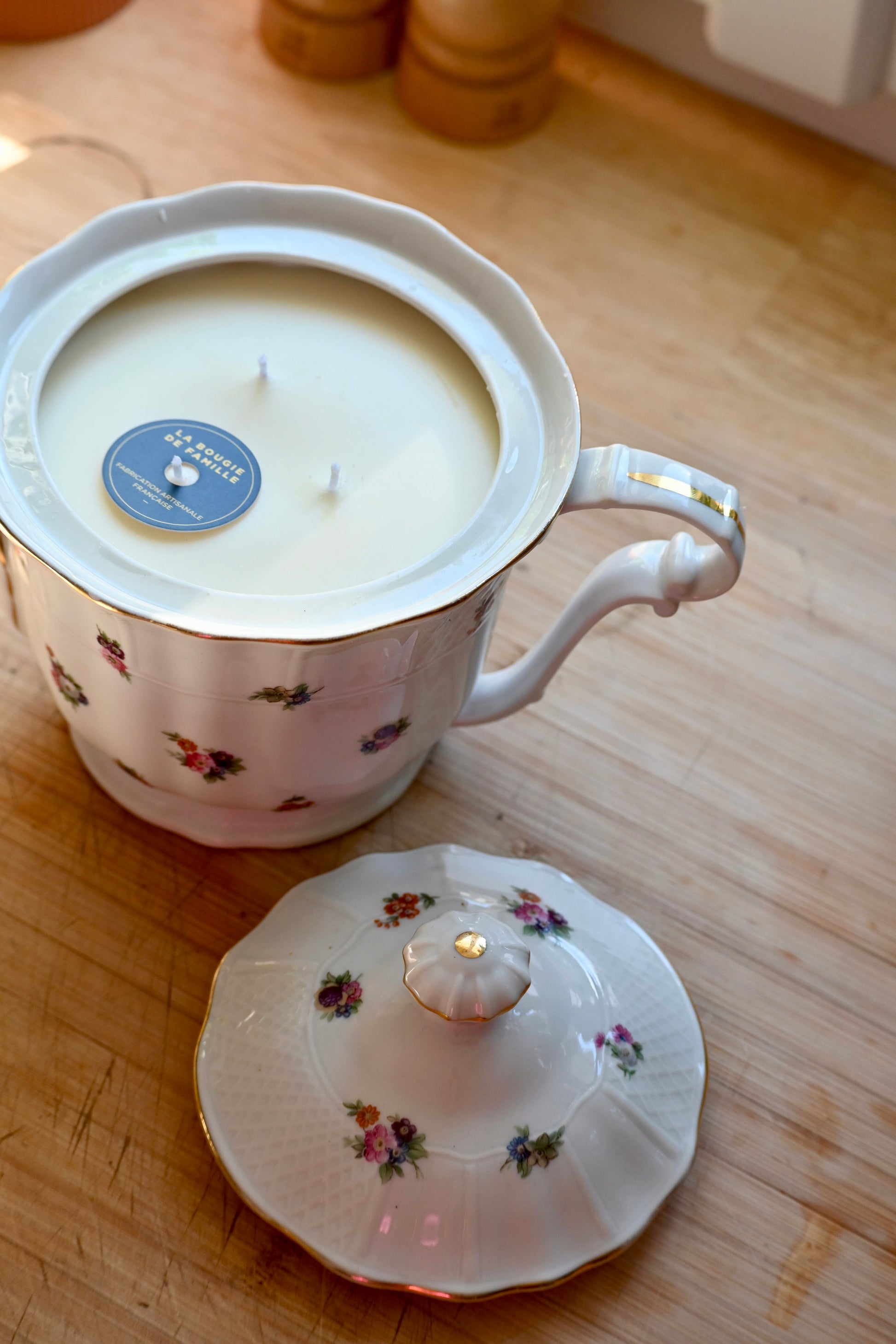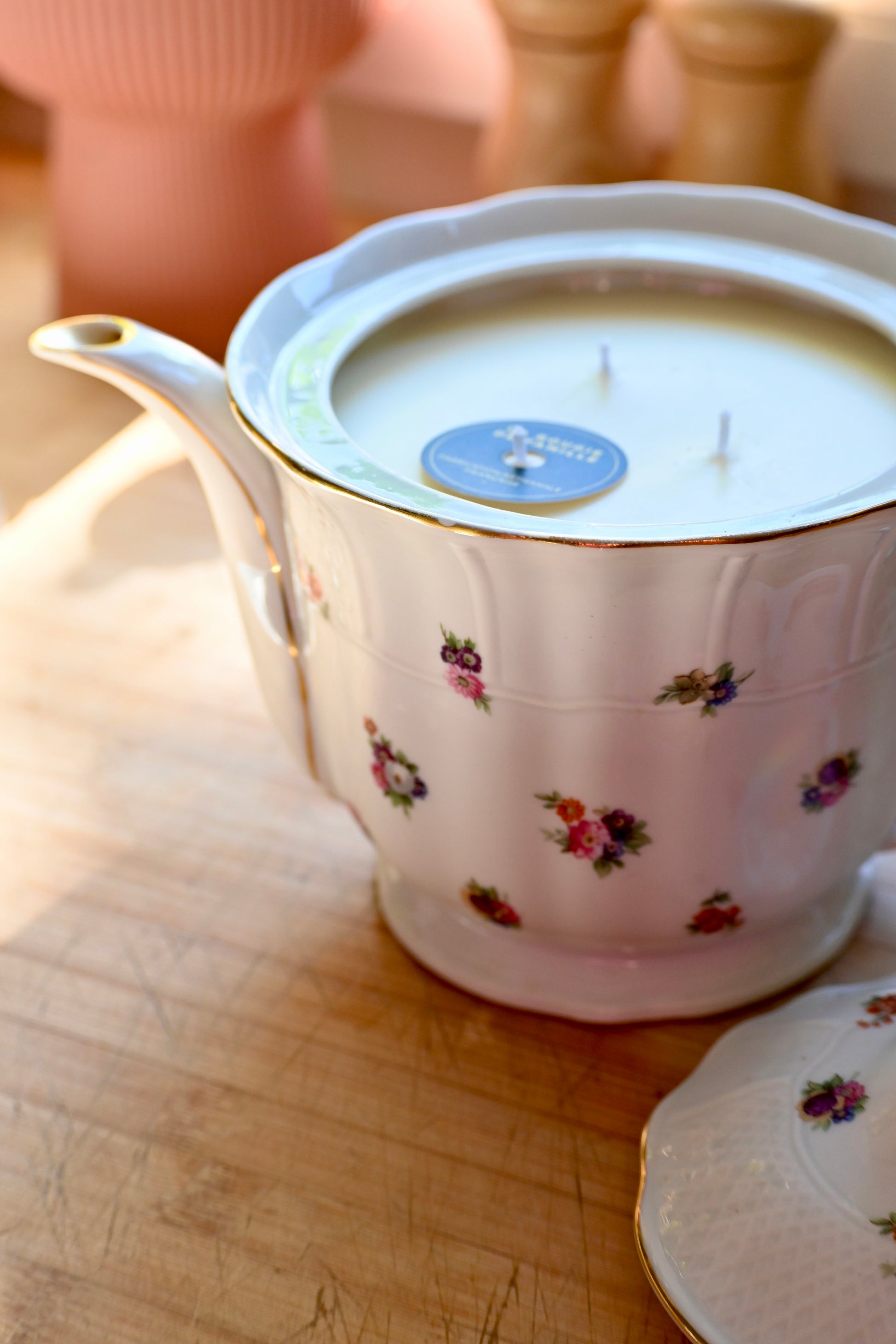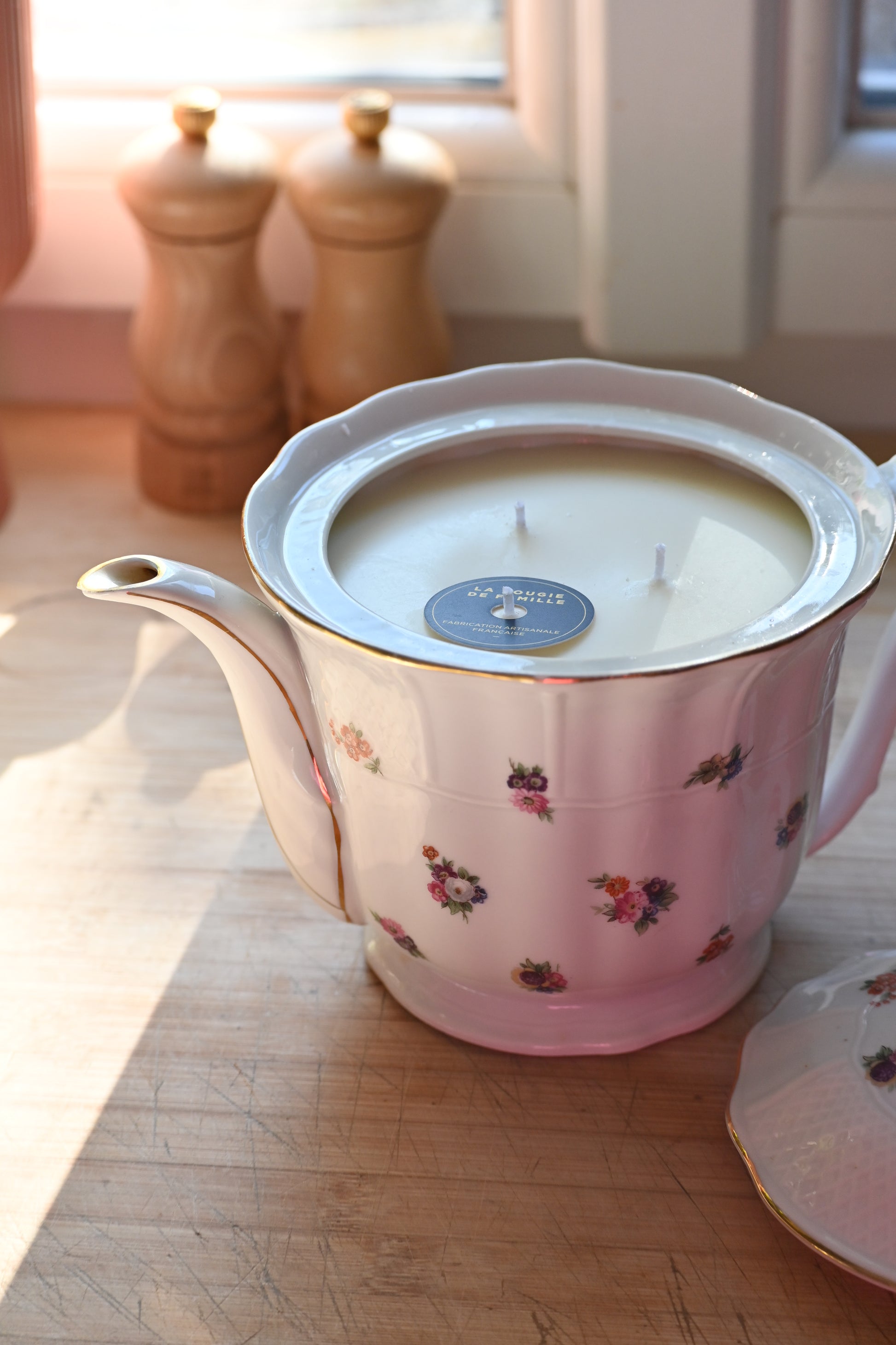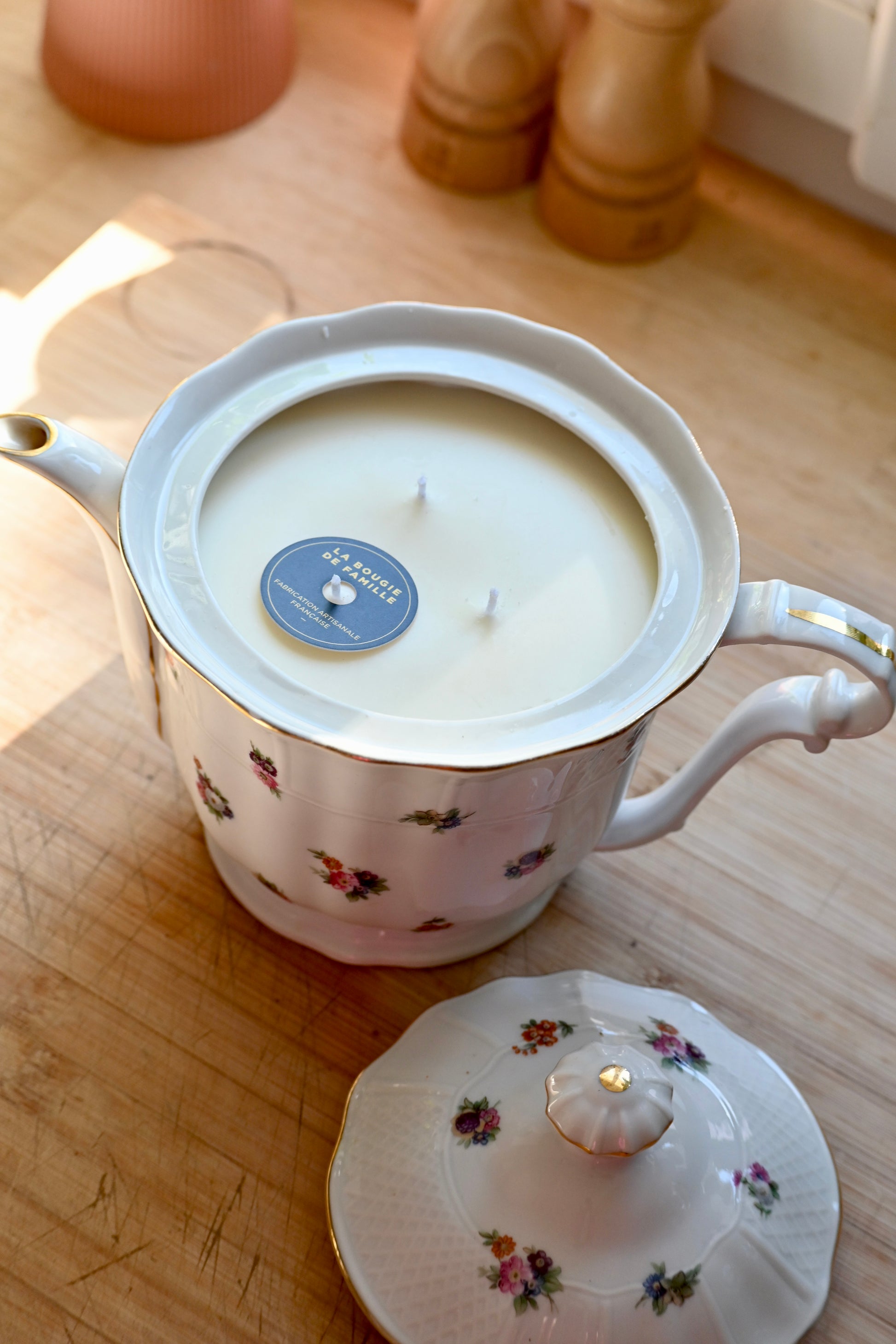 Bougie coulée dans un grande théière décoré de petites fleurs et de liserés dorés. Il fera un vase parfait après avoir été consumée.