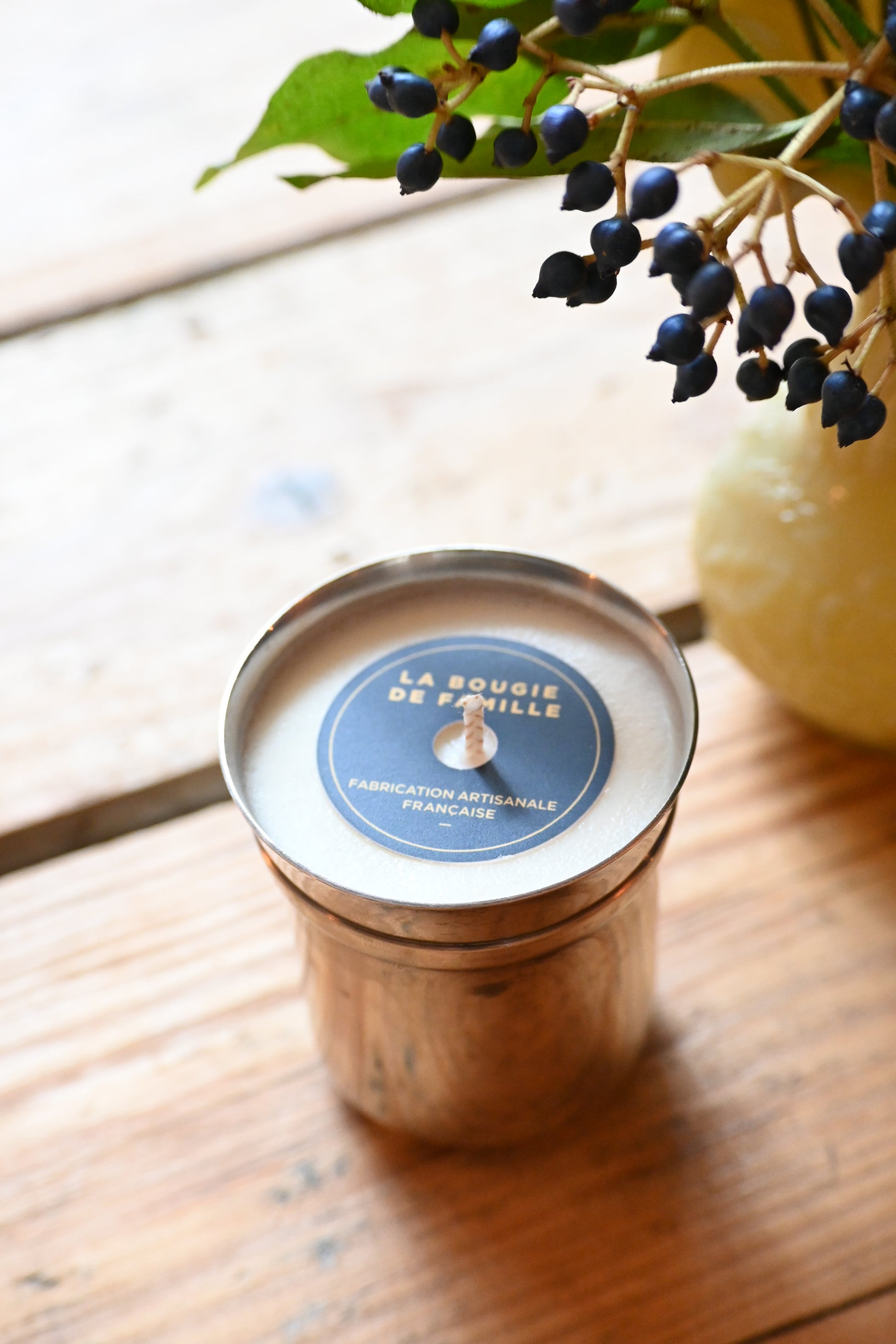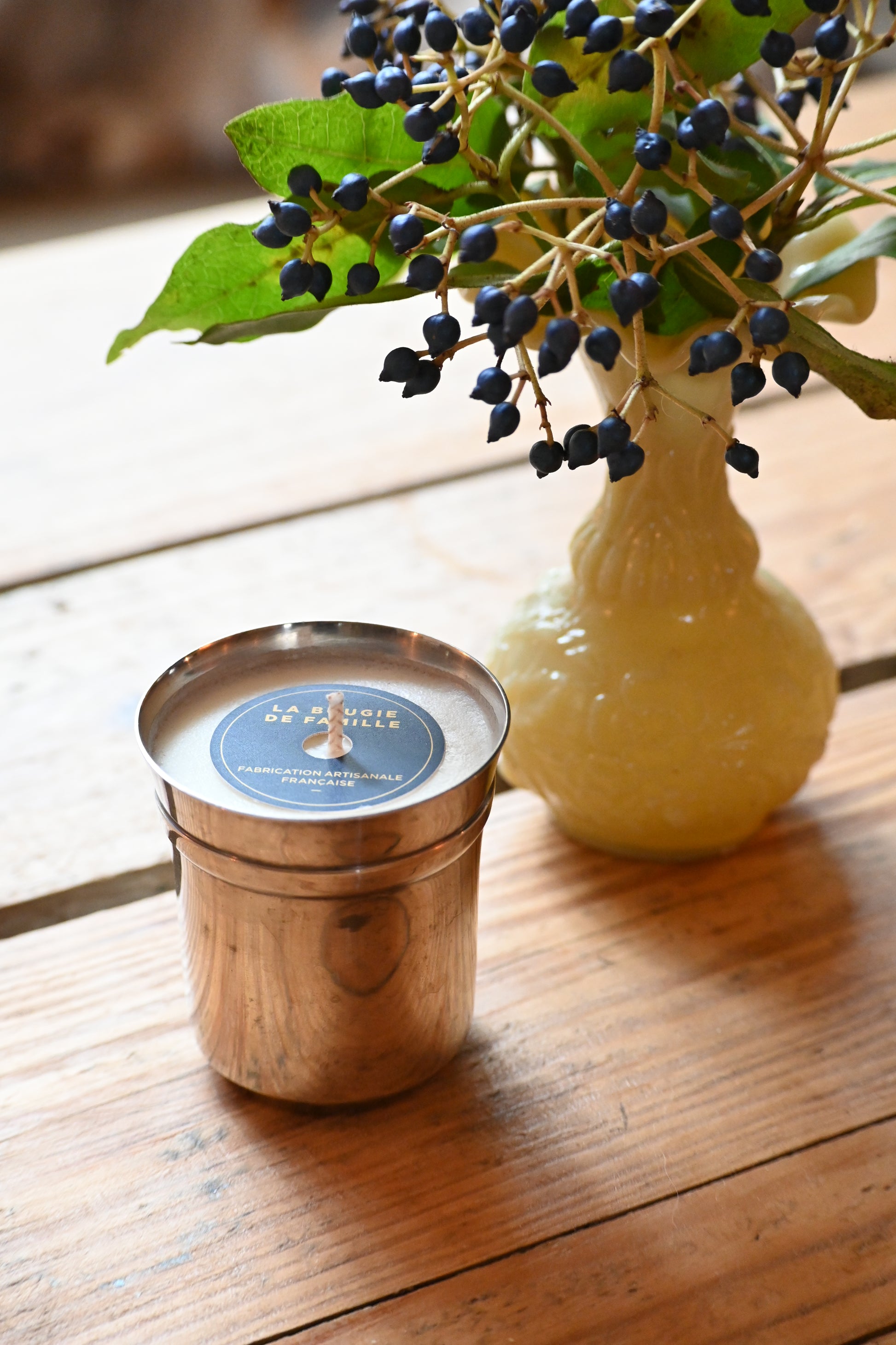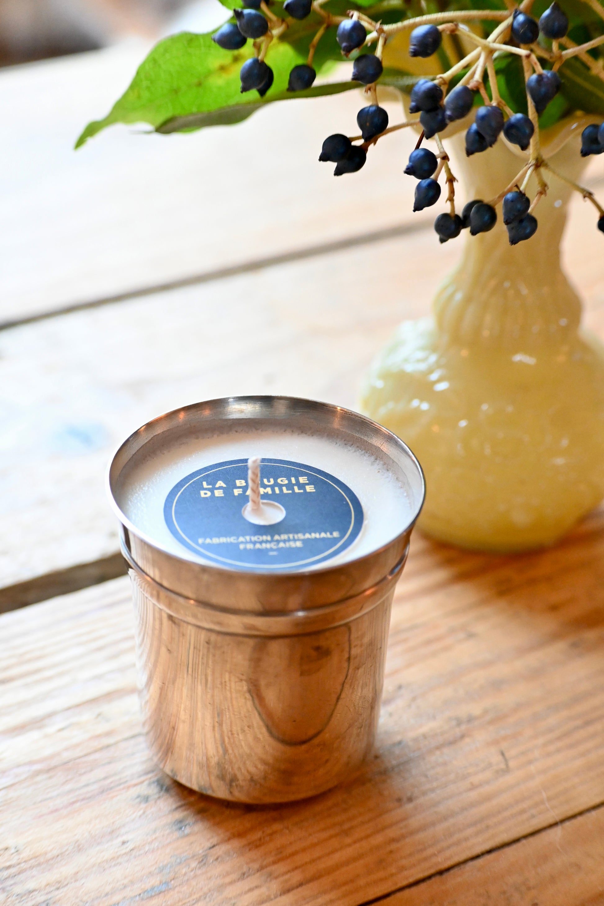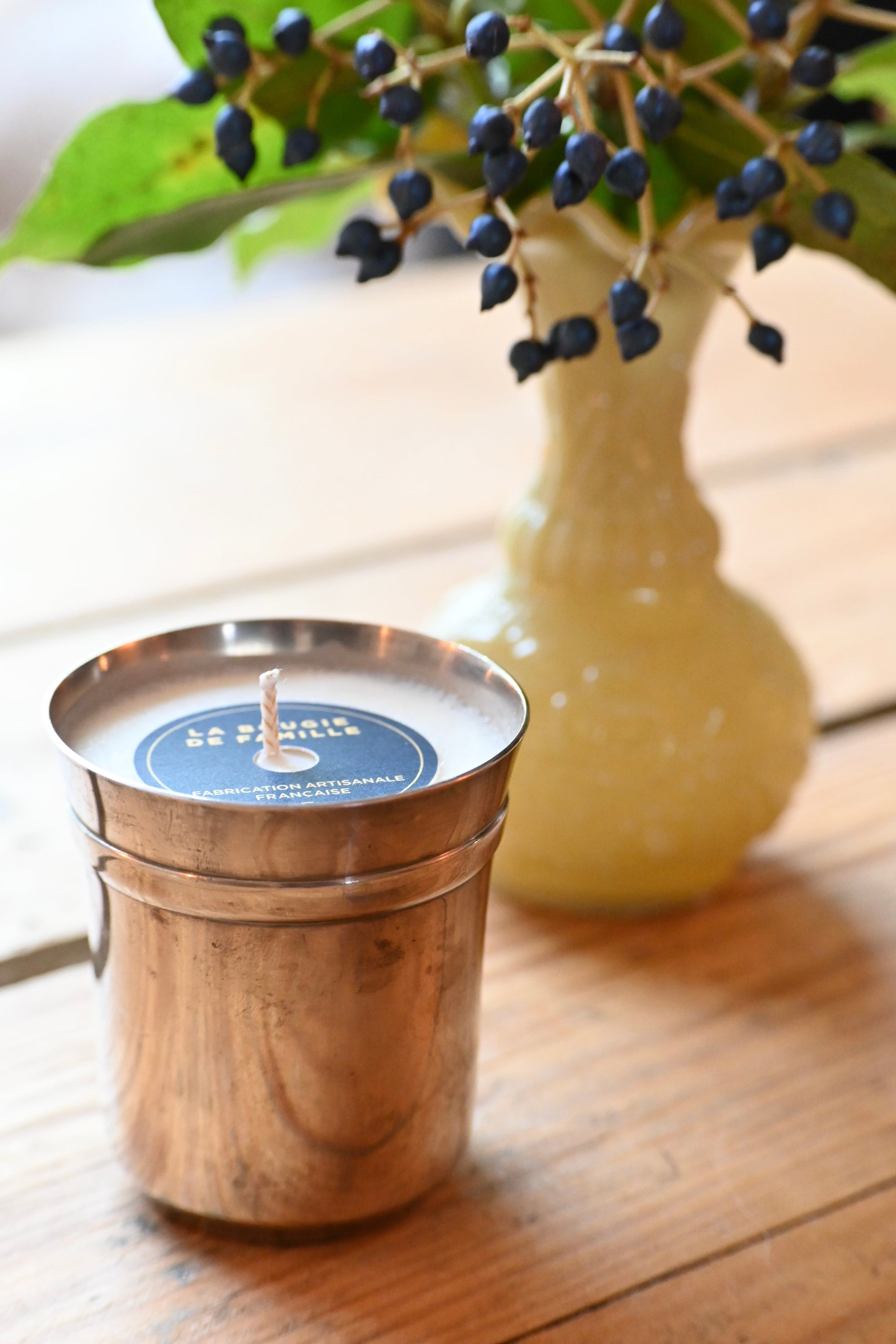 Bougie coulée dans une timbale en métal argenté. Souvenirs de présents de l'enfance. Un cadeau idéal pour une naissance à venir.