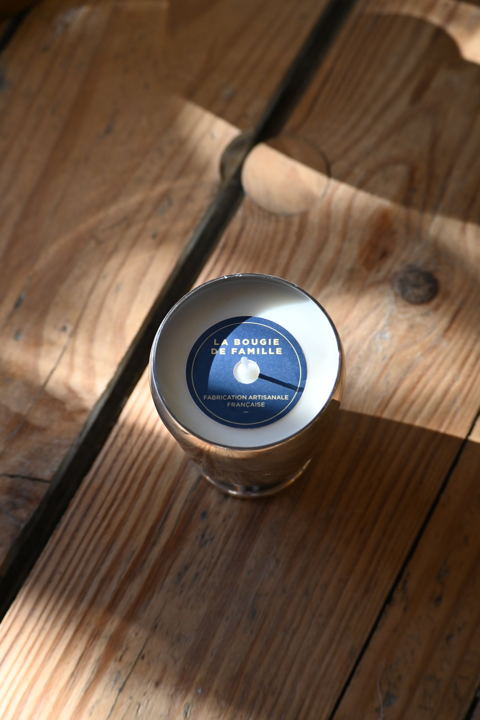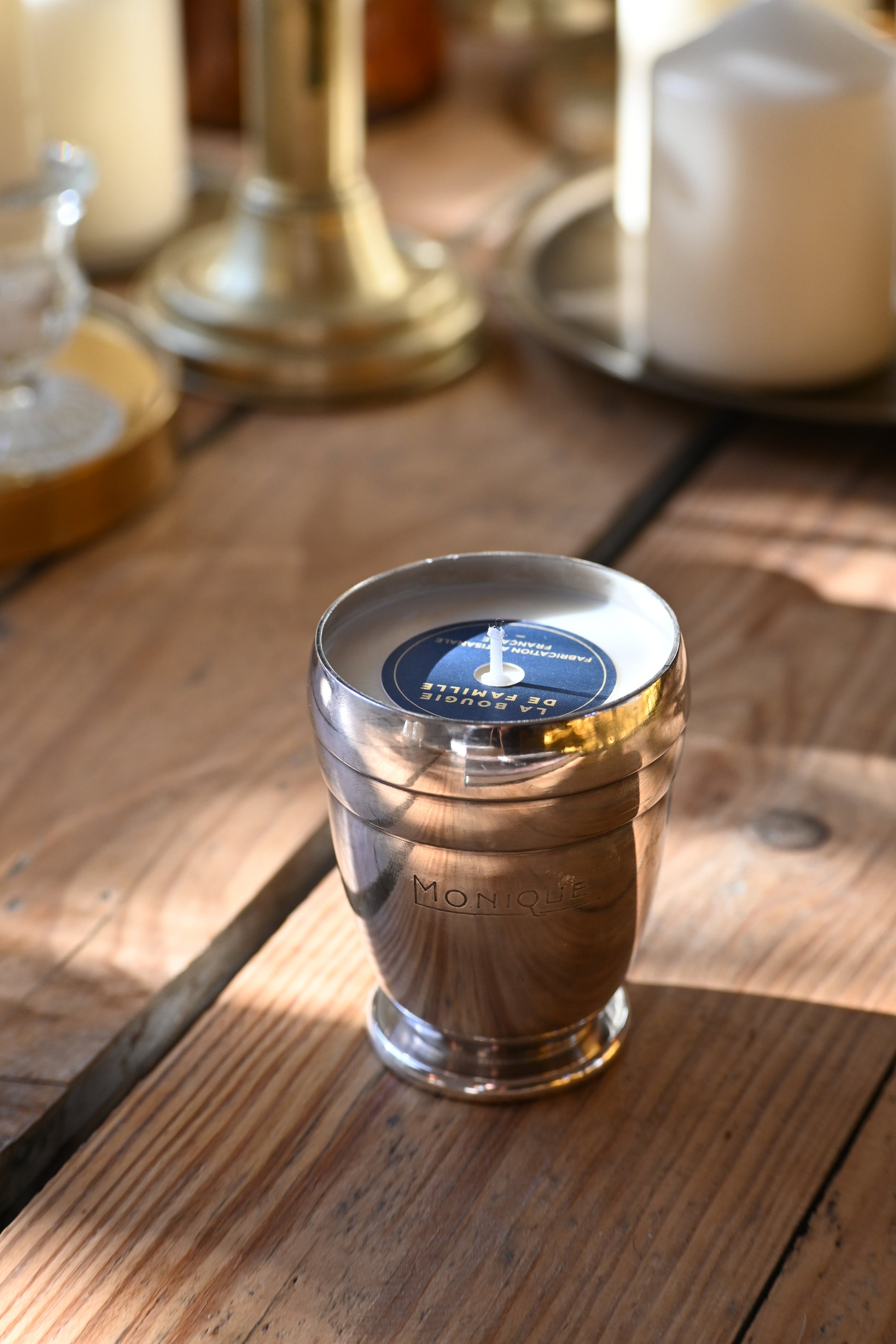 Bougie coulée dans une timbale en métal argenté. Souvenirs de présents de l'enfance. Un cadeau idéal pour une naissance à venir.