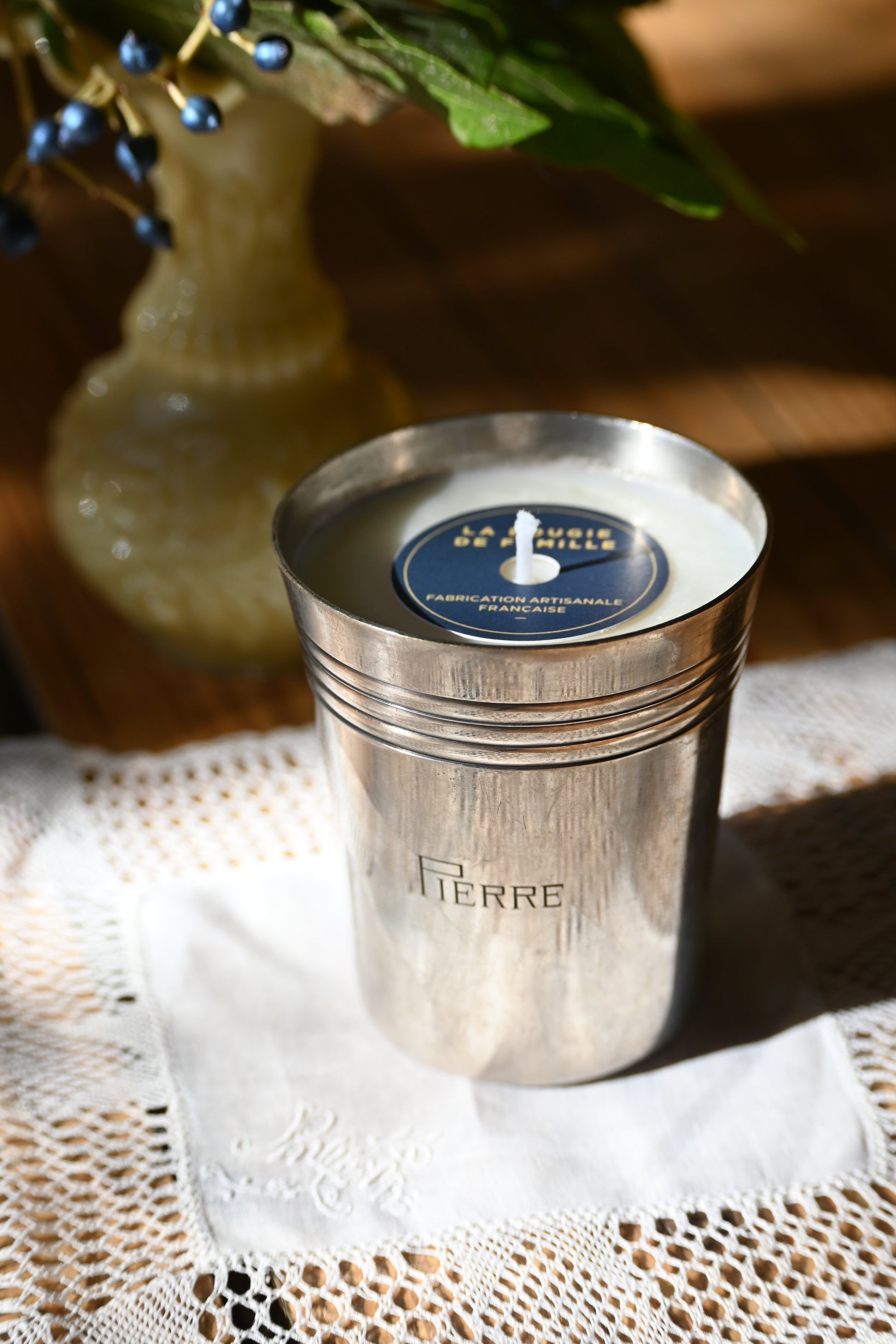 Bougie coulée dans une timbale en métal argenté. Souvenirs de présents de l'enfance. Un cadeau idéal pour une naissance à venir.