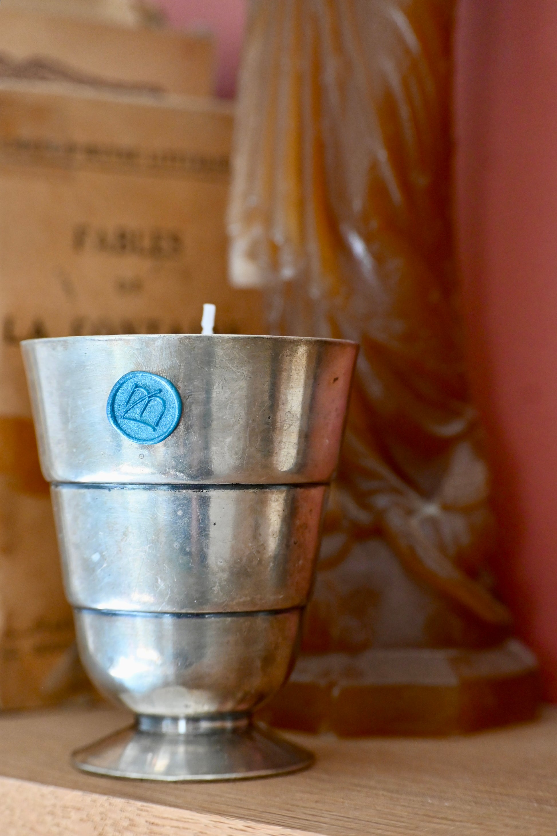 Bougie coulée dans une timbale en métal argenté. Souvenirs de présents de l'enfance. Un cadeau idéal pour une naissance à venir.