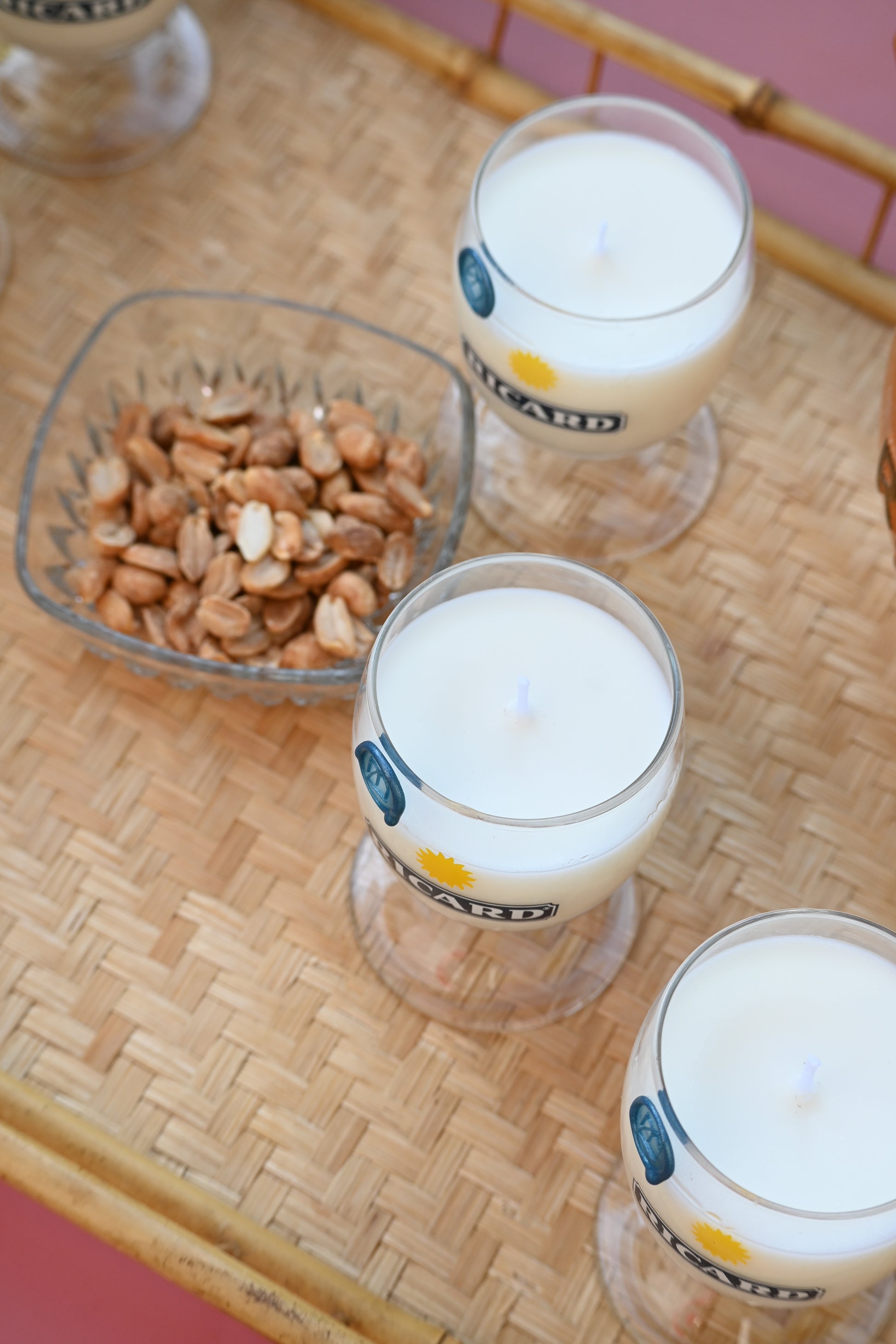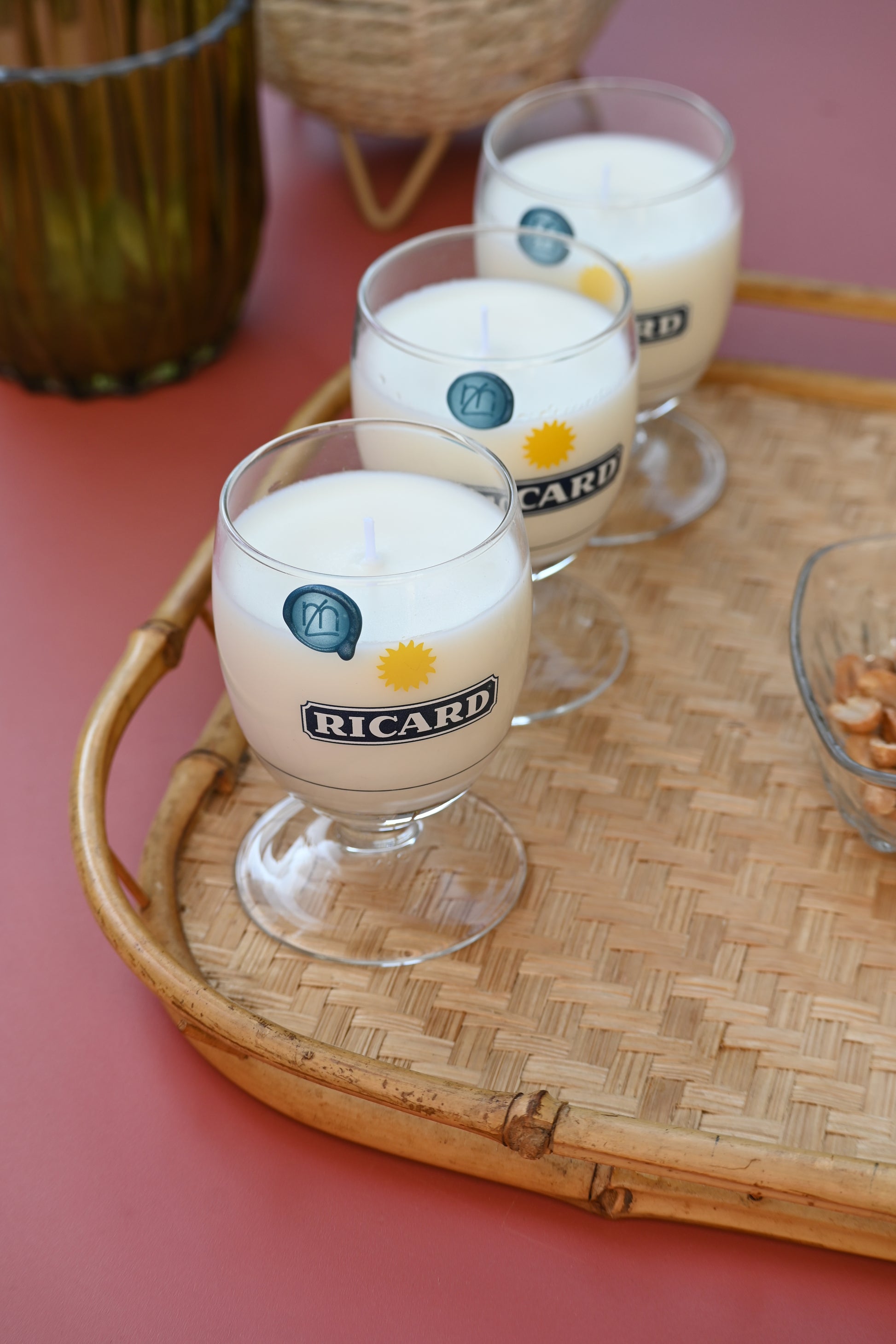 Bougie coulée dans un verre Ricard. Une pièce qui ravivera les aficionados du célèbre apéritif du sud au doux parfum d’anis. (Imprimé aléatoire ou sur demande).