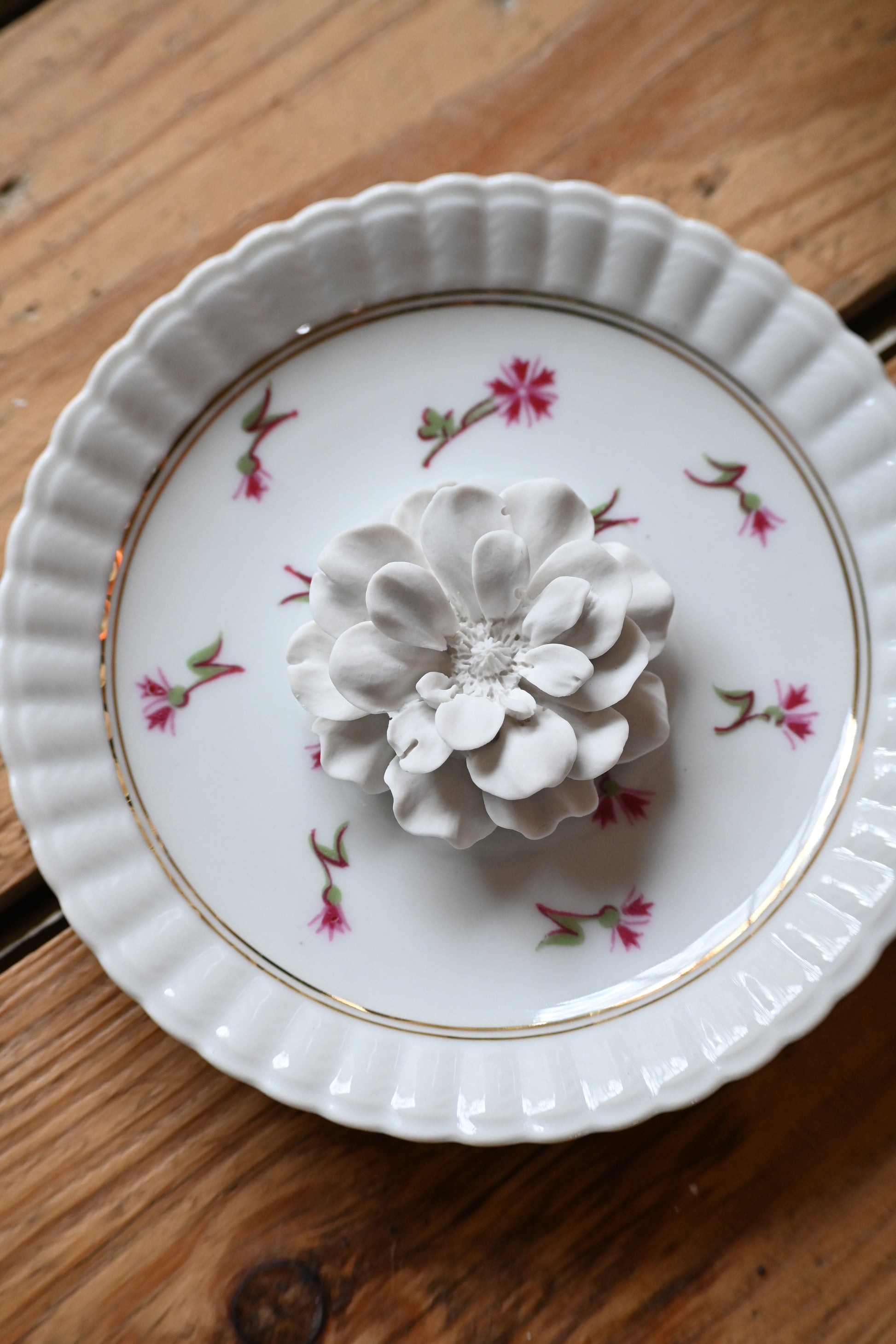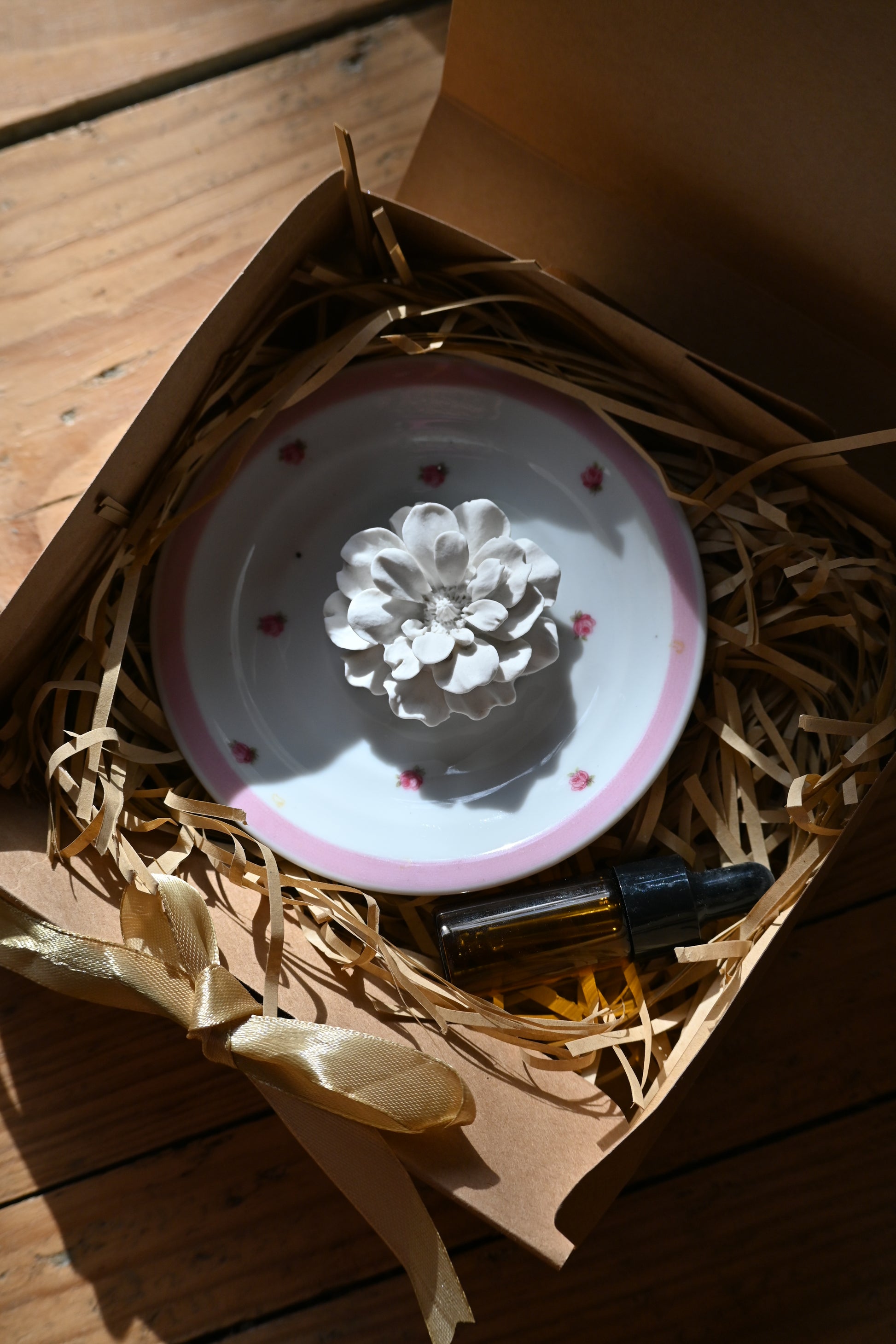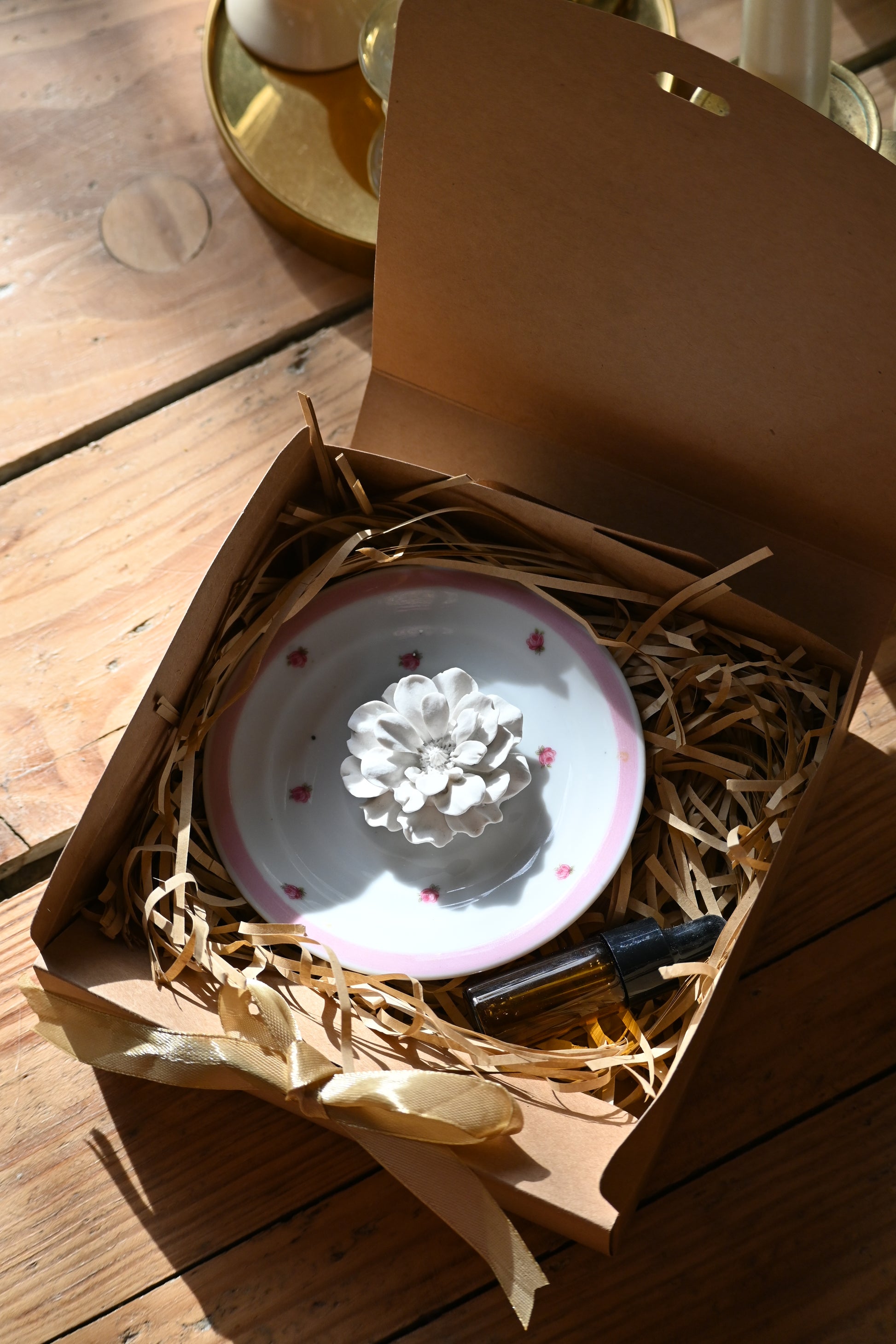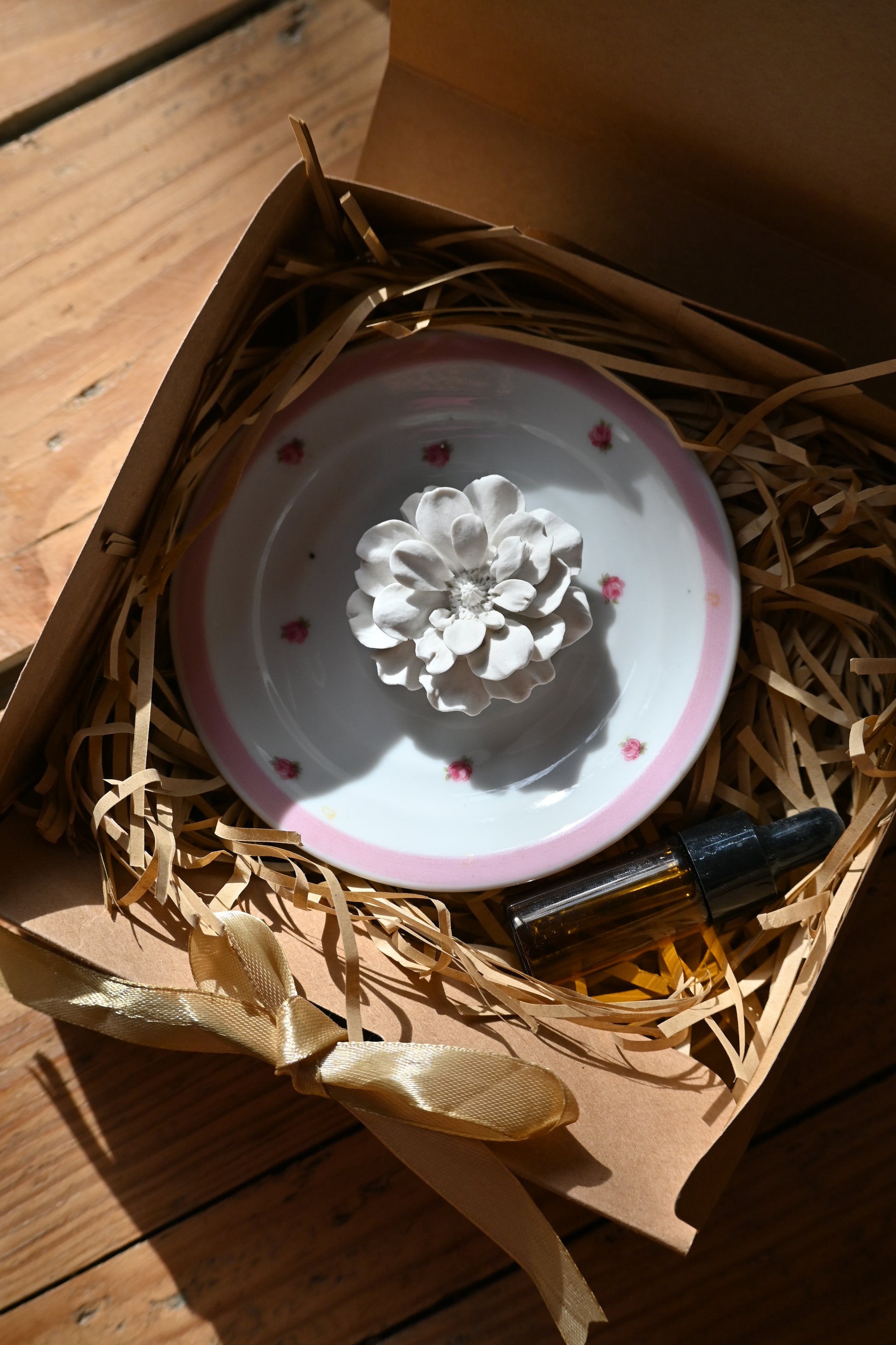 Le coffret comprend : une fleur, un flacon de parfum de 10 ml et une coupelle en porcelaine offerte (modèle aléatoire)